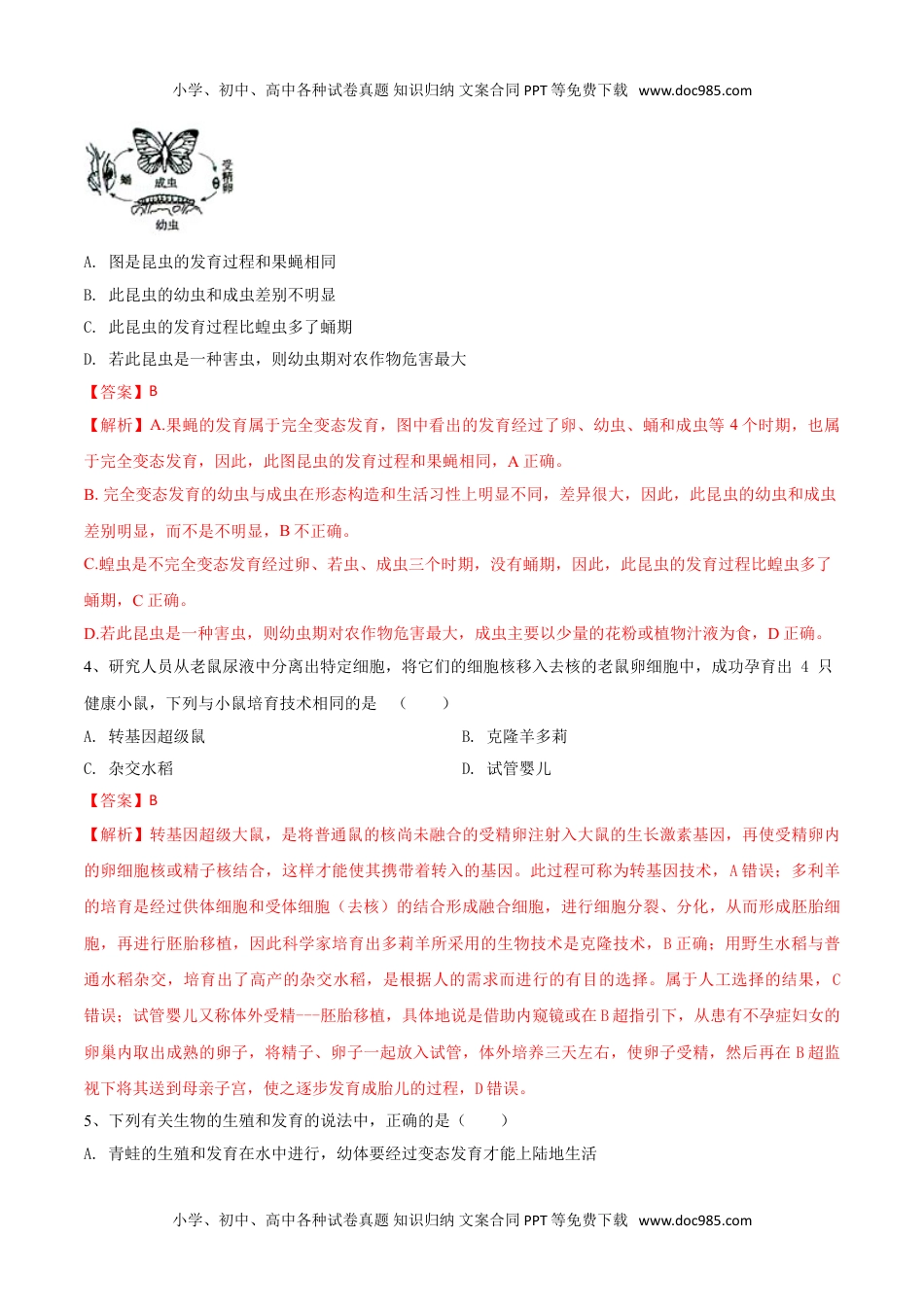 小学、初中、高中各种试卷真题知识归纳文案合同PPT等免费下载www.doc985.com学易金卷:2020-2021学年八年级生物下学期期中测试卷(人教版)02(考试时间:60分钟试卷满分:100分)一、选择题1、在下图所示植物的生殖方式中,属于无性生殖的是A.abcB.acdC.abdD.bcd【答案】B【解析】a是嫁接,c是扦插,d是压条,都没有经过两性生殖细胞的结合,因此属于无性生殖。b种子繁殖,种子的胚是由受精卵发育形成的,因此属于有性生殖。2、“梁上有双燕,翩翩雄与雌...青虫不易捕,黄口无饱期……”白居易这首脍炙人口的诗句,反映了生物繁衍后代的本能。下列有关燕子生殖和发育的叙述,正确的是()A.燕子发育的过程主要是小燕子破壳而出,属于变态发育B.燕子繁育后代的过程包括求偶、交配、筑巢、产卵、孵卵和育雏等一系列行为C.燕子产的卵就是一个卵细胞D.燕子卵的结构比较复杂和完善,其中能发育成雏鸟的结构主要是卵黄和卵白【答案】B【解析】A.家燕发育的过程主要是小燕子破壳而出,小燕子和母体形态结构差别不大,不属于变态发育,A错误。B.家燕在生殖发育过程中具有求偶、交配、产卵、筑巢、孵卵、育雏等繁殖行为,B正确。C.鸟卵结构包括卵壳,卵壳膜,气室,系带,卵白,卵黄膜,卵黄和胚盘,胚盘内含有遗传物质。卵细胞包括卵黄、胚盘、卵黄膜,所以家燕产的卵不是一个卵细胞,C错误。D.家燕的卵中,胚盘含遗传物质,是发育成雏鸟的结构,D错误。3、如图表示某种昆虫的发育过程,下列叙述不正确的是()小学、初中、高中各种试卷真题知识归纳文案合同PPT等免费下载www.doc985.com小学、初中、高中各种试卷真题知识归纳文案合同PPT等免费下载www.doc985.comA.图是昆虫的发育过程和果蝇相同B.此昆虫的幼虫和成虫差别不明显C.此昆虫的发育过程比蝗虫多了蛹期D.若此昆虫是一种害虫,则幼虫期对农作物危害最大【答案】B【解析】A.果蝇的发育属于完全变态发育,图中看出的发育经过了卵、幼虫、蛹和成虫等4个时期,也属于完全变态发育,因此,此图昆虫的发育过程和果蝇相同,A正确。B.完全变态发育的幼虫与成虫在形态构造和生活习性上明显不同,差异很大,因此,此昆虫的幼虫和成虫差别明显,而不是不明显,B不正确。C.蝗虫是不完全变态发育经过卵、若虫、成虫三个时期,没有蛹期,因此,此昆虫的发育过程比蝗虫多了蛹期,C正确。D.若此昆虫是一种害虫,则幼虫期对农作物危害最大,成虫主要以少量的花粉或植物汁液为食,D正确。4、研究人员从老鼠尿液中分离出特定细胞,将它们的细胞核移入去核的老鼠卵细胞中,成功孕育出4只健康小鼠,下列与小鼠培育技术相同的是()A.转基因超级鼠B.克隆羊多莉C.杂交水稻D.试管婴儿【答案】B【解析】转基因超级大鼠,是将普通鼠的核尚未融合的受精卵注射入大鼠的生长激素基因,再使受精卵内的卵细胞核或精子核结合,这样才能使其携带着转入的基因。此过程可称为转基因技术,A错误;多利羊的培育是经过供体细胞和受体细胞(去核)的结合形成融合细胞,进行细胞分裂、分化,从而形成胚胎细胞,再进行胚胎移植,因此科学家培育出多莉羊所采用的生物技术是克隆技术,B正确;用野生水稻与普通水稻杂交,培育出了高产的杂交水稻,是根据人的需求而进行的有目的选择。属于人工选择的结果,C错误;试管婴儿又称体外受精---胚胎移植,具体地说是借助内窥镜或在B超指引下,从患有不孕症妇女的卵巢内取出成熟的卵子,将精子、卵子一起放入试管,体外培养三天左右,使卵子受精,然后再在B超监视下将其送到母亲子宫,使之逐步发育成胎儿的过程,D错误。5、下列有关生物的生殖和发育的说法中,正确的是()A.青蛙的生殖和发育在水中进行,幼体要经过变态发育才能上陆地生活小学、初中、高中各种试卷真题知识归纳文案合同PPT等免费下载www.doc985.com小学、初中、高中各种试卷真题知识归纳文案合同PPT等免费下载www.doc985.comB.家蚕、蜜蜂、蝗虫的发育都要经过卵→幼虫→蛹→成虫四个时期C.嫁接、植物组织培养、试管婴儿、克隆羊均属于无性生殖D.鸡卵的卵黄表面有一盘状小白点,说明卵已受精【答案】A【解析】A.青蛙的发育过程是受精卵→蝌蚪→幼蛙→成蛙四个阶段,幼体...