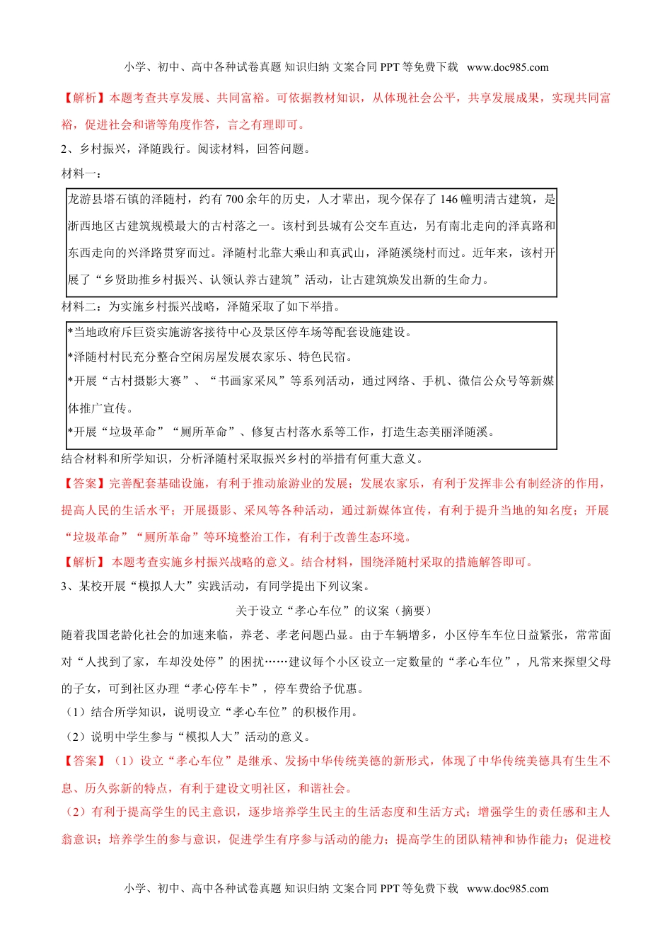 小学、初中、高中各种试卷真题知识归纳文案合同PPT等免费下载www.doc985.com专题12简答题之现实意义类【类型题特点】现实意义类简答题是近年来道德与法治中考的新增加的题型,多用“意义”“作用”“必要性”等关键词来设问。这类简答题的答案无法直接用课本上的内容来回答,需要用“有利于”对答案进行重组,难度较大,但只要把握住回答思路,学生也能轻松答题。运用“有利于”来组织意义时,可以从多角度来分析材料中行为或措施的意义,这样才能分析出行为或措施的全面性。例:回顾初中生活,小凡对暑假期间学校组织的“学农”社会实践活动印象最深。小凡在日记中写道:7月14日至20日,在学校的统一组织下,我们背上铺盖、提着用品来到位于攸县罗家坪的学校社会实践基地,开展为期一周的下乡“学农”实践活动。炎炎烈日下,我们戴上草帽、挽起裤脚,在田里插秧,在泥塘中捉鱼,在菜地里摘辣椒…我们自己洗衣服、铺床单。一周下来,累是累点,但是学到了很多课本上学不到的常识。临走前,我们亲自下厨给老乡做了一顿感恩饭,氛围特别温馨。结合上述材料,请你谈谈学校组织开展“学农”社会实践活动的必要性。【答案】①是学校贯彻德智体美劳全面发展的教育方针,加强劳动教育的需要;②有利于学生了解农村,培养对劳动人民的感情;③有利于培养学生吃苦耐劳的精神,磨砺意志;④有利于学生学习和掌握劳动技能,培养实践能力。【解析】本题考查参加“学农”社会实践活动的意义,结合教材知识,从加强劳动教育的需要,培养良好的劳动行为习惯,有利于学生了解农村,培养对劳动人民的感情,能提高实践能力、适应社会等方面作答即可。针对训练:1、党和政府非常重视减贫。为了让贫困居民参与共享改革发展成果,实现建成全面小康社会的目标,自2013年提出精准扶贫以来,不断加大扶贫攻坚力度,增加脱贫攻坚投入,创新脱贫攻坚举措,实施就业扶贫、搬迁扶贫、教育扶贫、社保扶贫,脱贫攻坚取得显著成效。2019年“两会”期间,习近平总书记强调脱贫攻坚必须坚持“两不愁三保障”,不能为求进度降低标准,要让贫困居民脱真贫、真脱贫。正义是美好社会应有的价值,是社会主义法治精神的体现。脱贫是正义的事情。请运用所学知识分析说明贫困居民脱贫的正义性。【答案】①脱贫保障贫困人口权利的实现,体现社会公平;②脱贫有利于社会和谐;③脱贫有利于实现全体人民共享改革成果,体现了人们对关好社会的期待和追求。(学生如“有利于建成全面小康社会”、“有利于实现共同富裕”或其他答案,言之有理可酌情给分。)小学、初中、高中各种试卷真题知识归纳文案合同PPT等免费下载www.doc985.com小学、初中、高中各种试卷真题知识归纳文案合同PPT等免费下载www.doc985.com【解析】本题考查共享发展、共同富裕。可依据教材知识,从体现社会公平,共享发展成果,实现共同富裕,促进社会和谐等角度作答,言之有理即可。2、乡村振兴,泽随践行。阅读材料,回答问题。材料一:龙游县塔石镇的泽随村,约有700余年的历史,人才辈出,现今保存了146幢明清古建筑,是浙西地区古建筑规模最大的古村落之一。该村到县城有公交车直达,另有南北走向的泽真路和东西走向的兴泽路贯穿而过。泽随村北靠大乘山和真武山,泽随溪绕村而过。近年来,该村开展了“乡贤助推乡村振兴、认领认养古建筑”活动,让古建筑焕发出新的生命力。材料二:为实施乡村振兴战略,泽随采取了如下举措。*当地政府斥巨资实施游客接待中心及景区停车场等配套设施建设。*泽随村村民充分整合空闲房屋发展农家乐、特色民宿。*开展“古村摄影大赛”、“书画家采风”等系列活动,通过网络、手机、微信公众号等新媒体推广宣传。*开展“垃圾革命”“厕所革命”、修复古村落水系等工作,打造生态美丽泽随溪。结合材料和所学知识,分析泽随村采取振兴乡村的举措有何重大意义。【答案】完善配套基础设施,有利于推动旅游业的发展;发展农家乐,有利于发挥非公有制经济的作用,提高人民的生活水平;开展摄影、采风等各种活动,通过新媒体宣传,有利于提升当地的知名度;开展“垃圾革命”“厕所革命”等环境整治工作,有利于改善生态环境。【解析】本...
