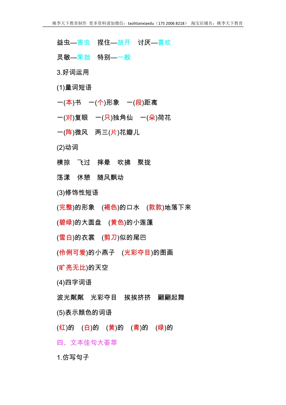 桃李天下教育制作更多资料请加微信:taolitianxiaedu(17520068218)淘宝店铺名:桃李天下教育一、汉语拼音我最棒1.易错音融(róng)化崇(chóng)高沾湿(zhānshī)疲倦(juàn)姿势(zīshì)随(suí)着鸳鸯(yāng)记录(lù)款款(kuǎn)丝绸(chóu)益(yì)虫2.多音字正è(正在)ē(正月)尽ì(尽头)ǐ(尽管)杆ā(旗杆ǎ枪杆散ǎ(散文)à(散步)挨ā(挨着)á(挨打)骨ǔ(骨头)ū(花骨朵儿)晕ū(晕头转向)ù(晕车)二、精品生字归类屋1.易考字花瓣露水仿佛姿势聚拢芦芽小溪鸳鸯随便吹拂形成横掠偶尔沾了一下飞倦纤细几痕桃李天下教育制作更多资料请加微信:taolitianxiaedu(17520068218)淘宝店铺名:桃李天下教育2.形近字组词录(记录)绿(绿色)凡(凡人)几(几个)膜(膜翅)模(模样)崇(崇高)宗(祖宗)泛(广泛)乏(缺乏)减(减少)咸(咸水)瓣(花瓣)辨(辨别)佛(仿佛)拂(吹拂)掠(掠过)惊(吃惊)偶(偶尔)寓(寓言)倦(疲倦)卷(试卷)纤(纤细)迁(迁走)三、精品词语大盘点1.近义词乌黑—黝黑轻快—轻巧活泼—开朗聚拢—聚集伶俐—聪明纤细—纤弱光彩夺目—光辉灿烂清早—早晨饱胀—饱满本领—本事仿佛—好像挨挨挤挤—密密麻麻琢磨—思考灵敏—机敏曾经—以前如果—假如款款—慢慢收拢—合拢2.反义词乌黑—雪白轻快—沉重活泼—严肃横—竖偶尔—经常高—低清早—傍晚饱胀—干瘪破裂—完整雪白—乌黑挨挨挤挤—稀稀拉拉漂亮—丑陋桃李天下教育制作更多资料请加微信:taolitianxiaedu(17520068218)淘宝店铺名:桃李天下教育益虫—害虫捏住—放开讨厌—喜欢灵敏—笨拙特别—一般3.好词运用(1)量词短语一(本)书一(个)形象一(段)距离一(对)复眼一(只)独角仙一(朵)荷花一(阵)微风两三(片)花瓣儿(2)动词横掠飞过摔晕吹拂聚拢荡漾休憩随风飘动(3)修饰性短语(完整)的形象(褐色)的口水(款款)地落下来(碧绿)的大圆盘(黄色)的小莲蓬(雪白)的衣裳(剪刀)似的尾巴(伶俐可爱)的小燕子(光彩夺目)的图画(旷亮无比)的天空(4)四字词语波光粼粼光彩夺目挨挨挤挤翩翩起舞(5)表示颜色的词语(红)的(白)的(黄)的(青)的(绿)的四、文本佳句大荟萃1.仿写句子桃李天下教育制作更多资料请加微信:taolitianxiaedu(17520068218)淘宝店铺名:桃李天下教育(1)排比句:有的..才展开两三片花瓣儿。有的..花瓣儿全展开了,露出嫩黄色的小莲蓬。有的..还是花骨朵儿,看起来饱胀得马上要破裂似的。(《荷花》)仿写:下课了,同学们到操场上玩耍。有的踢球,有的跳绳,有的跑步。(2)比喻句:荷叶挨挨挤挤的,像一个个碧绿的大圆盘。(《荷花》)一身乌黑的羽毛,一双剪刀似的尾巴,一对轻快有力的翅膀,凑成了那样可爱的活泼的小燕子。(《燕子》)仿写:透明的水珠好像一个个宝石。绿油油的草地像一块绿色的地毯。2.改写句子(1)多么有趣的一幅图画呀!改成反问句:这难道不是很有趣的一幅图画吗?(2)还是不要!那成什么样子!改成陈述句:还是不要,那不成样子。(3)清早,我到公园去玩,一进门就闻到一阵清香。我赶紧往荷花池边跑去。用关联词合并成一句话:清早,我到公园去玩,因为一进门就闻到一阵清香。所以我赶紧往荷花池边跑去。3.名句积累描写春天的诗句(1)春宵一刻值千金,花有清香月有阴。(2)人面不知何处去,桃花依旧笑春风。桃李天下教育制作更多资料请加微信:taolitianxiaedu(17520068218)淘宝店铺名:桃李天下教育(3)夜月一帘幽梦,春风十里柔情。(4)沾衣欲湿杏花雨,吹面不寒杨柳风。(5)云想衣裳花想容,春风拂槛露华浓。五、课文内容串串烧大自然是那样美妙,像一首诗,又像一幅画。诗里有泥融飞燕子,沙暖睡鸳鸯的春光无限;也有竹外桃花三两枝,春江水暖鸭先知的浪漫情怀。画里有一身乌黑的羽毛,一双剪刀似的尾巴,一对轻快有力的翅膀的活泼的小燕子;也有出淤泥而不染,濯清涟而不妖的荷花,一朵有一朵的姿势,真是一大幅活的画;画中还有有复眼的蜻蜓、蜜蜂等昆虫,也有花大姐、独角仙和蚂蚱。让我们一起到大自然中去寻找美好的童年吧!六、课外阅读来推荐推荐书目:法布尔《昆虫记》推荐理由:该作品是一部概括昆虫的种类、特征、习性和婚习的昆虫生物学著作,记录了昆虫真实的生活,表述的是...