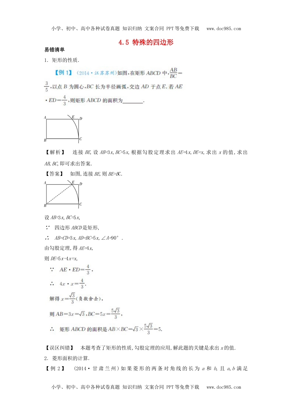 小学、初中、高中各种试卷真题知识归纳文案合同PPT等免费下载www.doc985.com4.5特殊的四边形易错清单1.矩形的性质.【解析】连接BE,设AB=3x,BC=5x,根据勾股定理求出AE=4x,DE=x,求出x的值,求出AB,BC,即可求出答案.【答案】如图,连接BE,则BE=BC.设AB=3x,BC=5x, 四边形ABCD是矩形,∴AB=CD=3x,AD=BC=5x,∠A=90°.由勾股定理,得AE=4x,则DE=5x-4x=x,【误区纠错】本题考查了矩形的性质,勾股定理的应用,解此题的关键是求出x的值.2.菱形面积的计算.【例2】(2014·甘肃兰州)如果菱形的两条对角线的长为a和b,且a,b满足小学、初中、高中各种试卷真题知识归纳文案合同PPT等免费下载www.doc985.com小学、初中、高中各种试卷真题知识归纳文案合同PPT等免费下载www.doc985.com那么菱形的面积等于.【解析】根据非负数的性质列式求出a,b,再根据菱形的面积等于对角线乘积的一半列式计算即可得解.【答案】由题意,得a-1=0,b-4=0,解得a=1,b=4, 菱形的两条对角线的长为a和b,∴菱形的面积【误区纠错】本题考查了非负数的性质,菱形的性质,主要利用了菱形的面积等于对角线乘积的一半.3.正方形的性质.【例3】(2014·广东梅州)如图,在正方形ABCD中,E是AB上一点,F是AD延长线上一点,且DF=BE.(1)求证:CE=CF;(2)若点G在AD上,且∠GCE=45°,则GE=BE+GD成立吗?为什么?【解析】(1)由DF=BE,四边形ABCD为正方形可证△CEB≌△CFD,从而证出CE=CF.(2)由(1)得,CE=CF,∠BCE+∠ECD=∠DCF+∠ECD即∠ECF=∠BCD=90°.又∠GCE=45°,所以可得∠GCE=∠GCF,故可证得△ECG≌△FCG,即EG=FG=GD+DF.又因为DF=BE,所以可证出GE=BE+GD成立.【答案】(1)在正方形ABCD中, BC=CD,∠B=∠CDF,BE=DF,∴△CBE≌△CDF(SAS).∴CE=CF.(2)GE=BE+GD成立.理由如下: 由(1),得△CBE≌△CDF,∴∠BCE=∠DCF.∴∠BCE+∠ECD=∠DCF+∠ECD,即∠ECF=∠BCD=90°,又∠GCE=45°,小学、初中、高中各种试卷真题知识归纳文案合同PPT等免费下载www.doc985.com小学、初中、高中各种试卷真题知识归纳文案合同PPT等免费下载www.doc985.com∴∠GCF=∠GCE=45°. CE=CF,∠GCE=∠GCF,GC=GC,∴△ECG≌△FCG(SAS).∴GE=GF.∴GE=DF+GD=BE+GD.【误区纠错】本题主要考查证两条线段相等往往转化为证明这两条线段所在三角形全等的思想,在第二问中也是考查了通过全等找出和GE相等的线段,从而证出关系是不是成立.名师点拨重点:特殊平行四边形的性质和判定的应用.难点:以特殊平行四边形为对象,进行图形变换(如旋转、翻折等),以及将图形问题与函数、方程综合应用的问题.提分策略1.在特殊平行四边形的背景中,探究与三角形相关的问题.以特殊平行四边形为原型,通过图形变换,构造出特殊三角形,提出与三角形相关的问题,解决此类问题的关键是适时添加辅助线,将四边形的问题转化为三角形的问题.【例1】如图,将矩形ABCD的四个角向内折起,恰好拼成一个无缝隙无重叠的四边形EFGH,EH=12厘米,EF=16厘米,则边AD的长是().A.12厘米B.16厘米C.20厘米D.28厘米【解析】本题考查的是翻折变换及勾股定理、全等三角形的判定与性质,解答此题的关键是作出辅助线,构造出全等三角形,再根据直角三角形及全等三角形的性质解答.我们先求出△EFH是直角三角形,再根据勾股定理求出FH=20,再利用全等三角形的性质解答即可.【答案】设斜线上两个点分别为P,Q,如图. 点P是点A对折过去的,小学、初中、高中各种试卷真题知识归纳文案合同PPT等免费下载www.doc985.com小学、初中、高中各种试卷真题知识归纳文案合同PPT等免费下载www.doc985.com∴∠EPH为直角,△AEH≌△PEH.∴∠HEA=∠HEP.同理∠PEF=∠BEF.∴∠PEH+∠PEF=90°.∴四边形EFGH是矩形.∴△DHG≌△BFE,△HEF是直角三角形.∴BF=DH=PF. AH=HP,∴AD=HF. EH=12cm,EF=16cm,∴FH===20(cm).∴FH=AD=20cm.故选C.2.以三角形为基本图形,通过图形变换构造四边形问题.以三角形为起点,经历图形变换形成较为复杂的图形,提出与四边形相关的问题,解决此类问题的关键是明确四边形的形成过程,从而根据四边形的边、角及对角线的特性去判定四边形的形状.【例2】如图,已知△ABC,按如下步骤作图:①分别以A,C为圆心,以大于AC的长为半径在AC两边作弧,交于两点M,N;②连接MN,分别交AB,AC于点D,O;③...