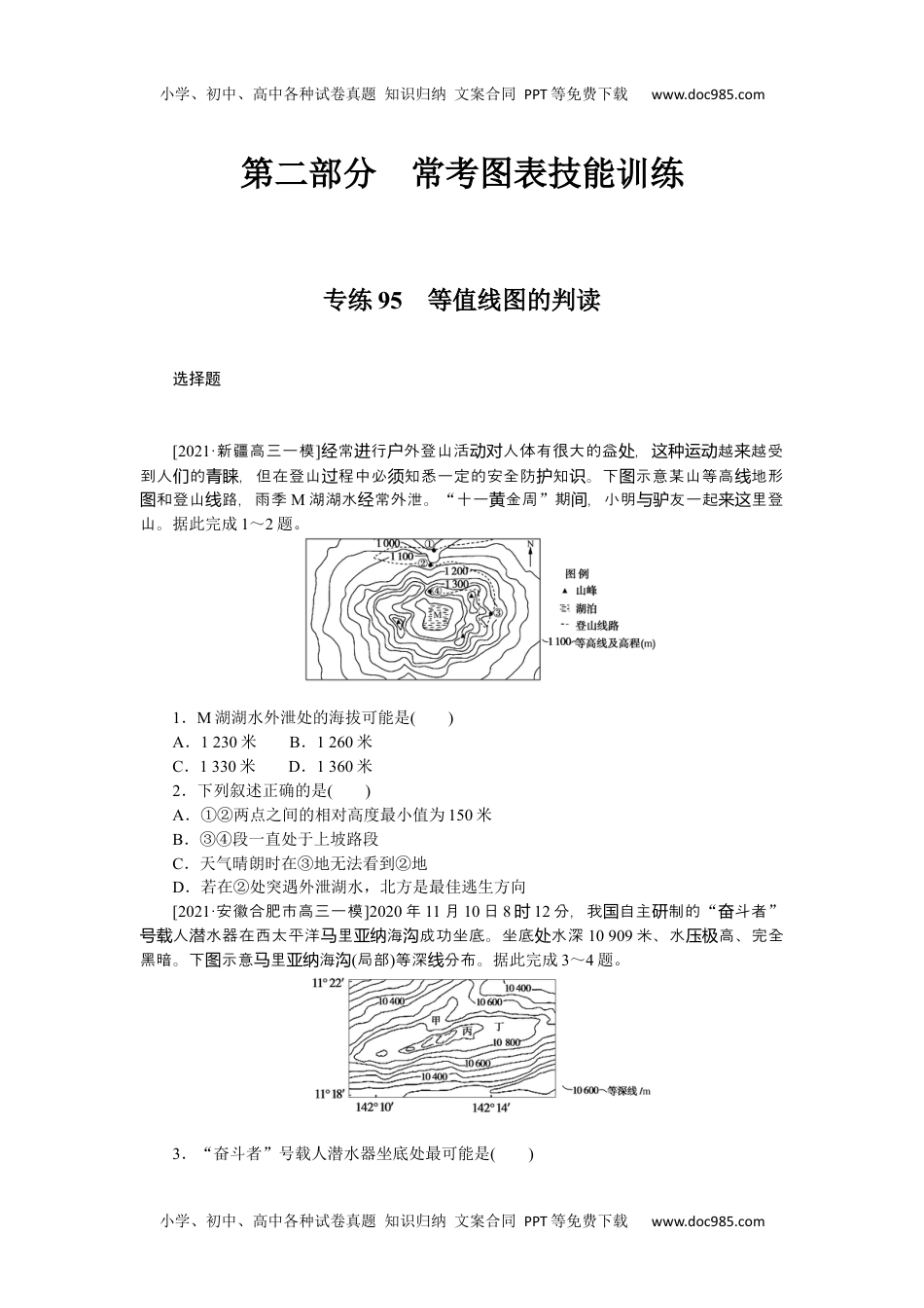 小学、初中、高中各种试卷真题知识归纳文案合同PPT等免费下载www.doc985.com小学、初中、高中各种试卷真题知识归纳文案合同PPT等免费下载www.doc985.com第二部分常考图表技能训练专练95等值线图的判读选择题[2021·新疆高三一模]常行外登山活人体有很大的益,越越受经进户动对处这种运动来到人的,但在登山程中必知悉一定的安全防知。下示意某山等高地形们青睐过须护识图线和登山路,雨季图线M湖湖水常外泄。经“十一金周黄”期,小明友一起里登间与驴来这山。据此完成1~2题。1.M湖湖水外泄处的海拔可能是()A.1230米B.1260米C.1330米D.1360米2.下列叙述正确的是()A.①②两点之间的相对高度最小值为150米B.③④段一直处于上坡路段C.天气晴朗时在③地无法看到②地D.若在②处突遇外泄湖水,北方是最佳逃生方向[2021·安徽合肥市高三一模]2020年11月10日8时12分,我自主制的国研“斗者奋”人潜水器在西太平洋里海成功坐底。坐底水深号载马亚纳沟处10909米、水高、完全压极黑暗。下示意里海图马亚纳沟(局部)等深分布。线据此完成3~4题。3.“奋斗者”号载人潜水器坐底处最可能是()小学、初中、高中各种试卷真题知识归纳文案合同PPT等免费下载www.doc985.com小学、初中、高中各种试卷真题知识归纳文案合同PPT等免费下载www.doc985.comA.甲地B.乙地C.丙地D.丁地4.“奋斗者”号载人潜水器成功下潜万米海底彰显了我国()①装备制造的发展②生物工程的发展③通信技术的进步④材料科学的进步A.①②③B.①②④C.①③④D.②③④[2021·山西大附中高二月考]下图为“四幅域等高区线图”,其中表示地表等高实线线,表示地表以下某一完整地表面等高,且等高海拔比虚线层线线较a>b>c>d。读图,回答5~6题。5.图中可能有河流发育的是()A.①②B.③④C.②③D.①④6.图中地形及其成因与下图相似的是()A.①B.②C.③D.④[2021·田莆调研]在期水和水的情下,土壤于嫌,有机分解十分长积滞况处气状态质缓慢,而使有机的累超有机的分解,即形成有机土。下某湖泊沼地的有机从层积过质图为泽土壤物等厚度,质线图读图回答7~9题。7.该湖泊沼泽地()A.有机土厚度甲大于乙B.有机土厚度甲乙可能相同C.有机土厚度甲小于乙小学、初中、高中各种试卷真题知识归纳文案合同PPT等免费下载www.doc985.com小学、初中、高中各种试卷真题知识归纳文案合同PPT等免费下载www.doc985.comD.有机土厚度与水域的深度无关8.影响有机土成土的主要因素是()①气温②湿度③成土母质④人类活动A.①②B.①③C.②③D.②④9.下列地区中,有机土面积广大的是()A.三江源自然保护区B.黄土高原C.四川盆地D.长江中下游平原[2021·成都摸底]如世界某大洲局部地某月等图为区温线(位:单℃)分布示意,图据此完成10~11题。10.M地气温最有可能是()A.18℃B.22℃C.28℃D.32℃11.导致甲、乙两地气温差异的主导因素是()A.纬度位置B.海陆差异C.地形起伏D.洋流性质[2021·邢台月考]下中沿海夏季海水多年平均透明度等图为国值线(位:单m)分布。图读图,完成12~14题。12.甲处等值线向北凸出的原因是()A.海水深度变小小学、初中、高中各种试卷真题知识归纳文案合同PPT等免费下载www.doc985.com小学、初中、高中各种试卷真题知识归纳文案合同PPT等免费下载www.doc985.comB.水质较清的暖流流经C.海水深度变大D.水质较浑的寒流流经13.冬季时,乙处数值为1的等值线将会()A.向东移动B.向南移动C.向西移动D.向北移动14.从总体看,图示各海域中渤海透明度最低,其原因是()①表层浮游生物密度大②周围地区人类活动强度高,污染物排放量大③入海河流含沙量大④海域较封闭,污染物难扩散A.①②③B.①②④C.①③④D.②③④山地迎面的比背面高很多,使等突然形或突然密集,可几根等风气压风压线变将压线用一形起,之地形等。地形等在山的迎面冷空一条锯齿线联结来称为压线压线应画风与气,山脉平行,不能穿山脉。下我部某山地某季地形等侧与横图为国东节压线(位:百帕单)。图读图完成15~16题。15.山地迎风面气压比背风面气压高的原因是()A.迎风面气温高B.迎风面气流下沉C.迎风面暖空气堆积D.迎...