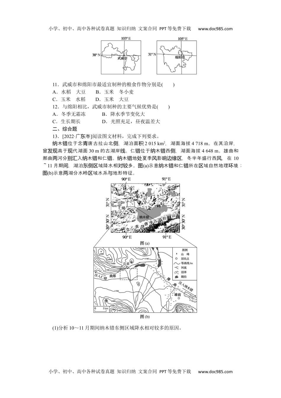 小学、初中、高中各种试卷真题知识归纳文案合同PPT等免费下载www.doc985.com小学、初中、高中各种试卷真题知识归纳文案合同PPT等免费下载www.doc985.com专练95中国地理(阶段练专练63~专练71)一、选择题[2022·泰安模拟]下我地河流分布示意。图为国两个区图读图,完成1~2题。1.甲、乙两地发展农业生产的优势气候资源分别是()A.光照、水源B.热量、光照C.降水、热量D.热量、水源2.下列关于甲乙两地地形特征的叙述,正确的是()A.甲地四周高、中间低B.乙地西高东低C.甲地西南高、东北低D.乙地“三山夹两盆”[2022·合肥模拟]下图为“我某域年降水量分布示意国区图(位:单mm)”。读图,回答3~5题。3.图中年降水量线说明()A.山脉以南较以北的降水季节变化小B.东部分布较稀疏,西部分布较密集C.数值自东向西减少主要受地形影响D.山脉南坡等值线向西凸,多地形雨4.图中山脉为重要的地理界线,下列界线与其大体一致的有()①暖温带与亚热带②湿润区与半湿润区③季风区与非季风区④外流区域与内流区域⑤游牧文化与农耕文化A.①②③B.②③⑤C.③④⑤D.②③④⑤5.图中农业分布区()A.位于宁夏平原,大力发展水稻种植业B.西部降水丰沛,不利于发展畜牧业C.引水灌溉,易出现土壤次生盐碱化D.应大面积植树造林,加强水土保持[2022·玉山月考]柴堡湖木市郊最大的淡水湖,距柴堡湖南窝为乌鲁齐窝东约5公里的湖是咸水湖。近年,柴堡湖不萎,下柴堡湖位置示意。盐来窝断缩图为窝图读图,完成6~7题。小学、初中、高中各种试卷真题知识归纳文案合同PPT等免费下载www.doc985.com小学、初中、高中各种试卷真题知识归纳文案合同PPT等免费下载www.doc985.com6.关于图中地理事物,叙述正确的是()A.公路修建中遇到的主要障碍是冻土和资金B.冬季是游客攀登图中山峰的最佳季节C.铁路属于第一亚欧大陆桥的一部分D.地下暗流自西北流向东南7.下列有助于恢复柴窝堡湖面积的合理措施有()①实施退耕还湖②减少引水灌溉③阻断地下暗流④加强人工降水A.①②B.①④C.②③D.②④[2022·安徽山普通高中八校考黄联]菁蓉距离成都市中心镇约30千米,曾是经传统产业工人的宿舍。布局的整,使园区产业调100多万平方米的宿舍和配套施置。楼设闲2015年初,成都市启动“天府创业”,吸引地者前安扎寨。截至目前,聚集计划当创业来营该镇了近900目的万余名客,一座充生机活力的客小初具形。合菁蓉个创业项创满创镇雏结镇地理位置,图完成8~10题。8.菁蓉镇曾经的主导产业类型为()A.资源密集型B.劳动密集型C.资金密集型D.原料密集型9.菁蓉镇转变为创客小镇主要依托于()A.地理位置B.高等院校C.产业基础D.交通便利10.2015年初,成都市“创业天府”计划中,最有利于推动创客创业的举措是()A.建立高等院校B.美化当地环境C.建立创新机制D.引进海外人才[2022·武威质检]制是指生已培育成功的作物品子,下面幅分我种产经种种两图别为国重要的家制基地武威市和市位置示意。国级种绵阳图据此完成11~12题。小学、初中、高中各种试卷真题知识归纳文案合同PPT等免费下载www.doc985.com小学、初中、高中各种试卷真题知识归纳文案合同PPT等免费下载www.doc985.com11.武威市和绵阳市最适宜制种的粮食作物分别是()A.水稻大豆B.玉米冬小麦C.玉米水稻D.玉米大豆12.与绵阳相比,武威市制种的主要气候优势是()A.冬季无霜冻B.降水季节变化大C.生长期长D.光照充足,昼夜温差大二、综合题13.[2022·广卷东]阅读图文材料,完成下列要求。木位于念唐古拉山北,湖泊面纳错青侧积2015km2,湖面海拔4718m。在其沿岸,曾高于代湖面发现现30m的古湖岸。仁位于木西,湖面海拔线错纳错侧4648m。雄曲和那曲河分入木和仁。木地夏季影,冬半年盛行西,在两别汇纳错错纳错处风响边缘区风10~11月期,湖泊域降水相多。间东侧区对较图(a)示意木和仁所在域自然地理境纳错错区环;图(b)示意湖分水岭域水系地形特征。两区与(1)分析10~11月期间纳木错东侧区域降水相对较多的原因。小学、初中、高中各种试卷真题知识归纳文案合同PPT等免费下载www.doc985.com小学、初中、高中各种试卷真题知识归纳文案合同PPT等免...