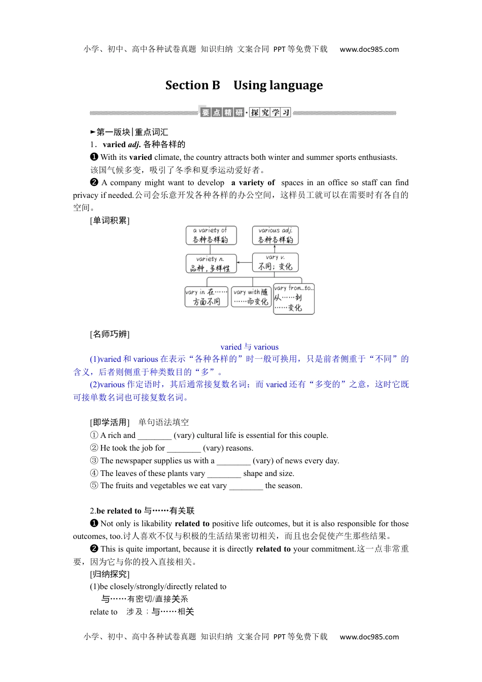 小学、初中、高中各种试卷真题知识归纳文案合同PPT等免费下载www.doc985.com小学、初中、高中各种试卷真题知识归纳文案合同PPT等免费下载www.doc985.comSectionBUsinglanguage►第一版块|重点词汇1.variedadj.各种各样的❶Withitsvariedclimate,thecountryattractsbothwinterandsummersportsenthusiasts.该国气候多变,吸引了冬季和夏季运动爱好者。❷Acompanymightwanttodevelopavarietyofspacesinanofficesostaffcanfindprivacyifneeded.公司会乐意开发各种各样的办公空间,这样员工就可以在需要时有各自的空间。[单词积累][名师巧辨]varied与various(1)varied和various在表示“各种各样的”时一般可换用,只是前者侧重于“不同”的含义,后者则侧重于种类数目的“多”。(2)various作定语时,其后通常接复数名词;而varied还有“多变的”之意,这时它既可接单数名词也可接复数名词。[即学活用]单句语法填空①Arichand________(vary)culturallifeisessentialforthiscouple.②Hetookthejobfor________(vary)reasons.③Thenewspapersuppliesuswitha________(vary)ofnewseveryday.④Theleavesoftheseplantsvary________shapeandsize.⑤Thefruitsandvegetablesweeatvary________theseason.2.berelatedto与……有关联❶Notonlyislikabilityrelatedtopositivelifeoutcomes,butitisalsoresponsibleforthoseoutcomes,too.讨人喜欢不仅与积极的生活结果密切相关,而且也会促使产生那些结果。❷Thisisquiteimportant,becauseitisdirectlyrelatedtoyourcommitment.这一点非常重要,因为它与你的投入直接相关。[归纳探究](1)beclosely/strongly/directlyrelatedto与……有密切/直接系关relateto涉及;与……相关小学、初中、高中各种试卷真题知识归纳文案合同PPT等免费下载www.doc985.com小学、初中、高中各种试卷真题知识归纳文案合同PPT等免费下载www.doc985.comrelateAtoB把A与B系起联来inrelationto于关……;涉及……(2)“与……有系关/有系联”多表:种达beconnectedwith/tobelinkedwith/tobeinvolvedinbeassociatedwithhavesomethingtodowith[误区警示]relatedto常在句中作后置定语,相当于which/that引导的定语从句。[即学活用]单句语法填空①Muchofthecrimeinthisareais________(relate)todrugabuse.②Theproblems________(relate)toourdailylifeconcernusgreatly.③Enoughsleepis________(connect)togeneralhealthconditions.►第二版块|重点句型nowthat既然(引导原因状语从句)❶YouaskedifIhavebeenthinkingalotaboutthefuturenowthatI'm17.你问我现在17岁了,是否对未来想了很多。❷Nowthatyouknowwhyyouwanttowakeup,considerre-arrangingyourmorningactivities.既然你知道想醒来的原因,考虑重新安排早上的活动。[特别提示]nowthat相当于since,引导原因状语从句,在口语中that可以省去,now仍表示“既然”。[即学活用]补全句子__________________________________________________(既然你说到这事儿),shedidseemtobeinastrangemood.识记下列短语①inprogress在行中进②ataparticulartime在特定的时间③insteadof而不是④inone'sownwords用某人自己的言语⑤taketurns流轮⑥bebasedon以……基为础⑦intheschedule在日程表中⑧hearfromsb.收到某人的信来⑨acoupleof几,个两个⑩itseemslike...看起好像来……⑪inthelongterm看从长远来⑫writeareplyto...给……一封回信写⑬belikeamusicalsymphony像一首交响乐小学、初中、高中各种试卷真题知识归纳文案合同PPT等免费下载www.doc985.com小学、初中、高中各种试卷真题知识归纳文案合同PPT等免费下载www.doc985.com⑭havehighandlowmoments有高潮有低谷⑮sitamajorexam加考参专业试⑯Itislikelythat很可能……⑰becomeaboarderforthefirsttime第一次住校⑱bepresentedwith...被予赠……,面对……⑲afterall竟毕⑳nolonger不再○followastrictdormschedule遵循格的宿舍作息表严时间○upsanddowns起伏;衰兴○I'mafraidIcan't...恐怕我不能……○Whatif...?如果……呢?会怎样○fallinlovewith上爱○managetodosth.法做成某事设○s...