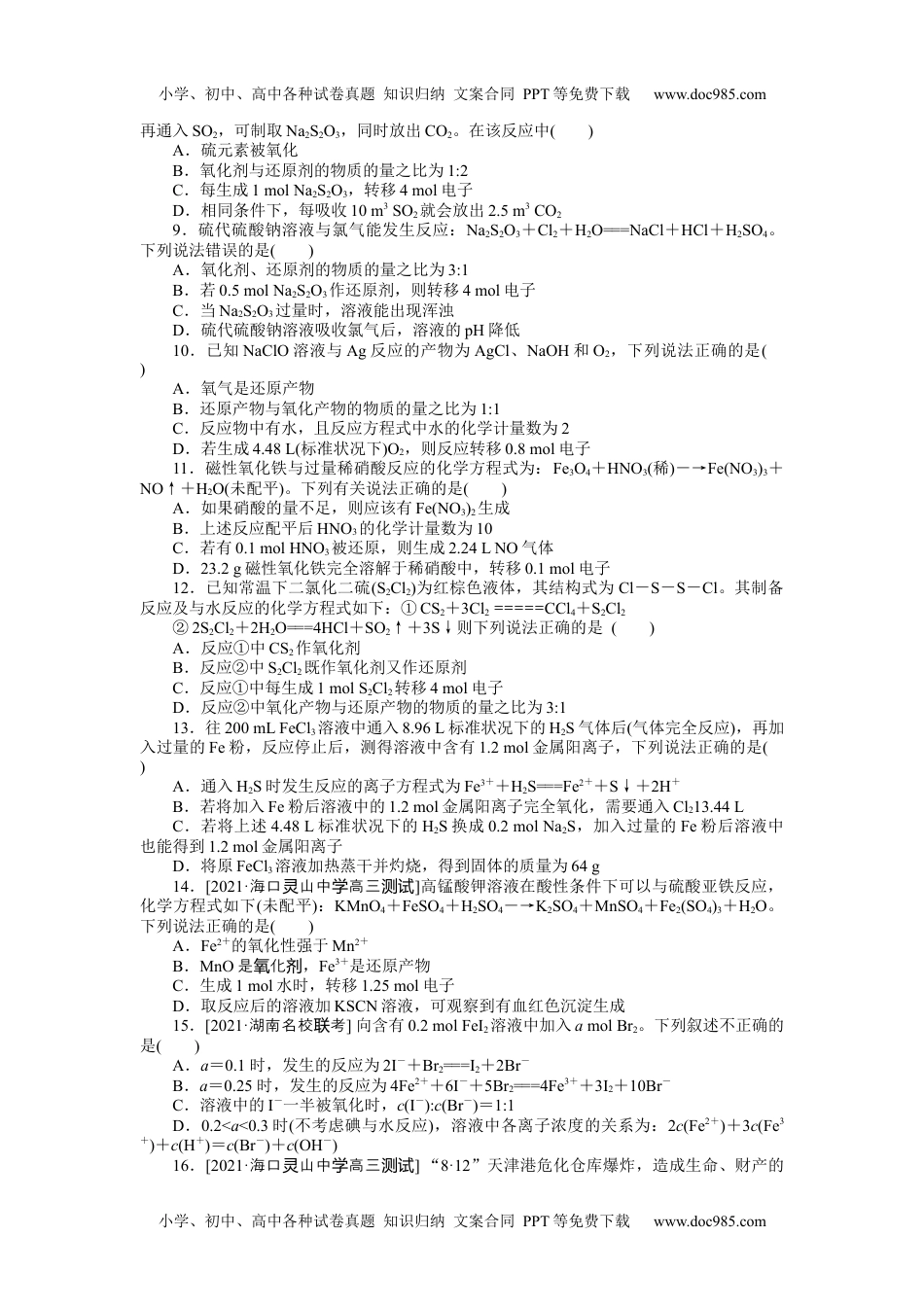 小学、初中、高中各种试卷真题知识归纳文案合同PPT等免费下载www.doc985.com小学、初中、高中各种试卷真题知识归纳文案合同PPT等免费下载www.doc985.com专练11氧化还原反应方程式的配平和计算1.O3具有强氧化性,将O3通入KI溶液中发生反应:O3+I-+H+→I2+O2+H2O(未配平),下列说法正确的是()A.配平后的离子方程式为2O3+2I-+4H+===I2+2O2+2H2OB.每生成1molI2转移电子2molC.O2是还原产物之一D.该反应能说明氧化性O2>I22.将SO2通入足量Fe2(SO4)3溶液中,完全反应后再加入K2Cr2O7溶液,发生的两个化学反应为SO2+2Fe3++2H2O===SO+2Fe2++4W①,Cr2O+aFe2++bH+―→Cr3++Fe3++H2O②。下列有关说法正确的是()A.还原性:Cr3+>SO2B.方程式②中,a=6,b=7C.Cr2O能将Na2SO3氧化成Na2SO4D.方程式①中W为OH-3.[2021·河北强中枣学调研]向某FeBr2溶液中通入1.12L(标准状况)的Cl2,测得溶液中c(Br-)=3c(Cl-)=0.3mol·L-1。反应过程中溶液的体积变化不计。则下列说法中正确的是()A.原溶液的浓度为0.1mol·L-1B.反应后溶液中c(Fe3+)=0.1mol·L-1C.反应后溶液中c(Fe3+)=c(Fe2+)D.原溶液中c(Br-)=0.4mol·L-14.[2021·广卷东]宏观辨识与微观探析是化学学科核心素养之一。下列物质性质实验对应的反应方程式书写正确的是()A.Na2O2放入水中:Na2O2+H2O===2NaOH+O2↑B.H2O(g)通过灼热铁粉:3H2O+2Fe===Fe2O3+3H2C.铜丝插入热的浓硫酸中:Cu+H2SO4===CuSO4+H2↑D.SO2通入酸性KMnO4溶液中:5SO2+2H2O+2MnO===5SO+4H++2Mn2+5.LiAlH4、LiH既是金属储氢材料又是有机合成中的常用试剂,遇水均能剧烈反应放出H2,LiAlH4在125℃分解为LiH、H2和Al。下列说法中不正确的是()A.LiH与D2O反应,所得氢气的摩尔质量为4g·mol-1B.1molLiAlH4在125℃完全分解,转移3mol电子C.LiAlH4溶于适量水得无色溶液,则化学方程式可表示为LiAlH4+2H2O===LiAlO2+4H2↑D.LiAlH4与乙醛作用生成乙醇,LiAlH4作还原剂6.高铁酸钾(K2FeO4)是一种既能杀菌消毒、又能净水的处理剂。工业制备高铁酸钾的反应离子方程式为Fe(OH)3+ClO-+OH-―→FeO+Cl-+H2O(未配平),下列有关说法不正确的是()A.高铁酸钾中铁显+6价B.由上述反应可知,Fe(OH)3的氧化性强于FeOC.上述反应中氧化剂和还原剂的物质的量之比为3:2D.K2FeO4处理水时,不仅能消毒杀菌,而且生成的Fe3+水解形成Fe(OH)3胶体能吸附水中的悬浮杂质7.某反应体系中的物质有:NaOH、Au2O3、Na2S4O6、Na2S2O3、Au2O、H2O。下列方框中对应的物质或有关叙述正确的是()++―→++A.Na2S4O6、H2O、Na2S2O3、Au2O、NaOHB.Na2S2O3、NaOH、Na2S4O6、Au2O、H2OC.Na2S2O3、H2O、Na2S4O6、Au2O、NaOHD.当1molAu2O3完全反应时,转移电子8mol8.[2021·河北重点中考学联]工业上将Na2CO3和Na2S以1:2的物质的量之比配成溶液,小学、初中、高中各种试卷真题知识归纳文案合同PPT等免费下载www.doc985.com小学、初中、高中各种试卷真题知识归纳文案合同PPT等免费下载www.doc985.com再通入SO2,可制取Na2S2O3,同时放出CO2。在该反应中()A.硫元素被氧化B.氧化剂与还原剂的物质的量之比为1:2C.每生成1molNa2S2O3,转移4mol电子D.相同条件下,每吸收10m3SO2就会放出2.5m3CO29.硫代硫酸钠溶液与氯气能发生反应:Na2S2O3+Cl2+H2O===NaCl+HCl+H2SO4。下列说法错误的是()A.氧化剂、还原剂的物质的量之比为3:1B.若0.5molNa2S2O3作还原剂,则转移4mol电子C.当Na2S2O3过量时,溶液能出现浑浊D.硫代硫酸钠溶液吸收氯气后,溶液的pH降低10.已知NaClO溶液与Ag反应的产物为AgCl、NaOH和O2,下列说法正确的是()A.氧气是还原产物B.还原产物与氧化产物的物质的量之比为1:1C.反应物中有水,且反应方程式中水的化学计量数为2D.若生成4.48L(标准状况下)O2,则反应转移0.8mol电子11.磁性氧化铁与过量稀硝酸反应的化学方程式为:Fe3O4+HNO3(稀)―→Fe(NO3)3+NO↑+H2O(未配平)。下列有关说法正确的是()A.如果硝酸的量不足,则应该有Fe(NO3)2生成B.上述反应配平后HNO3的化学计量数为10C.若有0.1molHNO3被还...