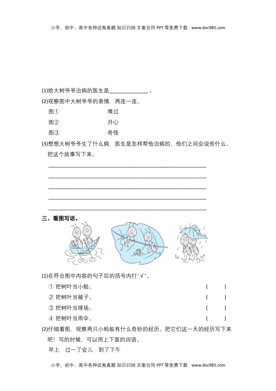 小学、初中、高中各种试卷真题知识归纳文案合同PPT等免费下载www.doc985.com小学、初中、高中各种试卷真题知识归纳文案合同PPT等免费下载www.doc985.com二年级语文下册期末分类复习看图写话(时间:40分钟满分:100分)班级:姓名:学号:.一、看图写句子。1._____________________________________________________________________________________________2.______________________________________________________________________________________________3._____________________________________________________________________________________________4.______________________________________________________________________________________________5.______________________________________________________________________________________________二、看图写话。小学、初中、高中各种试卷真题知识归纳文案合同PPT等免费下载www.doc985.com小学、初中、高中各种试卷真题知识归纳文案合同PPT等免费下载www.doc985.com(1)给大树爷爷治病的医生是______________。(2)观察图中大树爷爷的表情,再连一连。图①难过图②开心图③奇怪(3)想想大树爷爷生了什么病,医生是怎样帮他治病的,他们之间会说些什么。把这个故事写下来。_____________________________________________________________________________________________________________________________________________________________________________________________________________________________________________________________________________________________三、看图写话。(1)在符合图中内容的句子后的括号内打“√”。①把树叶当小船。()②把树叶当被子。()③把树叶当球场。()④把树叶当雨伞。()(2)仔细看图,观察两只小蚂蚁有什么奇妙的经历。把它们这一天的经历写下来吧!写的时候,可以用上下面的词语。早上过一了会儿到了下午小学、初中、高中各种试卷真题知识归纳文案合同PPT等免费下载www.doc985.com小学、初中、高中各种试卷真题知识归纳文案合同PPT等免费下载www.doc985.com_______________________________________________________________________________________________________________________________________________________________________________________________________________________________________________________________________________________________________________________________________________________________________________________________________________四、看图写话。1.仔细观察右图,图中的小朋友在干什么?太阳公公对此有怎样的表现?发挥想象,写几句话。(10分)________________________________________________________________________________________________________________________________________________________________________________________2.仔细看图,弄清楚发生了什么事,先给两个小男孩起名字,再把发生的事情按顺序写下来。(10分)___________________________________________________________________________________________________________________________________________________________________________________________________五、看一看,根据图回答问题。(看图写特点)1.看图判断对错,对的打“√”,错的打“×”。(4分)小学、初中、高中各种试卷真题知识归纳文案合同PPT等免费下载www.doc985.com小学、初中、高中各种试卷真题知识归纳文案合同PPT等免费下载www.doc985.com①图的右边画的是一个机器人。()②机器人的样子很有趣,头圆圆的,像个篮球。()③机器人手里端着香喷喷的大米饭。()④主人笑眯眯地坐在餐桌前,等着品尝早餐。()2.根据特点,想功能。(12分)机器人是我们家的好帮手,它的功能可多了,能_________,能_________,还能_____________。3.结合特点写句子。(8分)先介绍机器人的样子,然后用“能……能……还能……”说一说其功能。_____________________________________...