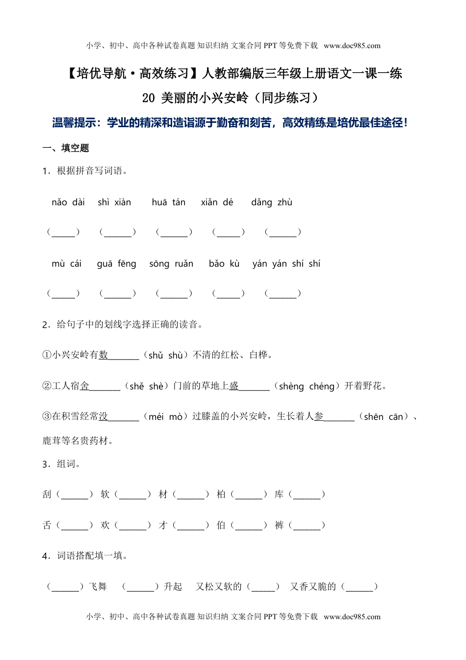 小学、初中、高中各种试卷真题知识归纳文案合同PPT等免费下载www.doc985.com【培优导航·高效练习】人教部编版三年级上册语文一课一练20美丽的小兴安岭(同步练习)温馨提示:学业的精深和造诣源于勤奋和刻苦,高效精练是培优最佳途径!一、填空题1.根据拼音写词语。nǎodàishìxiànhuātánxiǎndédǎngzhù(______)(_______)(_______)(______)(_______)mùcáiguāfēngsōngruǎnbǎokùyányánshíshí(______)(_______)(_______)(______)(_______)2.给句子中的划线字选择正确的读音。①小兴安岭有数________(shǔshù)不清的红松、白桦。②工人宿舍________(shěshè)门前的草地上盛________(shèngchéng)开着野花。③在积雪经常没________(méimò)过膝盖的小兴安岭,生长着人参________(shēncān)、鹿茸等名贵药材。3.组词。刮(_______)软(_______)材(_______)柏(_______)库(_______)舌(_______)欢(_______)才(_______)伯(_______)裤(_______)4.词语搭配填一填。(_______)飞舞(_______)升起又松又软的(______)又香又脆的(_______)小学、初中、高中各种试卷真题知识归纳文案合同PPT等免费下载www.doc985.com小学、初中、高中各种试卷真题知识归纳文案合同PPT等免费下载www.doc985.com(_______)盛开(_______)融化又鲜又嫩的(______)酸又甜的(________)5.给下面的多音字组词。行háng(______)xíng(______)涨zhǎng(______)zhàng(______)舍shě(______)shé(______)兴xīng(_______)xìng(________)6.根据课文内容《美丽的小兴安岭》这篇课文讲述了我国东北小兴安岭________的美丽景色和丰富物产,表达了作者对________的感情。小兴安岭的春天,树木抽出_______,长出________;夏天,树木长得_________,________的枝叶把森林封得严严实实;秋天,森林向人们献出了_________的山葡萄;冬天,雪花在_________,树上积满了_______。二、选择题7.下列词语搭配有误的一项是()A.(雪花)融化又肥又厚的(脚掌)B.(野花)盛开又香又脆的(榛子)C.(积雪)飞舞又松又软的(积雪)D.(浓雾)升起又酸又甜的(山葡萄)8.下面的句子中,不是比喻句的一项是()A.我国东北的小兴安岭,有数不清的树,几百里连成一片,就像绿色的海洋。B.草地上盛开着各种各样的野花,真像个美丽的大花坛。小学、初中、高中各种试卷真题知识归纳文案合同PPT等免费下载www.doc985.com小学、初中、高中各种试卷真题知识归纳文案合同PPT等免费下载www.doc985.comC.冬天到了,黑熊像紫貂一样躲进自己的洞里。D.太阳出来了,千万缕金光像利剑一样,照射在草地上。9.下列词语中书写全部正确的一项是()A.脑装严实挡住B.视线花坛仓翠C.飞舞药才雪花D.巨大宝库柔软10.下列句子括号内的近义词搭配不正确的一项是()。A.坐在小红家新买的沙发上,感觉非常(松软)舒适。B.冬天,地上的雪厚厚的,非常(柔软)。C.妈妈的日记本里夹着一张非常(名贵)的照片。D.人参是非常(名贵)的药材。三、信息匹配11.选择合适的词语。A.松软B.柔软C.珍贵D.名贵(1)坐在小红家新买的沙发上,感觉非常(______)舒适。(2)冬天,地上的雪厚厚的,非常(_______)。(3)妈妈的日记本里夹着一张非常(_______)的照片。(4)人参是非常(_______)的药材。12.读句子,选字填空。小学、初中、高中各种试卷真题知识归纳文案合同PPT等免费下载www.doc985.com小学、初中、高中各种试卷真题知识归纳文案合同PPT等免费下载www.doc985.com(1)脑恼淘淘的________门撞到门上了,他有点________火。(2)袋带爷爷从老家________来了一个大口________,里面装满了特产。(3)才材只有用好的药________________能制出好药。四、语言表达13.按要求完成句子练习。(1).密密层层的枝叶把森林封得严严实实的。(改为“被”字句)_______________________________________________________(2).风,是大自然的音乐家。(改为反问句)_______________________________________________________(3).海底...