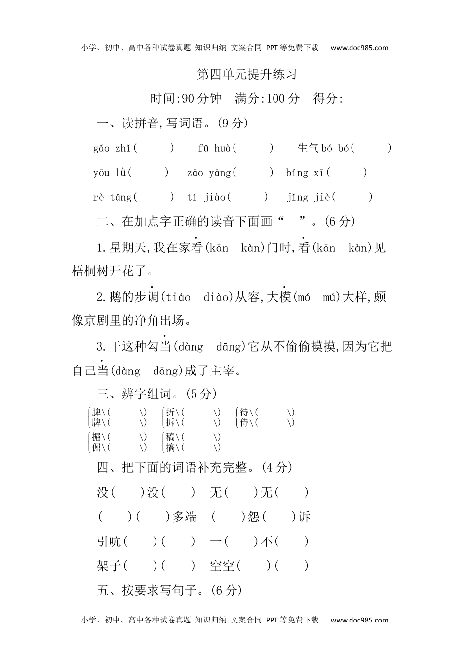 小学、初中、高中各种试卷真题知识归纳文案合同PPT等免费下载www.doc985.com小学、初中、高中各种试卷真题知识归纳文案合同PPT等免费下载www.doc985.com第四单元提升练习时间:90分钟满分:100分得分:一、读拼音,写词语。(9分)gǎozhǐ()fūhuà()生气bóbó()yōulǜ()zāoyāng()bǐngxī()rètāng()tíjiào()jǐngjiè()二、在加点字正确的读音下面画“”。(6分)1.星期天,我在家看(kānkàn)门时,看(kānkàn)见梧桐树开花了。2.鹅的步调(tiáodiào)从容,大模(mómú)大样,颇像京剧里的净角出场。3.干这种勾当(dàngdāng)它从不偷偷摸摸,因为它把自己当(dàngdāng)成了主宰。三、辨字组词。(5分){脾\(\)牌\(\){折\(\)拆\(\){待\(\)侍\(\){掘\(\)倔\(\){稿\(\)搞\(\)四、把下面的词语补充完整。(4分)没()没()无()无()()()多端()怨()诉引吭()()一()不()架子()()空空()()五、按要求写句子。(6分)小学、初中、高中各种试卷真题知识归纳文案合同PPT等免费下载www.doc985.com小学、初中、高中各种试卷真题知识归纳文案合同PPT等免费下载www.doc985.com1.满月的小猫不是生气勃勃、天真可爱吗?(改为陈述句)2.微风吹来,一池的荷花都在摇晃。(改为拟人句)3.谁怎么呼唤。它不肯回来。(用关联词语合成一句话)六、日积月累。(8分)1.连线。千里龙老黄马百灵牛领头鸟哈巴羊变色狗2.把诗句补充完整。不论平地与山尖,。,为谁辛苦为谁甜?七、根据课文内容填空。(12分)小学、初中、高中各种试卷真题知识归纳文案合同PPT等免费下载www.doc985.com小学、初中、高中各种试卷真题知识归纳文案合同PPT等免费下载www.doc985.com1.丰子恺先生笔下的白鹅,《白鹅》一课写了鹅的叫声,步态,吃相。2.老舍先生笔下的猫,文章字里行间都流露出作者对猫的。3.老舍先生写的母鸡、、、,因为它有一群鸡雏。它是因为它是鸡母亲。一个母亲必定是一个。八、课内阅读。(10分)猫(节选)它要是高兴,能比谁都温柔可亲:用身子蹭你的腿,把脖子伸出来让你给它抓痒,或是在你写作的时候,跳上桌来,在稿纸上踩印几朵小梅花。它还会丰富多腔地叫唤,长短不同,粗细各异,变化多端。在不叫的时候,它还会咕噜咕噜地给自己解闷。这可都凭它的高兴。它若是不高兴啊,无论谁说多少好话,它也一声不出。1.根据解释从文中找出相应的词语。(4分)(1)形容声音变化丰富。()(2)形容变化的项目、样子极多。()2.选文从两个方面写出了猫的性格古怪,分别是时和时的不同表现,表达了作者对猫的之情。(3分)小学、初中、高中各种试卷真题知识归纳文案合同PPT等免费下载www.doc985.com小学、初中、高中各种试卷真题知识归纳文案合同PPT等免费下载www.doc985.com3.仿写文中画“”的句子。(3分)九、课外阅读。(10分)那一年,我领着女儿到农村去,恰巧遇见了老家的母鸡在孵小鸡。母鸡趴在草筐里的鸡蛋上,倾注着自己全部的母爱。我们能听到小鸡雏在蛋壳里面用力地啄壳的声音,那声音虽弱小,却震撼着人心。过了好久,一个湿乎乎的小脑袋才很艰难地从里面钻了出来。女儿的目光集中在一个啄壳声响了好长一段时间的鸡蛋上。几分钟过去了,那小孔还是米粒大小。女儿不顾老母鸡威胁的叫声,伸出手来要去剥那个硬壳,想去帮鸡雏。一旁的老大娘拦住了女儿,说:“别去碰它,这小鸡雏只有靠自己啄破硬壳才能活,你帮了它,也许就是害了它。”老母鸡是最爱自己的孩子的,可是它却“冷酷”地让鸡雏自己钻出蛋壳。1.给文章选个合适的题目:()。(2分)A.冷酷的母鸡B.勇敢的母鸡C.大自然的启示2.本文主要写了一件什么事?用一两句话概括。(3分)小学、初中、高中各种试卷真题知识归纳文案合同PPT等免费下载www.doc985.com小学、初中、高中各种试卷真题知识归纳文案合同PPT等免费下载www.doc985.com3.“冷酷”加了引号是因为:(2分)4.大娘的话里蕴含着什么道理?(3分)十、习作。(30分)高傲的白鹅,性格古怪的猫,慈爱、尽职的母鸡……在作者笔下,一个个小动物栩栩如生。你一定也想写一写自己喜欢的小动物吧,那么请选择一种你喜欢的小动物来写写,可以从多角度入手。题目自拟,不少于350字。第四单元提升练习答案一、稿纸孵化勃勃忧虑遭殃屏息热汤啼叫警戒小学、初中、高中各种试卷真题知识归纳文案合同P...