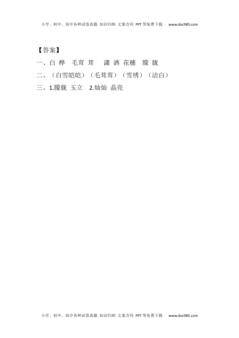 小学、初中、高中各种试卷真题知识归纳文案合同PPT等免费下载www.doc985.com小学、初中、高中各种试卷真题知识归纳文案合同PPT等免费下载www.doc985.com11白桦课时练第一课时一、看拼音写词语。báihuàmáorónɡrónɡxiāosǎhuāsuìménɡlónɡ()()()()()二、按课文内容补充词语。()的树枝()的枝头()的花边()的流苏三、按课文内容填空。1.在()的寂静中,()着这棵白桦。2.在()的金晖里,闪着()的雪花。小学、初中、高中各种试卷真题知识归纳文案合同PPT等免费下载www.doc985.com小学、初中、高中各种试卷真题知识归纳文案合同PPT等免费下载www.doc985.com【答案】一、白桦毛茸茸潇洒花穗朦胧二、(白雪皑皑)(毛茸茸)(雪绣)(洁白)三、1.朦胧玉立2.灿灿晶亮小学、初中、高中各种试卷真题知识归纳文案合同PPT等免费下载www.doc985.com小学、初中、高中各种试卷真题知识归纳文案合同PPT等免费下载www.doc985.com第二课时一、辨字组词。桦()涂()绣()辉()哗()蜍()锈()晖()二、补充词语。()的寂静()的雪花()朝霞()的光华()的金晖三、缩写下面的句子。1.姗姗来迟的朝霞在白桦四周徜徉着。2.一层银色的光华抹在白雪皑皑的枝头上。小学、初中、高中各种试卷真题知识归纳文案合同PPT等免费下载www.doc985.com小学、初中、高中各种试卷真题知识归纳文案合同PPT等免费下载www.doc985.com【答案】一、(白桦)(糊涂)(绣花)(光辉)(哗哗)(蟾蜍)(生锈)(余晖)二、(朦胧)(晶亮)(姗姗来迟)(银色)(灿灿)三、1.朝霞徜徉着。2.光华抹在枝头上。