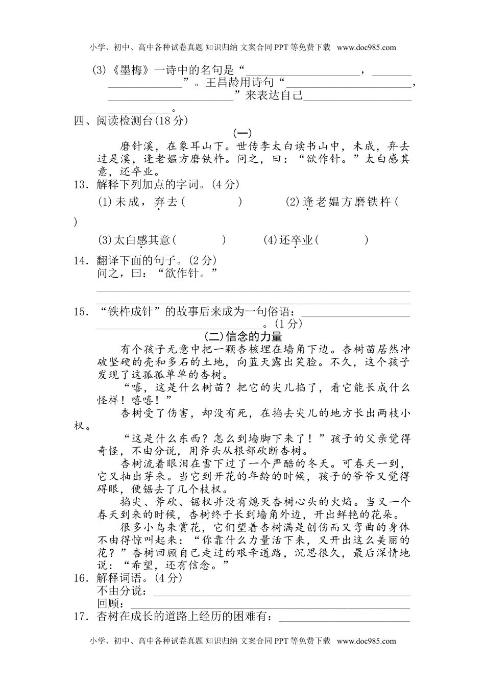 小学、初中、高中各种试卷真题知识归纳文案合同PPT等免费下载www.doc985.com期末检测卷时间:90分钟满分:100分一、基础训练营(39分)1.从括号里找出加点字的正确读音,画“____”。(4分)率领(shuàilǜ)慰藉(jièjí)澎湃(bàipài)掂量(diàndiān)2.读拼音,写词语。(5分)3.比一比,再组词。(4分)4.把下列词语补充完整。(4分)欣()若()()()地阔一丝()()从()不()以()乱()()水()龙()山()水鲲鹏()()5.根据加点字词的特点,照样子,写词语。(3分)生气勃勃(ABCC式):__________________________________九天揽月(含数字):__________________________________6.照样子,在括号里填上适当的词语。(4分)例:(袅袅)的炊烟()的恐龙()的芦花鞋()的风景画()的双龙洞7.给加点的字选择正确的解释。(4分)【赖】A.依靠;B.责怪;C.不好,坏;D.不承认自己的错误或责任。(1)你欠别人的钱,这个账是赖不掉的。()(2)这件事大家都有责任,不能赖哪一个人。()(3)我们团队今天顺利完成任务,有赖于大家的努力。()(4)今年庄稼长得真不赖。()小学、初中、高中各种试卷真题知识归纳文案合同PPT等免费下载www.doc985.com小学、初中、高中各种试卷真题知识归纳文案合同PPT等免费下载www.doc985.com8.选择正确的关联词填空。(3分)即使……也……因为……所以……尽管……还是……(1)()遭到敌人的毒打,雨来()绝不说出李大叔的下落。(2)()家人不让青铜去卖鞋,他()坚持要去。(3)()它是那么生气勃勃,天真可爱,()你绝不会责打它。9.按要求写句子。(8分)(1)几场春雨过后,许多鲜嫩的笋从土里长了出来。(改为拟人句)_____________________________________________________(2)海上日出的景象很美。(改为感叹句)_____________________________________________________(3)恐龙学会了飞翔。(扩句)_____________________________________________________(4)《宿新市徐公店》的作者是杨万里写的。(修改病句)_____________________________________________________二、综合展示厅(5分)10.从你最近了解的新闻中选一则感兴趣的和同学交流。要求:说清楚新闻的来源、事件的内容,适当加上自己的看法。______________________________________________________________________________________________________________三、课本直通车(18分)11.比比看,谁的积累多。(8分)(1)儿童急走追黄蝶,__________________________。(2)梅子金黄杏子肥,__________________________。(3)《蜂》中的名句是:采得百花成蜜后,___________________?(4)雾锁山头山锁雾,________________________。(5)__________________________,近水远山皆有情。(6)__________________,只有敬亭山。(7)生于忧患而________________________。(8)天行健,__________________________。12.按课文内容填空。(10分)(1)《海上日出》是按照____________________________的顺序来写的,文章结尾用反问句“_____________________________”做总结,表达了作者对这一奇观的______________之情。(2)在《清平乐•村居》中,作者通过描写大儿__________,中儿____________,小儿____________,给我们勾勒了一幅生动的农家生活画面。小学、初中、高中各种试卷真题知识归纳文案合同PPT等免费下载www.doc985.com小学、初中、高中各种试卷真题知识归纳文案合同PPT等免费下载www.doc985.com(3)《墨梅》一诗中的名句是“____________________,____________________”。王昌龄用诗句“______________________,______________________”来表达自己______________________________。四、阅读检测台(18分)(一)磨针溪,在象耳山下。世传李太白读书山中,未成,弃去过是溪,逢老媪方磨铁杵。问之,曰:“欲作针。”太白感其意,还卒业。13.解释下列加点的字词。(4分)(1)未成,弃去()(2)逢老媪方磨铁杵()(3)太白感其意()(4)还卒业()14.翻译下面的句子。(2分)问之,曰:“欲作针。”______________________________________________________________________________________________________________15.“铁杵成针”的故事后来成为一句俗语:______________...