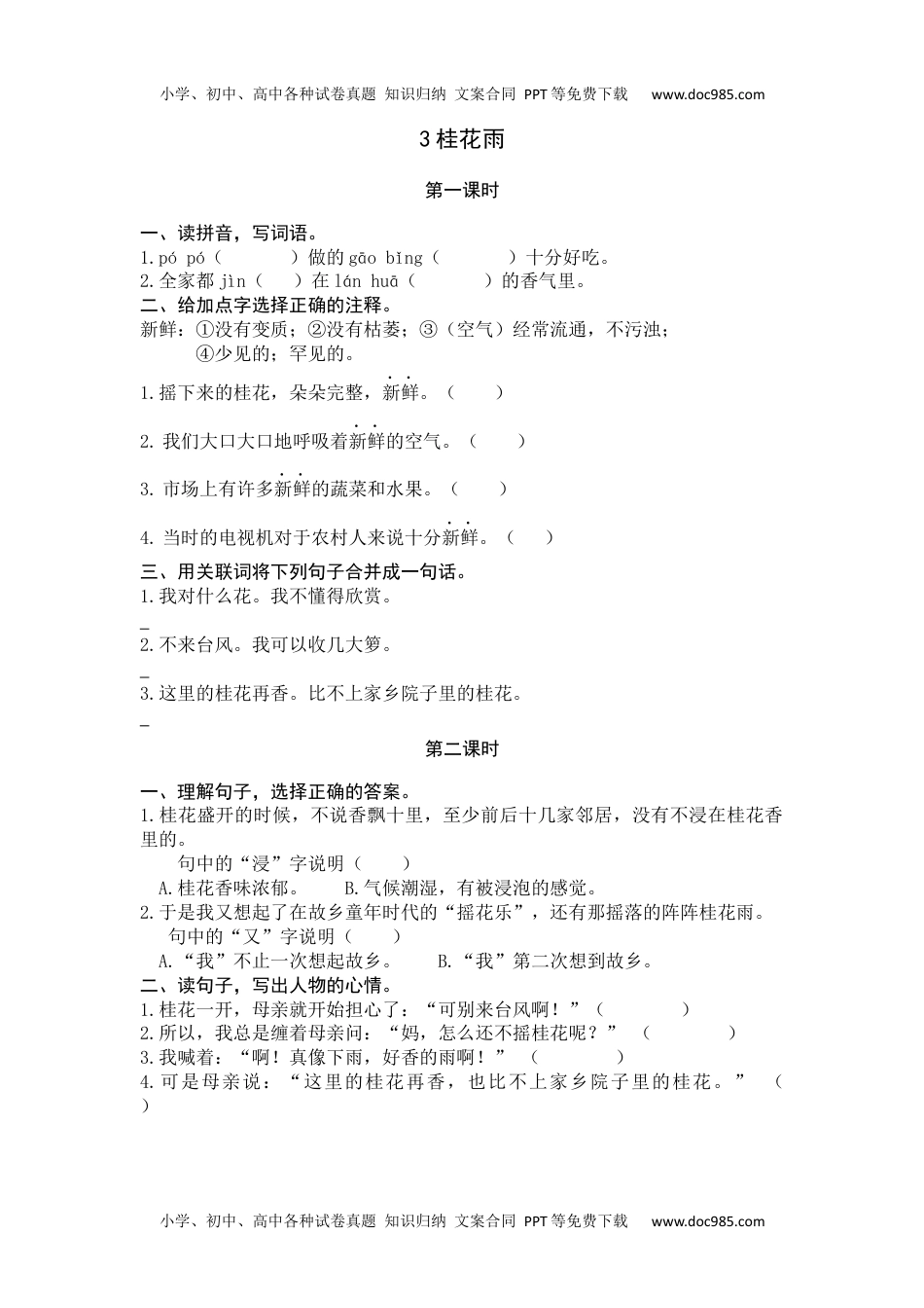 小学、初中、高中各种试卷真题知识归纳文案合同PPT等免费下载www.doc985.com小学、初中、高中各种试卷真题知识归纳文案合同PPT等免费下载www.doc985.com3桂花雨第一课时一、读拼音,写词语。1.pópó()做的gāobǐng()十分好吃。2.全家都jìn()在lánhuā()的香气里。二、给加点字选择正确的注释。新鲜:①没有变质;②没有枯萎;③(空气)经常流通,不污浊;④少见的;罕见的。1.摇下来的桂花,朵朵完整,新鲜。()2.我们大口大口地呼吸着新鲜的空气。()3.市场上有许多新鲜的蔬菜和水果。()4.当时的电视机对于农村人来说十分新鲜。()三、用关联词将下列句子合并成一句话。1.我对什么花。我不懂得欣赏。2.不来台风。我可以收几大箩。3.这里的桂花再香。比不上家乡院子里的桂花。第二课时一、理解句子,选择正确的答案。1.桂花盛开的时候,不说香飘十里,至少前后十几家邻居,没有不浸在桂花香里的。句中的“浸”字说明()A.桂花香味浓郁。B.气候潮湿,有被浸泡的感觉。2.于是我又想起了在故乡童年时代的“摇花乐”,还有那摇落的阵阵桂花雨。句中的“又”字说明()A.“我”不止一次想起故乡。B.“我”第二次想到故乡。二、读句子,写出人物的心情。1.桂花一开,母亲就开始担心了:“可别来台风啊!”()2.所以,我总是缠着母亲问:“妈,怎么还不摇桂花呢?”()3.我喊着:“啊!真像下雨,好香的雨啊!”()4.可是母亲说:“这里的桂花再香,也比不上家乡院子里的桂花。”()小学、初中、高中各种试卷真题知识归纳文案合同PPT等免费下载www.doc985.com小学、初中、高中各种试卷真题知识归纳文案合同PPT等免费下载www.doc985.com参考答案:第一课时一、1.婆婆糕饼2.浸兰花二、1.②2.③3.①4.④三、1.我无论对什么花,都不懂得欣赏。2.只要不来台风,我就可以收几大箩。3.即使这里的桂花再香,也比不上家乡院子里的桂花。第二课时一、1.A2.A二、1.担忧来台风2.盼望早点摇桂花3.快乐4.思念家乡