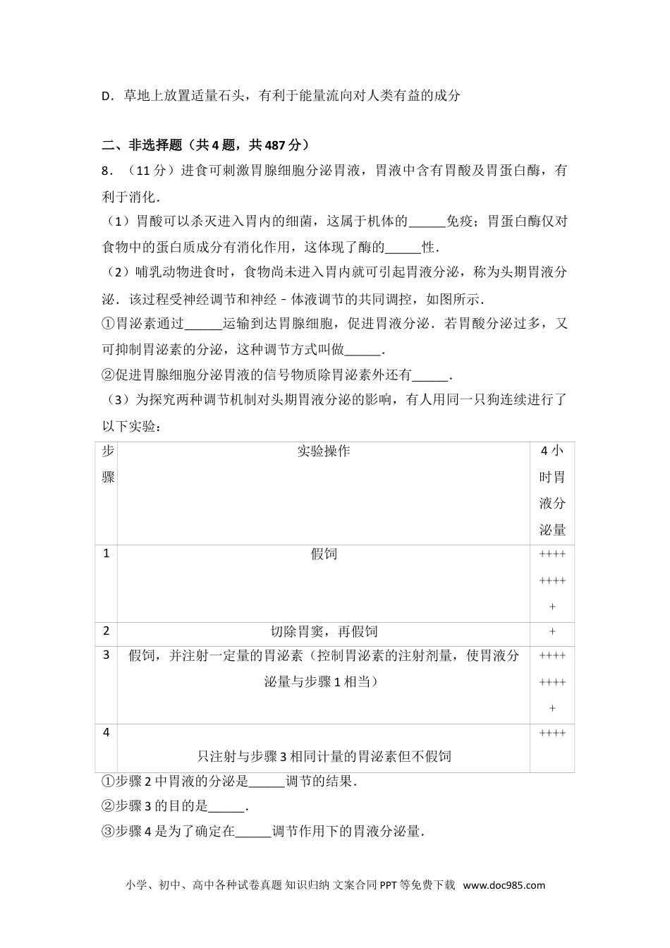 2015年四川省高考生物试卷一、选择题:共7题,每题6分,在每题给出的四个选项中,只有一个选项是符合题目要求的.1.(6分)下列在叶绿体中发生的生理过程,不需要蛋白质参与的是()A.Mg2+吸收B.O2扩散C.光能转换D.DNA复制2.(6分)精子内的顶体由溶酶体特化而来,精卵识别后,顶体膜与精子细胞膜融合,释放溶酶体酶使卵子外层形成孔洞,以利于精卵融合形成受精卵,下列叙述正确的是()A.顶体内储存的溶酶体酶是在精子的溶酶体中合成的B.精子游向卵子所需的能量来自线粒体和细胞溶胶C.顶体膜和精子细胞膜融合体现生物膜的选择透过性D.受精卵中的遗传物质一半来自父方另一半来自母方3.(6分)下列是以酵母菌为材料进行的实验,有关叙述错误的是()A.探究酵母菌的呼吸方式,可用溴麝香草酚蓝检测产生的CO2B.用酵母菌发酵酿制果酒,选择酸性重铬酸钾检测产生的酒精C.探究酵母菌群数量变化,应设空白对照排除无关变量干扰D.用稀释涂布平板法培养计数,应选择30300﹣菌落数的平板4.(6分)在适宜温度和大气CO2浓度条件下,测得某森林中林冠层四种主要乔木的幼苗叶片的生理指标(见下表)。下列分析正确的是()物种指标马尾松苦槠石栎青冈光补偿点(μmol•m2﹣•s﹣1)140663722光饱和点(μmol•m2﹣•s﹣1)14251255976924(光补偿点:光合速率等于呼吸速率时的光强;光饱和点:达到最大光合速率所需的最小光强)小学、初中、高中各种试卷真题知识归纳文案合同PPT等免费下载www.doc985.comA.光强大于140μmol•m2﹣•s1﹣,马尾松幼苗叶肉细胞中产生的O2全部进入线粒体B.光强小于1255μmol•m2﹣•s1﹣,影响苦槠幼苗光合速率的环境因素是CO2浓度C.森林中生产者积累有机物的能量总和,即为输入该系统的能量总能量D.在群落演替过程中,随着林冠密集程度增大,青冈的种群密度将会增加5.(6分)人体感染链球菌等细菌后可致急性肾小球肾炎,患者体内存在抗原﹣抗体复合物,并出现蛋白尿。下列叙述正确的是()A.用双缩脲试剂检测蛋白尿,需水浴加热方可呈现出紫色B.患者血浆蛋白减少使血浆渗透压升高,可出现组织水肿C.链球菌的抗原由核糖体合成并经高尔基体运输至细胞膜D.内环境中形成的抗原﹣抗体复合物可被吞噬细胞吞噬消化6.(6分)M基因编码含63个氨基酸的肽链.该基因发生插入突变,使mRNA增加了一个三碱基序列AAG,表达的肽链含64个氨基酸.以下说法正确的是()A.M基因突变后,参与基因复制的嘌呤核苷酸比例增加B.在M基因转录时,核糖核苷酸之间通过碱基配对连接C.突变前后编码的两条肽链,最多有2个氨基酸不同D.在突变基因的表达过程中,最多需要64种tRNA参与7.(6分)某放牧草地有一些占地约1m2的石头,有人于石头不同距离处,调查了蜥蜴个体数、蝗虫种群密度和植物生物量(干重),结果如图.下列叙述错误的是()A.随着蝗虫种群密度的增大,植物之间的竞争将会加剧B.蜥蜴活动地点离石头越远,被天敌捕食的风险越大C.距石头的远近是引起该群落水平结构变化的重要因素小学、初中、高中各种试卷真题知识归纳文案合同PPT等免费下载www.doc985.comD.草地上放置适量石头,有利于能量流向对人类有益的成分二、非选择题(共4题,共487分)8.(11分)进食可刺激胃腺细胞分泌胃液,胃液中含有胃酸及胃蛋白酶,有利于消化.(1)胃酸可以杀灭进入胃内的细菌,这属于机体的免疫;胃蛋白酶仅对食物中的蛋白质成分有消化作用,这体现了酶的性.(2)哺乳动物进食时,食物尚未进入胃内就可引起胃液分泌,称为头期胃液分泌.该过程受神经调节和神经﹣体液调节的共同调控,如图所示.①胃泌素通过运输到达胃腺细胞,促进胃液分泌.若胃酸分泌过多,又可抑制胃泌素的分泌,这种调节方式叫做.②促进胃腺细胞分泌胃液的信号物质除胃泌素外还有.(3)为探究两种调节机制对头期胃液分泌的影响,有人用同一只狗连续进行了以下实验:步骤实验操作4小时胃液分泌量1假饲+++++++++2切除胃窦,再假饲+3假饲,并注射一定量的胃泌素(控制胃泌素的注射剂量,使胃液分泌量与步骤1相当)+++++++++4只注射与步骤3相同计量的胃泌素但不假饲++++①步骤2中胃液的分泌是调...