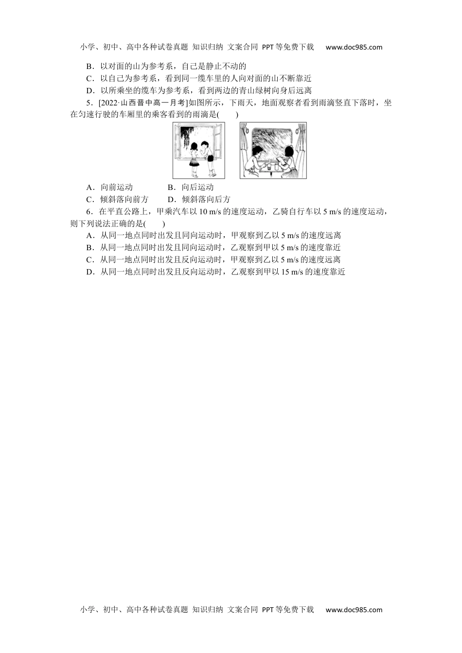 小学、初中、高中各种试卷真题知识归纳文案合同PPT等免费下载www.doc985.com小学、初中、高中各种试卷真题知识归纳文案合同PPT等免费下载www.doc985.com1参考系(二)1.(多选)中国人民解放军在南海海域举行海上大阅兵,共有48艘战舰接受检阅.图甲是正在接受检阅的一字排列的舰队,图乙是正在接受检阅的“辽宁舰”上歼-15战机的起飞表演.下列说法正确的是()A.若以大海为参考系,图甲中各艘舰艇都是运动的B.若以一字舰队最前面的舰艇为参考系,图甲中其余各艘舰艇都是运动的C.若以“辽宁舰”为参考系,图乙中正在起飞的歼-15战机是运动的D.若以“辽宁舰”为参考系,图乙中准备起飞的歼-15战机是运动的2.2021年10月16日我国长征二号F遥十三火箭将神舟十三号载人飞船精准送入预定轨道,并与天和核心舱实施自主快速径向交会对接.如图所示,为最终实现在2022年前后完成载人空间站的全部建设奠定了基础.根据以上信息,下列说法正确的是()A.“神舟十三号”飞船在与“天和核心舱”对接的过程,可将它们视为质点B.对接成功后,以空间站为参考系,“神舟十三号”飞船是运动的C.对接成功后,以地球为参考系,整个空间站是静止的D.载人空间站建成后,研究空间站绕地球飞行的时间时,可将空间站视为质点3.某班同学分乘两辆汽车去公园游玩,两辆汽车在平直公路上行驶,甲车内一同学看见乙车没有运动,而乙车内一同学看见路旁的树木向西移动,如果以地面为参考系,那么上述观察说明()A.甲车不动,乙车向东运动B.乙车不动,甲车向东运动C.甲车向西运动,乙车向东运动D.甲、乙两车以相同的速度都向东运动4.如图所示,对于正在乘坐索道缆车观光的某游客来说,下列说法正确的是()A.以自己为参考系,看到自己所乘坐的缆车向对面运动小学、初中、高中各种试卷真题知识归纳文案合同PPT等免费下载www.doc985.com小学、初中、高中各种试卷真题知识归纳文案合同PPT等免费下载www.doc985.comB.以对面的山为参考系,自己是静止不动的C.以自己为参考系,看到同一缆车里的人向对面的山不断靠近D.以所乘坐的缆车为参考系,看到两边的青山绿树向身后远离5.[2022·山西晋中高一月考]如图所示,下雨天,地面观察者看到雨滴竖直下落时,坐在匀速行驶的车厢里的乘客看到的雨滴是()A.向前运动B.向后运动C.倾斜落向前方D.倾斜落向后方6.在平直公路上,甲乘汽车以10m/s的速度运动,乙骑自行车以5m/s的速度运动,则下列说法正确的是()A.从同一地点同时出发且同向运动时,甲观察到乙以5m/s的速度远离B.从同一地点同时出发且同向运动时,乙观察到甲以5m/s的速度靠近C.从同一地点同时出发且反向运动时,甲观察到乙以5m/s的速度远离D.从同一地点同时出发且反向运动时,乙观察到甲以15m/s的速度靠近