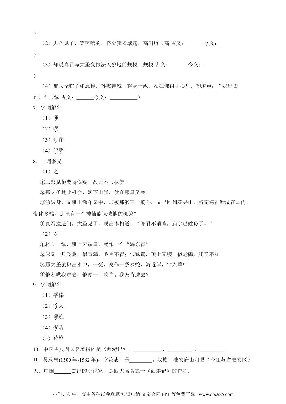 小圣施威降大圣(2024)分层作业一、单选题1.依次填入下面一段文字横线处的语句,衔接最恰当的一项是()梦想是一棵树,____;梦想是一条河流,____;梦想是一个罗盘,____。因为有梦想,我们不再渺小,它让无数人战胜了前进道路的坎坷;因为有梦想,我们的生命尽放灿烂之花。①会让你在竞争的海洋中找到正确的前进方向②会在奔流中激起澎湃的浪花③会沿着不同的树枝冲上云霄A.①②③B.②①③C.③①②D.③②①2.下列有关名著《西游记》说法错误的一项是()A.作者是明代的吴承恩,这是一部很有趣的书,鲁迅先生称之为“神魔小说”,林庚先生称之为“童心之作”,是中国古典文学中最富有想象力的作品之一。B.全书故事引人入胜。前七回讲孙悟空的身世和大闹天宫的故事;第八回到第十二回介绍唐僧,交代西天取经这一中心事件的由来;第十三回到第一百回是小说故事的主体,讲述唐僧师徒取经路上战胜无数妖怪,历经重重磨难,终于到达西天,取回真经的故事。C.孙悟空乃一石产灵猴,因寻得水帘洞,石猴被众猴奉为“齐天大圣”。水帘洞洞口的对联是“花果山福地,水帘洞洞天”。D.《西游记》中,唐僧师徒一行历经千难万险终得正果,唐僧、孙悟空分别被如来佛祖封为旃檀功德佛和斗战胜佛。3.下列各组词语中加点字注音全对的一项是()A.掣棒(zhì)吆喝(yāo)金箍棒(ɡū)B.钉住(dìnɡ)寻觅(mì)淬入水内(cuì)C.鲂鱼(fánɡ)花鸨(bǎo)幌一幌(huànɡ)D.高擎(qínɡ)青鹞(yào)大鹚老(zī)4.下列词语中没有错别字的一项是()A.树梢铁钳窗棂园睁凤目B.磕头云宵饿鹰趁着机会C.踪迹猢狲低贱众皆愕然D.翎毛菩萨拽满安下云头5.下列各项注音全部正确的一项是()A.掣棒(zhì)金箍棒(ɡū)大鹚老(cí)嗛(xián)B.青鹞(yào)鹭鸶(lùsī)老鹳(ɡuàn)鳜鱼(juē)C.鲂鱼(fánɡ)撺出(cuān)木木樗樗(chū)愕然(è)D.蓼汀(liǎotīnɡ)幌一幌(huǎnɡ)鸨鸟(bāo)翎毛(línɡ)二、填空题6.古今异义(1)那六兄弟,慌慌张张,前后寻觅不见,一齐吆喝道(寻觅古义:今义:小学、初中、高中各种试卷真题知识归纳文案合同PPT等免费下载www.doc985.com)(2)大圣见了,笑嘻嘻的,将金箍棒掣起,高叫道(高古义:今义:)(3)却说真君与大圣变做法天象地的规模(规模古义:今义:)(4)那大圣收了如意棒,抖擞神威,将身一纵,站在佛祖手心里,却道声:“我出去也!”(纵古义:今义:)7.字词解释(1)撺(2)幌(3)钉住(4)鸬鹚8.一词多义(1)之①二郎见他变得低贱,故此不去拢傍②那大圣趁此机会,滚下山崖,伏在那里又变③急纵身,又跳出瀑布泉中,却被那猴王一筋斗,又早回到花果山,将定海神针藏在耳内,变化多端,那里有一个神仙能识破他的机关?④真君撞进门,大圣见了,现出本相道:“郎君不消嚷,庙宇已姓孙了。”(2)以①将身一纵,跳上云端里,变作一个“海东青”②忽见一只飞禽,似青鹞,毛片不青;似鹭鸶,顶上无缨;似老鹳,腿又不红③那大圣就撺出水中,一变,变作一条水蛇,游近岸,钻入草中④他若哄我进去,他便一口咬住。我怎肯进去?9.字词解释(1)掣棒(2)淬入(3)踪迹(4)提防(5)花鸨10.中国古典四大名著指的是《西游记》、、、。11.吴承恩(1500年-1582年),字汝忠,号。汉族,淮安府山阳县(今江苏省淮安区)人。中国杰出的小说家,是四大名著之一《西游记》的作者。小学、初中、高中各种试卷真题知识归纳文案合同PPT等免费下载www.doc985.com12.唐太宗贞观元年(627年),年仅25岁的和尚带领一个弟子离开京城西安,只身到天竺(印度)游学。贞观十九年(645年)他回到了长安,他这次西天取经,前后19年,行程几万里,是一次传奇式的万里长征,轰动一时。后来他口述西行见闻,由弟子辩机辑录成12卷。三、语言表达13.拓展延伸(1)结合本文,说说《西游记》中孙悟空的形象深受人们喜爱的原因。(2)如果你是孙悟空,在被二郎神追捕的过程中,你会想些什么?(3)《西游记》中还有很多精彩的打斗场面,请你再列举一个,并简要分析其精彩之处。(4)有人说孙悟空的反抗精神值得赞扬,也有人说他的反抗是不理...