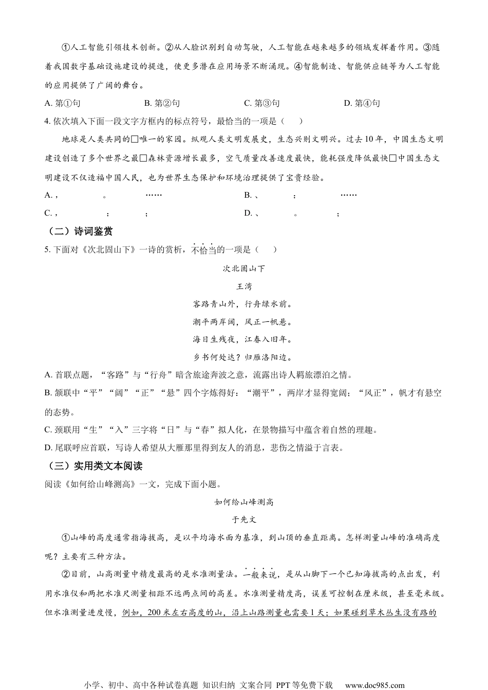 小学、初中、高中各种试卷真题知识归纳文案合同PPT等免费下载www.doc985.com机密★启用前2023年天津市初中学业水平考试试卷语文本试卷分为第I卷(选择题)、第Ⅱ卷(非选择题)两部分。第I卷为第1页至第4页,第Ⅱ卷为第5页至第8页。试卷满分120分。考试时间120分钟。答卷前,请务必将自己的姓名、考生号、考点校、考场号、座位号填写在“答题卡”上,并在规定位置粘贴考试用条形码。答题时,务必将答案涂写在“答题卡”上,答案答在试卷上无效。考试结束后,将本试卷和“答题卡”一并交回。祝你考试顺利!第I卷注意事项:1.每题选出答案后,用2B铅笔把“答题卡”上对应题目的答案标号的信息点涂黑。如需改动,用橡皮擦干净后,再选涂其他答案标号的信息点。2.本卷共11题,共29分。一、(本大题共11小题,共29分。1~4小题,每题2分;5~11小题,每题3分)(一)积累与运用1.下面各组词语中加点字的注音,完全正确的一项是()A.愧怍(zuò)翩然(piān)拈轻怕重(zhān)B.震悚(sǒng)亘古(gèng)坦荡如砥(dǐ)C.汲取(xī)酝酿(yùn)人迹罕至(hǎn)D.摇曳(yè)遵循(xún)不屑置辩(xiè)2.依次填入下面一段文字横线处的词语,最恰当的一项是()历史悠久的书法艺术,_____________着中华文明的发展进程,承载着中华优秀传统文化,_____________着丰厚的中华美学精神。无论是修长匀称的篆书、蚕头燕尾的隶书,还是狂放洒脱的草书、方正规矩的楷书,都_____________了中华文化之美,具有以美育人、以美化人的重要作用。因此,经典书法作品已成为学校开展德育、美育的重要载体。A.记录包含显露B.收录蕴含显露C.记录蕴含体现D.收录包含体现3.下面一段文字中有语病的一项是()小学、初中、高中各种试卷真题知识归纳文案合同PPT等免费下载www.doc985.com①人工智能引领技术创新。②从人脸识别到自动驾驶,人工智能在越来越多的领域发挥着作用。③随着我国数字基础设施建设的提速,使更多潜在应用场景不断涌现。④智能制造、智能供应链等为人工智能的应用提供了广阔的舞台。A.第①句B.第②句C.第③句D.第④句4.依次填入下面一段文字方框内的标点符号,最恰当的一项是()地球是人类共同的□唯一的家园。纵观人类文明发展史,生态兴则文明兴。过去10年,中国生态文明建设创造了多个世界之最□森林资源增长最多,空气质量改善速度最快,能耗强度降低最快□中国生态文明建设不仅造福中国人民,也为世界生态保护和环境治理提供了宝贵经验。A.,。……B.、:……C.,:;D.、。;(二)诗词鉴赏5.下面对《次北固山下》一诗的赏析,不恰当的一项是()次北固山下王湾客路青山外,行舟绿水前。潮平两岸阔,风正一帆悬。海日生残夜,江春入旧年。乡书何处达?归雁洛阳边。A.首联点题,“客路”与“行舟”暗含旅途奔波之意,流露出诗人羁旅漂泊之情。B.颔联中“平”“阔”“正”“悬”四个字炼得好:“潮平”,两岸才显得宽阔;“风正”,帆才有悬空的态势。C.颈联用“生”“入”三字将“日”与“春”拟人化,在景物描写中蕴含着自然的理趣。D.尾联呼应首联,写诗人希望从大雁那里得到友人的消息,悲伤之情溢于言表。(三)实用类文本阅读阅读《如何给山峰测高》一文,完成下面小题。如何给山峰测高于先文①山峰的高度通常指海拔高,是以平均海水面为基准,到山顶的垂直距离。怎样测量山峰的准确高度呢?主要有三种方法。②目前,山高测量中精度最高的是水准测量法。一般来说,是从山脚下一个已知海拔高的点出发,利用水准仪和两把水准尺测量相距不远两点间的高差。水准测量精度高,误差可控制在厘米级,甚至毫米级。但水准测量进度慢,例如,200米左右高度的山,沿上山路测量也需要1天;如果碰到草木丛生没有路的小学、初中、高中各种试卷真题知识归纳文案合同PPT等免费下载www.doc985.com山,测量进度就更加缓慢。因此,该方法只适合测量较低的山峰。③相比之下,三角高程测量法要简单快捷得多。我们测量448.9米的南京紫金山主峰,用的就是这个方法:在山脚下,利用安置在海拔高已知点上的全站仪,瞄准安置在山顶的棱镜,可测得视线的高度角和距离,利用数学方法就能算出一个...