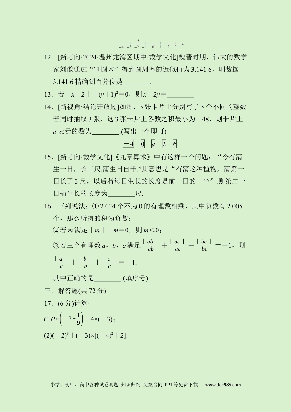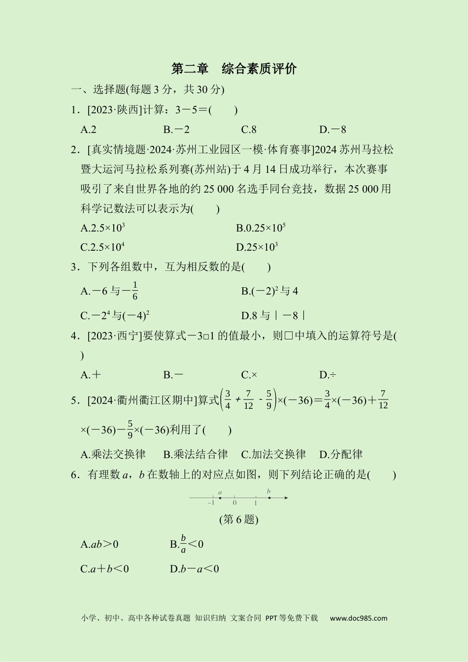 小学、初中、高中各种试卷真题知识归纳文案合同PPT等免费下载www.doc985.com第二章综合素质评价一、选择题(每题3分,共30分)1.[2023·陕西]计算:3-5=()A.2B.-2C.8D.-82.[真实情境题·2024·苏州工业园区一模·体育赛事]2024苏州马拉松暨大运河马拉松系列赛(苏州站)于4月14日成功举行,本次赛事吸引了来自世界各地的约25000名选手同台竞技,数据25000用科学记数法可以表示为()A.2.5×103B.0.25×105C.2.5×104D.25×1033.下列各组数中,互为相反数的是()A.-6与-16B.(-2)2与4C.-24与(-4)2D.8与|-8|4.[2023·西宁]要使算式-3□1的值最小,则□中填入的运算符号是()A.+B.-C.×D.÷5.[2024·衢州衢江区期中]算式(34+712-59)×(-36)=34×(-36)+712×(-36)-59×(-36)利用了()A.乘法交换律B.乘法结合律C.加法交换律D.分配律6.有理数a,b在数轴上的对应点如图,则下列结论正确的是()(第6题)A.ab>0B.ba<0C.a+b<0D.b-a<0小学、初中、高中各种试卷真题知识归纳文案合同PPT等免费下载www.doc985.com7.杨梅开始采摘啦!每筐杨梅以5kg为基准,超过的千克数记为正数,不足的千克数记为负数,记录如图,则这4筐杨梅的总质量是()(第7题)A.19.7kgB.19.9kgC.20.1kgD.20.3kg8.下列等式中不成立的是()A.-(-12)-|-13|=16B.(-12)÷(-115)=(-12)×(-15)C.14÷1.2÷23=14×56×32D.(-34)÷0.25=(-34)×149.[母题教材P64活动二]计算机是将信息转换成二进制数进行处理的,二进制即“逢2进1”,如(101)2表示二进制数,将它转换成十进制形式是:1×22+0×21+1×20=5,那么将二进制数(10101)2转换成十进制数是()A.41B.21C.13D.1110.若|x|=11,|y|=14,|z|=20,且|x+y|=x+y,|y+z|=-(y+z),则x+y-z=()A.23B.45C.45或23D.-45或-23二、填空题(每题3分,共18分)11.[2024·西安高新区模拟]如图,数轴上点A所表示的数的倒数为.小学、初中、高中各种试卷真题知识归纳文案合同PPT等免费下载www.doc985.com12.[新考向·2024·温州龙湾区期中·数学文化]魏晋时期,伟大的数学家刘徽通过“割圆术”得到圆周率的近似值为3.1416,则数据3.1416精确到百分位是.13.若|x-2|+(y+1)2=0,则x-2y=.14.[新视角·结论开放题]如图,5张卡片上分别写了5个不同的整数,若同时抽取3张,这3张卡片上各数之积最小为-48,则卡片上a表示的数为.(写出一个即可)-40a2615.[新考向·数学文化]《九章算术》中有这样一个问题:“今有蒲生一日,长三尺.蒲生日自半.”其意思是“有蒲这种植物,蒲第一日长了3尺,以后蒲每日生长的长度是前一日的一半”.则第二十日蒲生长的长度为尺.16.下列说法:①2024个不为0的有理数相乘,其中负数有2005个,那么所得的积为负数;②若m满足|m|+m=0,则m<0;③若三个有理数a,b,c满足|ab|ab+|ac|ac+|bc|bc=-1,则|a|a+|b|b+|c|c=-1.其中正确的是.(填序号)三、解答题(共72分)17.(6分)计算:(1)2×(-3÷19)-4×(-3);(2)(-2)3+(-3)×[(-4)2+2].小学、初中、高中各种试卷真题知识归纳文案合同PPT等免费下载www.doc985.com18.(8分)[母题教材P40例2]气象统计资料表明:山上的高度每升高100m,平均气温下降0.6℃.已知某座山山脚的温度是8℃.(1)若这座山的高度是2km,求山顶的温度;(2)小明在上山过程中看到温度计上的读数是-1℃,此时他距山脚有多高?19.(10分)认真阅读材料,解决问题.计算:120÷(14-15+12).我们知道除法没有分配律,在遇到类似的除法的混合运算时,计算会很困难,在学完倒数时,小明对这种除法的混合运算有了自己的想法:先算这个式子的倒数,再利用倒数的意义得出结果,下面是小明的计算过程:解:原式的倒数为(14-15+12)÷120=(14-15+12)×20=14×20-15×20+12×20=5-4+10=11.故原式=111.请你根据对小明的方法的理解,计算(-124)÷(14-512+38).20.(10分)有个填写运算符号的游戏:在“1□2□6□9”中的每个□内,填入+,-,×,÷中的某一个(可重复),然后计算结果.(1)计算:1+2-6-9;(2)若1÷2×6□9=-6,请推算□内的符号;(3)在“...