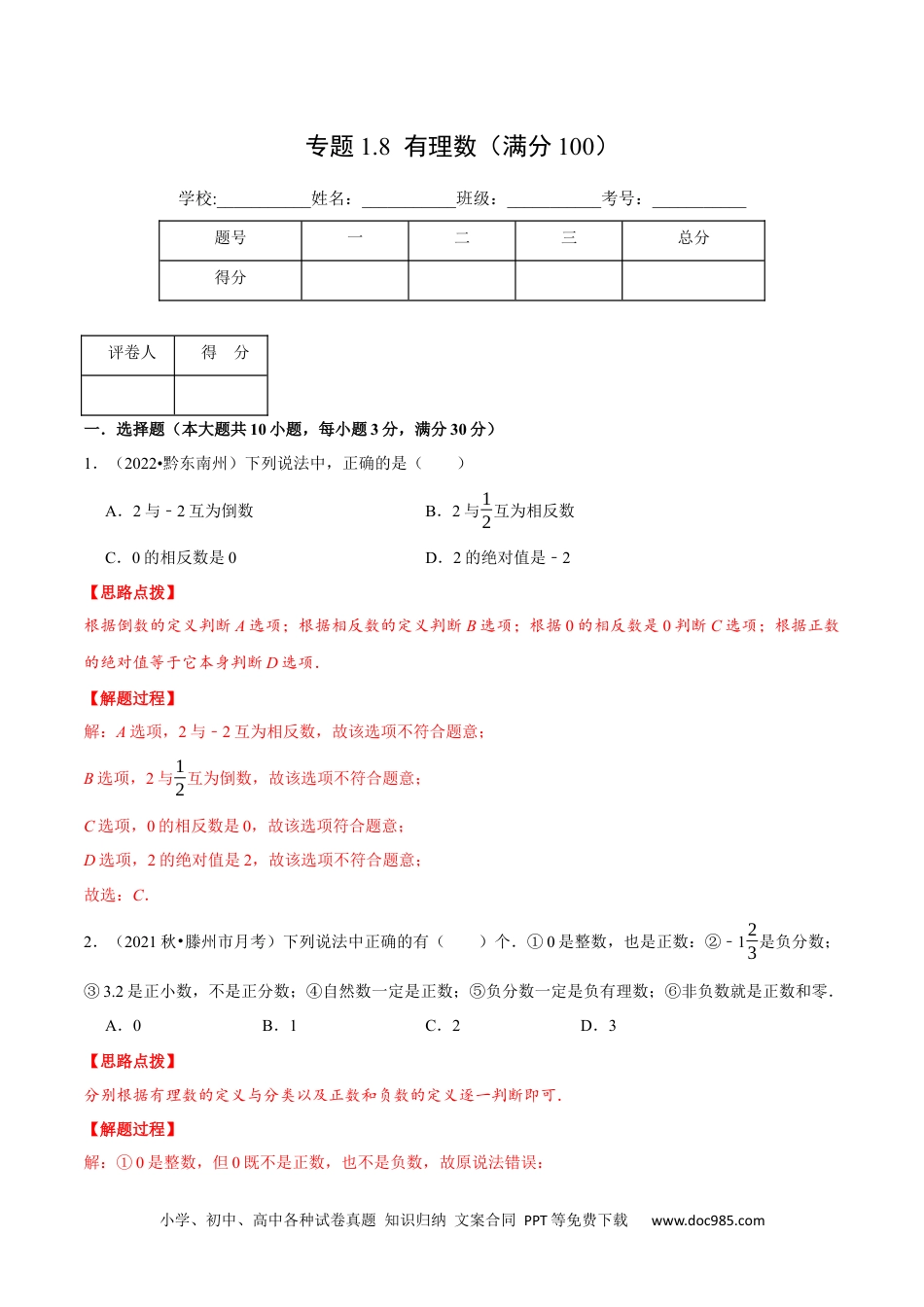 小学、初中、高中各种试卷真题知识归纳文案合同PPT等免费下载www.doc985.com专题1.8有理数(满分100)学校:___________姓名:___________班级:___________考号:___________题号一二三总分得分评卷人得分一.选择题(本大题共10小题,每小题3分,满分30分)1.(2022•黔东南州)下列说法中,正确的是()A.2与﹣2互为倒数B.2与12互为相反数C.0的相反数是0D.2的绝对值是﹣2【思路点拨】根据倒数的定义判断A选项;根据相反数的定义判断B选项;根据0的相反数是0判断C选项;根据正数的绝对值等于它本身判断D选项.【解题过程】解:A选项,2与﹣2互为相反数,故该选项不符合题意;B选项,2与12互为倒数,故该选项不符合题意;C选项,0的相反数是0,故该选项符合题意;D选项,2的绝对值是2,故该选项不符合题意;故选:C.2.(2021秋•滕州市月考)下列说法中正确的有()个.①0是整数,也是正数:②﹣123是负分数;③3.2是正小数,不是正分数;④自然数一定是正数;⑤负分数一定是负有理数;⑥非负数就是正数和零.A.0B.1C.2D.3【思路点拨】分别根据有理数的定义与分类以及正数和负数的定义逐一判断即可.【解题过程】解:①0是整数,但0既不是正数,也不是负数,故原说法错误:小学、初中、高中各种试卷真题知识归纳文案合同PPT等免费下载www.doc985.com②﹣123是负分数,说法正确;③3.2是正小数,也是正分数,故原说法错误;④自然数一定是正数,说法错误,0是自然数,但0既不是正数,也不是负数;⑤负分数一定是负有理数,说法正确;⑥非负数就是正数和零,说法正确.所以说法中正确的有3个.故选:D.3.(2022春•东台市月考)某种细胞开始分裂时有两个,1小时后分裂成4个并死去一个,2小时后分裂成6个并死去一个,3小时后分裂成10个并死去一个,按此规律,8小时后细胞存活的个数是()A.253B.255C.257D.259【思路点拨】根据题意,n个小时后细胞存活的个数是2n+1,求出n=8时的值即可.【解题过程】解:根据题意,1小时后分裂成4个并死去1个,剩3个,3=2+1;2小时后分裂成6个并死去1个,剩5个,5=22+1;3小时后分裂成10个并死去一个,剩9个,9=23+1;……n个小时后细胞存活的个数是2n+1,当n=8时,存活个数是28+1=257.故选:C.4.(2021秋•新华区校级期中)若a,b互为相反数,且ab≠0,c、d互为倒数,|m|=2,则(a+b)2021+(ba)33﹣cd+2m的值()A.0B.0或﹣8C.﹣2成6D.2或﹣6【思路点拨】根据相反数、倒数、绝对值得出a+b=0,ba=−1,cd=1,m=±2,代入求出即可.【解题过程】解: a、b互为相反数,且ab≠0,c、d互为倒数,|m|=2,小学、初中、高中各种试卷真题知识归纳文案合同PPT等免费下载www.doc985.com∴a+b=0,ba=−1,cd=1,m=±2,当m=2时,(a+b)2021+(ba)33﹣cd+2m=02021+(﹣1)33×1+2×2﹣=013+4﹣﹣=0,当m=﹣2时,(a+b)2021+(ba)33﹣cd+2m=02021+(﹣1)33×1+2×﹣(﹣2)=0134﹣﹣﹣=﹣8.故(a+b)2021+(ba)33﹣cd+2m的值是0或﹣8.故选:B.5.(2020秋•江阴市校级月考)电子跳蚤落在数轴上的某点K0,第一步从K0向左跳1个单位到K1,第二步由K1向右跳2个单位到K2,第三步由K2向左跳3个单位到K3,第四步由K3跳4个单位到K4,…,按以上规律跳了100步时,电子跳蚤落在数轴上的点K100所表示的数恰是30,则电子跳蚤的初始位置K0点所表示的数为()A.﹣26B.﹣20C.﹣30D.30【思路点拨】设电子跳蚤落在数轴上的某点K0=a,规定向左为负,向右为正,根据题意列出方程,再进一步根据有理数的加法法则进行计算.【解题过程】解:设电子跳蚤落在数轴上的某点K0=a,规定向左为负,向右为正.根据题意,得a1+23+4…+100﹣﹣﹣=30,a+(21﹣)+…+(10099﹣)=30,a+50=30,a=﹣20.故选:B.6.(2022•钟山县模拟)计算:1+12+122+123+124+⋯⋯+1299+12100结果是()A.1−12100B.1−12101C.2−12100D.2−12101【思路点拨】根据2×(12+122+123+124+⋯⋯+1299+12100)=1+12+122+123+124+⋯⋯+1299,可得小学、初中、高中各种试卷真题知识归纳文案合同PPT等免费下载www.doc985.com12+122+123+124+⋯⋯...