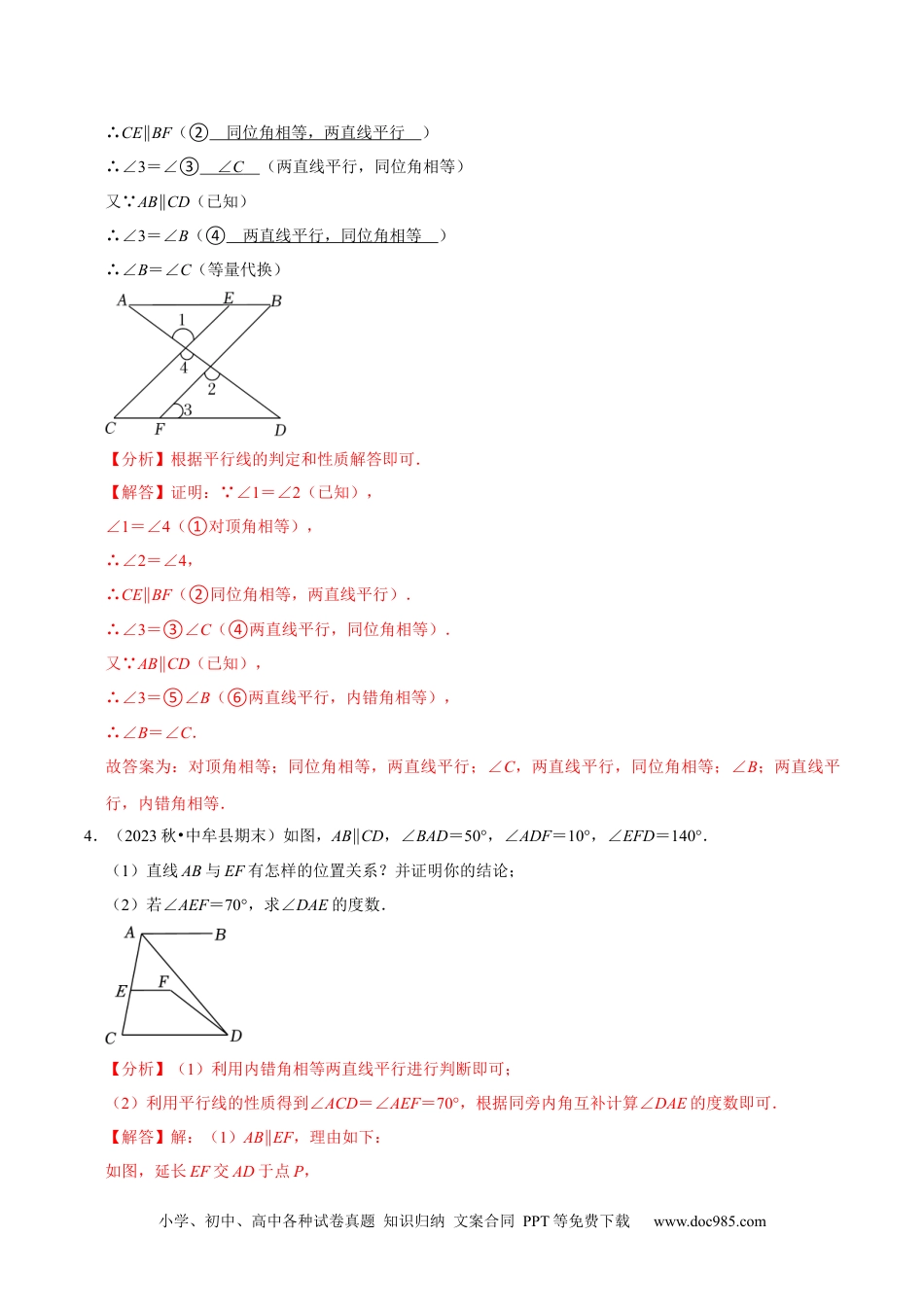 小学、初中、高中各种试卷真题知识归纳文案合同PPT等免费下载www.doc985.com七年级下学期【平行线的判定与性质30题专训】一.解答题(共30小题)1.(2024•江夏区校级模拟)已知:如图,点D,E,F分别是三角形ABC的边BC,CA,AB上的点,DF∥CA,∠FDE=∠A;(1)求证:DE∥BA.(2)若∠BFD=∠BDF=2∠EDC,求∠B的度数.【分析】(1)根据平行线的性质与判定方法证明即可;(2)设∠EDC=x°,由∠BFD=∠BDF=2∠EDC可得∠BFD=∠BDF=2x°,根据平行线的性质可得∠DFB=∠FDE=2x°,再根据平角的定义列方程可得x的值,进而得出∠B的度数.【解答】解:(1)证明: DF∥CA,∴∠DFB=∠A,又 ∠FDE=∠A,∴∠DFB=∠FDE,∴DE∥AB;(2)设∠EDC=x°, ∠BFD=∠BDF=2∠EDC,∴∠BFD=∠BDF=2x°,由(1)可知DE∥BA,∴∠DFB=∠FDE=2x°,∴∠BDF+∠EDF+∠EDC=2x°+2x°+x°=180°,∴x=36,又 DE∥AB,∴∠B=∠EDC=36°.2.(2023秋•遂平县期末)根据解答过程填空(理由或数学式):已知:如图,∠1+2∠=180°,∠3=∠B,求证:∠ACB=∠4.小学、初中、高中各种试卷真题知识归纳文案合同PPT等免费下载www.doc985.com证明: ∠1+∠DFE=180°(邻补角定义),又 ∠1+2∠=180°(已知),∴∠2=∠DFE(同角的补角相等),∴AB∥EF(内错角相等,两直线平行),∴∠3=∠ADE. ∠3=∠B(已知),∴∠B=∠ADE,∴DE∥BC(同位角相等,两直线平行),∴∠ACB=∠4(两直线平行,同位角相等).【分析】根据平行线的判定和性质定理证明即可.【解答】证明: ∠1+∠DFE=180°(邻补角定义),又 ∠1+2∠=180°(已知),∴∠2=∠DFE(同角的补角相等),∴AB∥EF(内错角相等,两直线平行),∴∠3=∠ADE(两直线平行,内错角相等),又 ∠3=∠B(已知),∴∠ADE=∠B,∴DE∥BC(同位角相等,两直线平行),∴∠ACB=∠4(两直线平行,同位角相等),故答案为:邻补角定义;同角的补角相等;内错角相等,两直线平行;ADE;ADE;同位角相等,两直线平行;两直线平行,同位角相等.3.(2023秋•安溪县期末)将下面的推理过程及依据补充完整.已知:如图,AB∥CD,点E在AB上,点F在CD上,∠1=∠2,求证:∠B=∠C.证明: ∠1=∠2(已知)∠1=∠4(①对顶角相等)∴∠2=∠4(等量代换)小学、初中、高中各种试卷真题知识归纳文案合同PPT等免费下载www.doc985.com∴CE∥BF(②同位角相等,两直线平行)∴∠3=∠③∠C(两直线平行,同位角相等)又 AB∥CD(已知)∴∠3=∠B(④两直线平行,同位角相等)∴∠B=∠C(等量代换)【分析】根据平行线的判定和性质解答即可.【解答】证明: ∠1=∠2(已知),∠1=∠4(①对顶角相等),∴∠2=∠4,∴CE∥BF(②同位角相等,两直线平行).∴∠3=③∠C(④两直线平行,同位角相等).又 AB∥CD(已知),∴∠3=⑤∠B(⑥两直线平行,内错角相等),∴∠B=∠C.故答案为:对顶角相等;同位角相等,两直线平行;∠C,两直线平行,同位角相等;∠B;两直线平行,内错角相等.4.(2023秋•中牟县期末)如图,AB∥CD,∠BAD=50°,∠ADF=10°,∠EFD=140°.(1)直线AB与EF有怎样的位置关系?并证明你的结论;(2)若∠AEF=70°,求∠DAE的度数.【分析】(1)利用内错角相等两直线平行进行判断即可;(2)利用平行线的性质得到∠ACD=∠AEF=70°,根据同旁内角互补计算∠DAE的度数即可.【解答】解:(1)AB∥EF,理由如下:如图,延长EF交AD于点P,小学、初中、高中各种试卷真题知识归纳文案合同PPT等免费下载www.doc985.com ∠EFD=∠EPD+∠ADF,∴∠EPD=∠EFD﹣∠ADF=140°10°﹣=130°,∴∠APE=180°﹣∠EPD=180°130°﹣=50°,∴∠APE=∠BAD,∴AB∥EF;(2) AB∥CD,AB∥EF,∴EF∥CD,∴∠ACD=∠AEF=70°,∴∠DAE=180°﹣∠ACD﹣∠ADC=180°70°50°﹣﹣=60°.5.(2024•兴宁区校级开学)如图,AB∥DG.(1)若AD是∠BAC的角平分线,∠BAD=35°,求∠DGC的度数;(2)若∠1=∠2,求证:AD∥EF.【分析】(1)利用角平分线的定义和平行线的性质即可得...