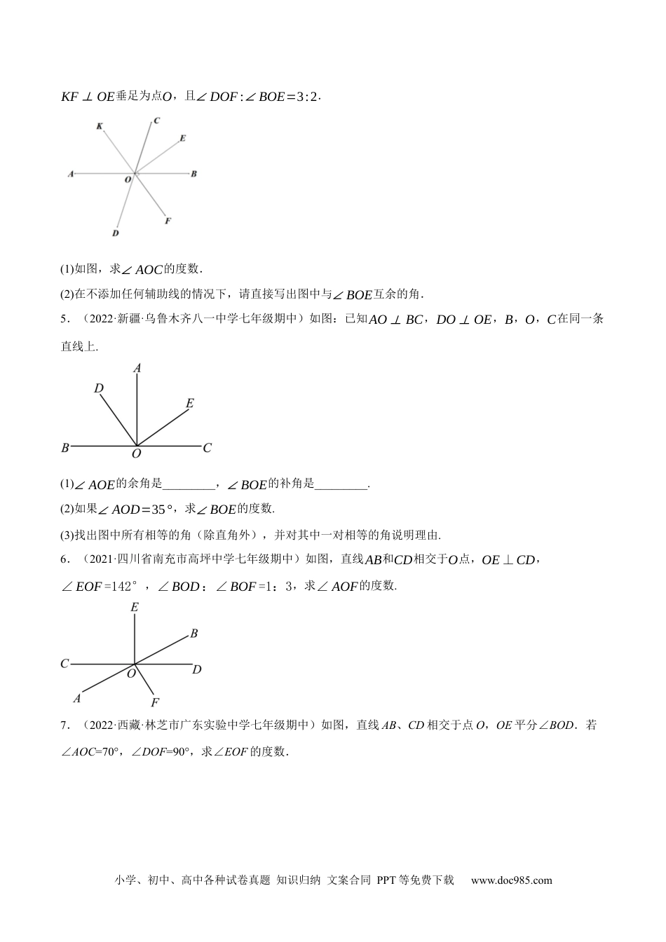 小学、初中、高中各种试卷真题知识归纳文案合同PPT等免费下载www.doc985.com【拔尖特训】2022-2023学年七年级数学下册尖子生培优必刷题【人教版】专题5.6相交线及其所组成的角大题专项提升训练(重难点培优30题)班级:___________________姓名:_________________得分:_______________一、解答题(本大题共30小题.解答时应写出文字说明、证明过程或演算步骤)1.(2022·浙江·七年级专题练习)如图,已知直线AB,CD相交于点O,∠COE=90°.(1)若∠AOC=37°,求∠BOE的度数.(2)若∠BOD:∠BOC=3:6,求∠AOE的度数.2.(2022·广东·东莞市石龙第二中学七年级期中)如图,直线AB,CD相交于O,OE是∠COB的角平分线.(1)∠AOC的对顶角是___________;(2)若∠BOC=130°,求∠BOD、∠DOE的度数.3.(2022·黑龙江·哈尔滨市第六十九中学校七年级期中)如图,直线AB、CD相交于点O,OD平分∠AOF,EO⊥OD,∠EOA=55°,求∠BOF的度数.4.(2022·黑龙江·哈尔滨德强学校七年级期中)如图,直线AB、CD相交于点O,OE平分∠BOC,小学、初中、高中各种试卷真题知识归纳文案合同PPT等免费下载www.doc985.comKF⊥OE垂足为点O,且∠DOF:∠BOE=3:2.(1)如图,求∠AOC的度数.(2)在不添加任何辅助线的情况下,请直接写出图中与∠BOE互余的角.5.(2022·新疆·乌鲁木齐八一中学七年级期中)如图:已知AO⊥BC,DO⊥OE,B,O,C在同一条直线上.(1)∠AOE的余角是_________,∠BOE的补角是_________.(2)如果∠AOD=35°,求∠BOE的度数.(3)找出图中所有相等的角(除直角外),并对其中一对相等的角说明理由.6.(2021·四川省南充市高坪中学七年级期中)如图,直线AB和CD相交于O点,OE⊥CD,∠EOF=142°,∠BOD:∠BOF=1:3,求∠AOF的度数.7.(2022·西藏·林芝市广东实验中学七年级期中)如图,直线AB、CD相交于点O,OE平分∠BOD.若∠AOC=70°,∠DOF=90°,求∠EOF的度数.小学、初中、高中各种试卷真题知识归纳文案合同PPT等免费下载www.doc985.com8.(2022·内蒙古·呼和浩特市第二十六中学七年级期中)如图,O是直线AB上一点,∠BOC=3∠AOC,OC平分∠AOD(1)求∠AOC的度数.(2)试猜想OD与AB的位置关系,并说明理由.9.(2021·河北·石家庄市长安区阳光未来实验学校七年级期中)如图,点O在直线AB上,∠COD=60°,∠AOE=2∠DOE.(1)若∠BOD=60°,求∠COE的度数;(2)试猜想∠BOD和∠COE的数量关系,并说明理由.10.(2022·重庆市江津第五中学校七年级期中)如图,直线AB、CD相交于点O,OE平分∠BOD,OF平分∠COE.(1)若∠AOC=76°,求∠BOF的度数;(2)若∠BOF=36°,求∠AOC的度数;小学、初中、高中各种试卷真题知识归纳文案合同PPT等免费下载www.doc985.com11.(2022·辽宁·大连高新技术产业园区普罗旺斯学校七年级期中)如图,直线AB、CD相交于点O,OE平分∠BOD,∠DOE=28°,且OE⊥OF.求∠AOC和∠AOF的度数.12.(2022·广东广州·七年级期中)如图,已知直线AB、CD相交于点O,OE平分∠BOD,OF平分∠BOC,∠2:∠1=4:1.(1)求∠AOF的度数.(2)判断OE与OF的位置关系并说明理由.13.(2022·四川·成都市盐道街中学外语学校七年级期中)如图,直线AB,CD相交于点O,OE平分∠BOD.(1)若∠EOF=55°,OD⊥OF,求∠AOC的度数;(2)若OF平分∠COE,∠BOF=15°,求∠DOE的度数.14.(2022·广东·大亚湾经开区三中七年级期中)如图,直线AB,CD相交于点O,EO⊥AB,垂足为O.若∠BOC=2∠AOC,求∠DOE的度数.小学、初中、高中各种试卷真题知识归纳文案合同PPT等免费下载www.doc985.com15.(2021·广东·东莞市松山湖实验中学七年级期中)如图,直线AB与CD相交于点O,EO⊥CD于点O,OF平分∠AOD,且∠BOE=50∘,求∠AOF的度数.16.(2022·山东滨州·七年级期中)如图,直线AB、CD相交于点O,∠DOE=∠BOD,OF平分∠AOE.(1)判断OF与OD的位置关系,并说明理由;(2)若∠AOC:∠AOD=1:5,求∠EOF的度数.17.(2022··七年级期末)如图,已知OB,OC,OD是∠AOE内三条射线,OB平分∠AOE,OD平分∠COE.(1)若∠AOB=70°,∠DOE=20°,求∠BOC的度数.(2)若∠AOE=136°,AO⊥CO,求∠...