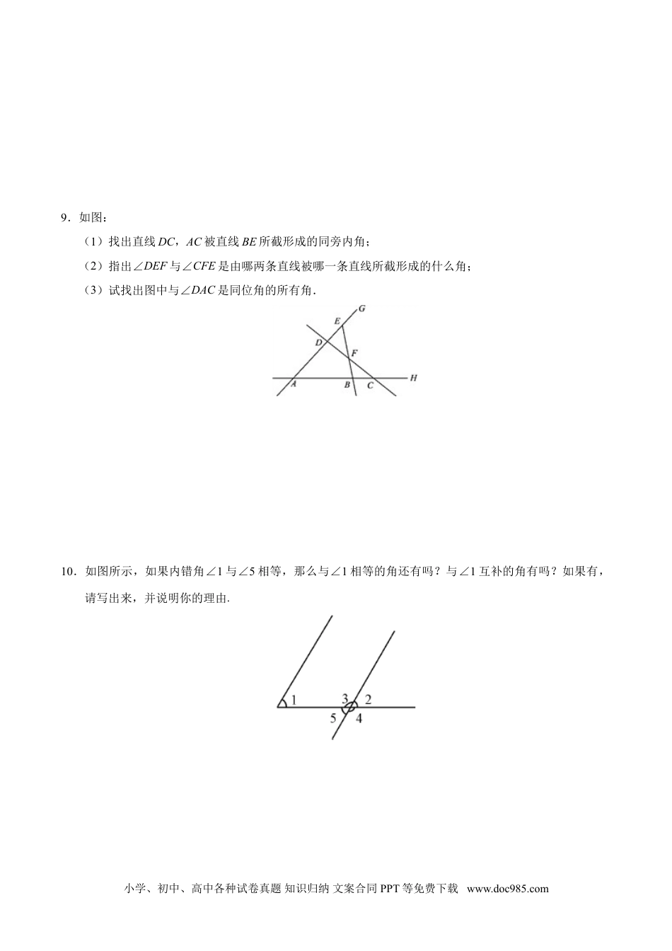 第五章相交线与平行线5.1.3同位角、内错角、同旁内角一、选择题:在每小题给出的四个选项中,只有一项是符合题目要求的.1.如图,以下说法正确的是A.∠1和∠2是内错角B.∠2和∠3是同位角C.∠1和∠3是内错角D.∠2和∠4是同旁内角2.如图,下列说法错误的是A.∠A与∠EDC是同位角B.∠A与∠ABF是内错角C.∠A与∠ADC是同旁内角D.∠A与∠C是同旁内角3.如图所示,∠1与∠2不是同位角的是A.B.C.D.4.如图,属于内错角的是小学、初中、高中各种试卷真题知识归纳文案合同PPT等免费下载www.doc985.comA.∠1和∠2B.∠2和∠3C.∠1和∠4D.∠3和∠45.∠1与∠2是直线a,b被直线c所截得的同位角,∠1与∠2的大小关系是A.∠1=∠2B.∠1>∠2C.∠1<∠2D.无法确定二、填空题:请将答案填在题中横线上.6.如图,如果∠2=100°,那么∠1的同位角等于__________,∠1的内错角等于__________,∠1的同旁内角等于__________.7.如图,∠ABC与__________是同位角;∠ADB与__________是内错角;∠ABC与__________是同旁内角.三、解答题:解答应写出文字说明、证明过程或演算步骤.8.如图,∠A与哪个角是内错角,与哪个角是同旁内角?它们分别是哪两条直线被哪一条直线所截形成的?小学、初中、高中各种试卷真题知识归纳文案合同PPT等免费下载www.doc985.com9.如图:(1)找出直线DC,AC被直线BE所截形成的同旁内角;(2)指出∠DEF与∠CFE是由哪两条直线被哪一条直线所截形成的什么角;(3)试找出图中与∠DAC是同位角的所有角.10.如图所示,如果内错角∠1与∠5相等,那么与∠1相等的角还有吗?与∠1互补的角有吗?如果有,请写出来,并说明你的理由.小学、初中、高中各种试卷真题知识归纳文案合同PPT等免费下载www.doc985.com小学、初中、高中各种试卷真题知识归纳文案合同PPT等免费下载www.doc985.com