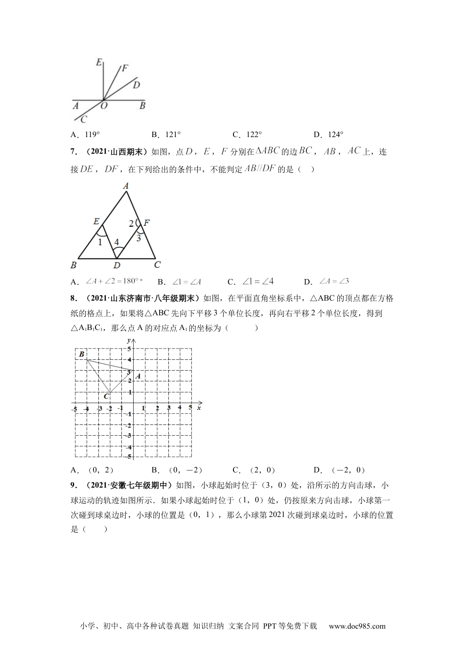 小学、初中、高中各种试卷真题知识归纳文案合同PPT等免费下载www.doc985.com期中押题卷(考试范围:第五-七章)拔卷选(考试时间:90分钟试卷满分:120分)一、选择题:本题共10个小题,每小题3分,共30分。在每小题给出的四个选项中,只有一项是符合题目要求的。1.(2021·河南八年级月考)下列说法中,正确的是()A.点到轴的距离是3B.在平面直角坐标系中,点和点表示同一个点C.若,则点在轴上D.在平面直角坐标系中,第三象限内的点的横坐标与纵坐标异号2.(2021•巴州区校级期中)如图,下列说法中错误的是()A.∠3和∠5是同位角B.∠4和∠5是同旁内角C.∠2和∠4是对顶角D.∠2和∠5是内错角3.(2021·安徽七年级期中)计算﹣﹣的结果为()A.4B.﹣4C.10D.﹣104.(2021·西宁市海湖中学七年级期中)下列说法:①任何数都有算术平方根;②一个数的算术平方根一定是正数;③(π-4)2的算术平方根是π-4;④算术平方根不可能是负数,其中不正确的有()A.1个B.2个C.3个D.4个5.(2021·山西浑源初二期中)下列各式正确的是()A.B.C.D.6.(2021·四川南充·七年级期末)如图,直线AB,CD相交于点O,OE⊥AB于O,OF平分∠DOE,若∠AOC=32°,则∠AOF的度数为()小学、初中、高中各种试卷真题知识归纳文案合同PPT等免费下载www.doc985.comA.119°B.121°C.122°D.124°7.(2021·山西期末)如图,点,,分别在的边,,上,连接,,在下列给出的条件中,不能判定的是()A.°B.C.D.8.(2021·山东济南市·八年级期末)如图,在平面直角坐标系中,△ABC的顶点都在方格纸的格点上,如果将△ABC先向下平移3个单位长度,再向右平移2个单位长度,得到△A1B1C1,那么点A的对应点A1的坐标为()A.(0,2)B.(0,-2)C.(2,0)D.(-2,0)9.(2021·安徽七年级期中)如图,小球起始时位于(3,0)处,沿所示的方向击球,小球运动的轨迹如图所示.如果小球起始时位于(1,0)处,仍按原来方向击球,小球第一次碰到球桌边时,小球的位置是(0,1),那么小球第2021次碰到球桌边时,小球的位置是()小学、初中、高中各种试卷真题知识归纳文案合同PPT等免费下载www.doc985.comA.(3,4)B.(5,4)C.(7,0)D.(8,1)10.(2021·河南沁阳·初一期末)已知,∠EAF=∠EAB,∠ECF=∠ECD,若∠E=66°,则∠F为()A.23°B.33°C.44°D.46°二、填空题:本题共8个小题,每题3分,共24分。11.(2021·浙江绍兴市·八年级其他模拟)命题“对顶角相等”的题设是________.结论是__________.12.(2021·四川省绵阳外国语学校八年级期中)已知a2+=4a4﹣,则的平方根是______.13.(2021·牡丹江市田家炳实验中学初一期中)给出下列说法:(1)两条直线被第三条直线所截,同位角相等;(2)平面内的一条直线和两条平行线中的一条相交,则它与另一条也相交;(3)相等的两个角是对顶角;(4)三条直线两两相交,有三个交点;(5)若a⊥b,b⊥c,则a⊥c.其中正确的有________个14.(2021·浙江绍兴市·八年级期末)若点B(7a+14,a-3)在第四象限,则a的取值范围是______.15.(2021·江西南昌·七年级期中)已知,,若,则的值为____________.16.(2021·台州市书生中学八年级开学考试)第一象限内有两点,,将线段平移,使平移后的点、都在坐标轴上,则点平移后的对应点的坐标是_________.17.(2021·黑龙江·哈尔滨市第四十七中学七年级期中)如图,已知直线l1∥l2,∠A=125°,∠B=85°,且∠1比∠2大4°,那么∠1=______.5.2172.28452.177.22372.23xx4,Pmn,2QmnPQPQP小学、初中、高中各种试卷真题知识归纳文案合同PPT等免费下载www.doc985.com18.(2021·重庆南开中学八年级开学考试)如图,在中,,在边上取点,使得,连接.点、分别为、边上的点,且,将沿直线翻折,使点落在边上的点处,若,则的度数为_______.三、解答题:本题共8个小题,19-24每题8分,25-26每题9分,共66分。19.(2021·浙江绍兴市·八年级期末)如图,在平面直角坐标系中,的顶点坐标分别为,把向右平移3个单位,再向上平移4个单...
