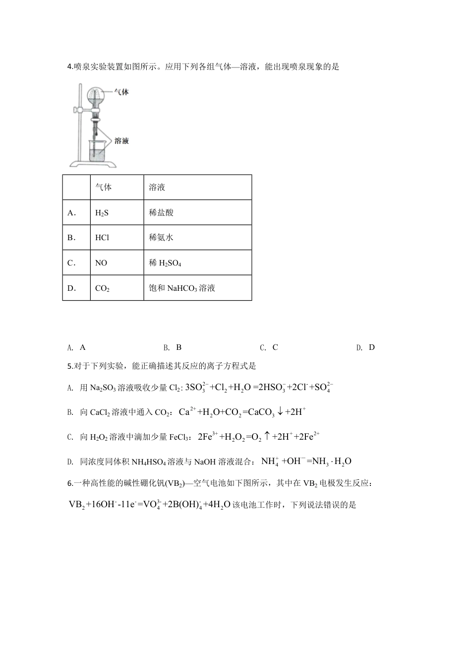2020年普通高等学校招生全国统一考试理科综合能力测试化学可能用到的相对原子质量:H1C12N14O16Mg24S32Fe56Cu64一、选择题:在每小题给出的四个选项中,只有一项是符合题目要求的。1.宋代《千里江山图》描绘了山清水秀的美丽景色,历经千年色彩依然,其中绿色来自孔雀石颜料(主要成分为Cu(OH)2·CuCO3),青色来自蓝铜矿颜料(主要成分为Cu(OH)2·2CuCO3)。下列说法错误的是A.保存《千里江山图》需控制温度和湿度B.孔雀石、蓝铜矿颜料不易被空气氧化C.孔雀石、蓝铜矿颜料耐酸耐碱D.Cu(OH)2·CuCO3中铜的质量分数高于Cu(OH)2·2CuCO32.金丝桃苷是从中药材中提取的一种具有抗病毒作用的黄酮类化合物,结构式如下:下列关于金丝桃苷的叙述,错误的是A.可与氢气发生加成反应B.分子含21个碳原子C.能与乙酸发生酯化反应D.不能与金属钠反应3.NA是阿伏加德罗常数的值。下列说法正确的是A.22.4L(标准状况)氮气中含有7NA个中子B1mol重水比1mol水多NA个质子C.12g石墨烯和12g金刚石均含有NA个碳原子D.1L1mol·L−1NaCl溶液含有28NA个电子4.喷泉实验装置如图所示。应用下列各组气体—溶液,能出现喷泉现象的是气体溶液A.H2S稀盐酸B.HCl稀氨水C.NO稀H2SO4D.CO2饱和NaHCO3溶液A.AB.BC.CD.D5.对于下列实验,能正确描述其反应的离子方程式是A.用Na2SO3溶液吸收少量Cl2:2-2322343SO+Cl+HO=2HSO+2Cl+SOB.向CaCl2溶液中通入CO2:2++223Ca+HO+CO=CaCO+2HC.向H2O2溶液中滴加少量FeCl3:3++2+2222Fe+HO=O+2H+2FeD.同浓度同体积NH4HSO4溶液与NaOH溶液混合:+4NH32+OH=NHHO-6.一种高性能的碱性硼化钒(VB2)—空气电池如下图所示,其中在VB2电极发生反应:该电池工作时,下列说法错误的是--3--2442VB+16OH-11e=VO+2B(OH)+4HOA.负载通过0.04mol电子时,有0.224L(标准状况)O2参与反应B.正极区溶液的pH降低、负极区溶液的pH升高C.电池总反应为3222444VB11O20OH6HO8B(OH)4VOD.电流由复合碳电极经负载、VB2电极、KOH溶液回到复合碳电极7.W、X、Y、Z为原子序数依次增大的短周期元素,四种元素的核外电子总数满足X+Y=W+Z;化合物XW3与WZ相遇会产生白烟。下列叙述正确的是A.非金属性:W>X>Y>ZB.原子半径:Z>Y>X>WC.元素X的含氧酸均为强酸D.Y的氧化物水化物为强碱二、非选择题(一)必考题8.氯可形成多种含氧酸盐,广泛应用于杀菌、消毒及化工领域。实验室中利用下图装置(部分装置省略)制备KClO3和NaClO,探究其氧化还原性质。回答下列问题:(1)盛放MnO2粉末的仪器名称是________,a中的试剂为________。(2)b中采用的加热方式是_________,c中化学反应的离子方程式是________________,采用冰水浴冷却的目的是____________。(3)d的作用是________,可选用试剂________(填标号)。A.Na2SB.NaClC.Ca(OH)2D.H2SO4(4)反应结束后,取出b中试管,经冷却结晶,________,__________,干燥,得到KClO3晶体。(5)取少量KClO3和NaClO溶液分别置于1号和2号试管中,滴加中性KI溶液。1号试管溶液颜色不变。2号试管溶液变为棕色,加入CCl4振荡,静置后CCl4层显____色。可知该条件下KClO3的氧化能力____NaClO(填“大于”或“小于”)。9.某油脂厂废弃的油脂加氢镍催化剂主要含金属Ni、Al、Fe及其氧化物,还有少量其他不溶性物质。采用如下工艺流程回收其中的镍制备硫酸镍晶体(NiSO4·7H2O):溶液中金属离子开始沉淀和完全沉淀的pH如下表所示:金属离子Ni2+Al3+Fe3+Fe2+开始沉淀时(c=0.01mol·L−1)的pH沉淀完全时(c=1.0×10−5mol·L−1)的pH7.28.73.74.72.23.27.59.0回答下列问题:(1)“碱浸”中NaOH的两个作用分别是______________。为回收金属,用稀硫酸将“滤液①”调为中性,生成沉淀。写出该反应的离子方程式______________。(2)“滤液②”中含有的金属离子是______________。(3)“转化”中可替代H2O2的物质是______________。若工艺流程改为先“调pH”后“转化”,即“滤液③”中可能含有的杂质离子为______________。(4)利用上述表格数据,计算Ni(OH)2的Ksp=______________(列出计算式)。如果“转化”后的溶液中Ni2+浓度为1.0mol·L−1,则“调pH”应控制的pH范围是______________。(5)硫酸镍在...