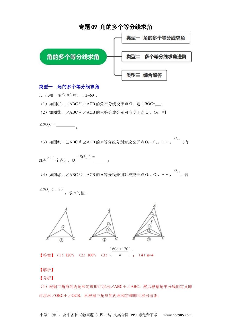 小学、初中、高中各种试卷真题知识归纳文案合同PPT等免费下载www.doc985.com专题09角的多个等分线求角类型一角的多个等分线求角1.已知,在中,∠A=60°,(1)如图①,∠ABC和∠ACB的角平分线交于点O,则∠BOC=;(2)如图②,∠ABC和∠ACB的三等分线分别对应交于点O1,O2,则;(3)如图③,∠ABC和∠ACB的n等分线分别对应交于点O1,O2,……,(内部有个点),则;(4)如图③,∠ABC和∠ACB的n等分线分别对应交于点O1,O2,……,,若,求n的值.【答案】(1)120°;(2)100°;(3);(4)n=4【解析】【分析】(1)根据三角形的内角和定理即可求出∠ABC+∠ABC,然后根据角平分线的定义即可求出∠OBC+∠OCB,再根据三角形的内角和定理即可求出结论;小学、初中、高中各种试卷真题知识归纳文案合同PPT等免费下载www.doc985.com(2)根据三角形的内角和定理即可求出∠ABC+∠ABC,然后根据三等分线的定义即可求出∠O2BC+∠O2CB,再根据三角形的内角和定理即可求出结论;(3)根据三角形的内角和定理即可求出∠ABC+∠ABC,然后根据n等分线的定义即可求出∠On-1BC+∠On-1CB,再根据三角形的内角和定理即可求出结论;(4)根据(3)的结论列出方程即可求出结论.【详解】解:(1) 在中,∠A=60°,∴∠ABC+∠ABC=180°-∠A=120° ∠ABC和∠ACB的角平分线交于点O,∴∠OBC=ABC∠,∠OCB=ACB∠∴∠OBC+∠OCB=ABC∠+∠ACB=(∠ABC+∠ACB)=60°∴∠BOC=180°-(∠OBC+∠OCB)=120°故答案为:120°.(2) 在中,∠A=60°,∴∠ABC+∠ABC=180°-∠A=120° ∠ABC和∠ACB的三等分线分别对应交于点O1,O2,∴∠O2BC=ABC∠,∠O2CB=ACB∠∴∠O2BC+∠O2CB=ABC∠+∠ACB=(∠ABC+∠ACB)=80°∴180°-(∠O2BC+∠O2CB)=100°故答案为:100°.(3) 在中,∠A=60°,∴∠ABC+∠ABC=180°-∠A=120° ∠ABC和∠ACB的n等分线分别对应交于点O1,O2,……,小学、初中、高中各种试卷真题知识归纳文案合同PPT等免费下载www.doc985.com∴∠On-1BC=ABC∠,∠On-1CB=ACB∠∴∠On-1BC+∠On-1CB=ABC∠+∠ACB=(∠ABC+∠ACB)=°∴180°-(∠O2BC+∠O2CB)=故答案为:(4)由(3)知:∴解得:n=4经检验:n=4是原方程的解.【点睛】本题考查了n等分线的定义和三角形的内角和定理,掌握n等分线的定义和三角形的内角和定理是解决此题的关键.2.如图,∠A=120°,且∠1=∠2=∠3和∠4=∠5=∠6,则∠BDC=()A.120°B.60°C.140°D.无法确定【答案】C【解析】【分析】根据三角形内角和定理,即可得到∠ABC+∠ACB=180°120°﹣=60°,再根据∠1=∠2=∠3,∠4=∠5=∠6,即可得到∠DBC+∠DCB的度数,最后利用三角形内角和定理可得∠BDC的度数.小学、初中、高中各种试卷真题知识归纳文案合同PPT等免费下载www.doc985.com【详解】解:在△ABC中, ∠A=120°,∴∠ABC+∠ACB=180°120°﹣=60°,又 ∠1=∠2=∠3,∠4=∠5=∠6,∴∠DBC+∠DCB=×60°=40°,∴∠BDC=180°40°﹣=140°.故选C.【点睛】此题考查三角形的内角和,解题时注意:三角形内角和是180°.3.如图,在中,,与的角平分线交于,与的角平分线交于点,依此类推,与的角平分线交于点,则的度数是()A.B.C.D.【答案】B【解析】【分析】根据题意可得∠ABC+ACB=160°∠,BD1,CD1,CD2,BD2…BDn,CDn是角平分线,可得∠ABDn+ACD∠n=160×()n,可求∠BCDn+CBD∠n的值,再根据三角形内角和定理可求结果.【详解】解: ∠A=20°,∠A+ABC+ACB=180°∠∠,∴∠ABC+ACB=160°∠, BD1平分∠ABC,CD1平分∠ACB,小学、初中、高中各种试卷真题知识归纳文案合同PPT等免费下载www.doc985.com∴∠ABD1=ABC∠,∠ACD1=ACD∠, BD2平分∠ABD1,CD2平分∠ACD1,∴∠ABD2=ABD∠1=ABC∠,∠ACD2=ACD∠1=ACB∠,同理可得∠ABD5=ABC∠,∠ACD5=ACB∠,∴∠ABD5+ACD∠5=160×=5°,∴∠BCD5+CBD∠5=155°,∴∠BD5C=180-BCD∠5-CBD∠5=25°,故选B.【点睛】本题考查了三角形内角和定理,角平分线,关键是找出其中的规律,利用规律解决问题.4.如图,在△ABC中,∠A=20°,∠ABC...