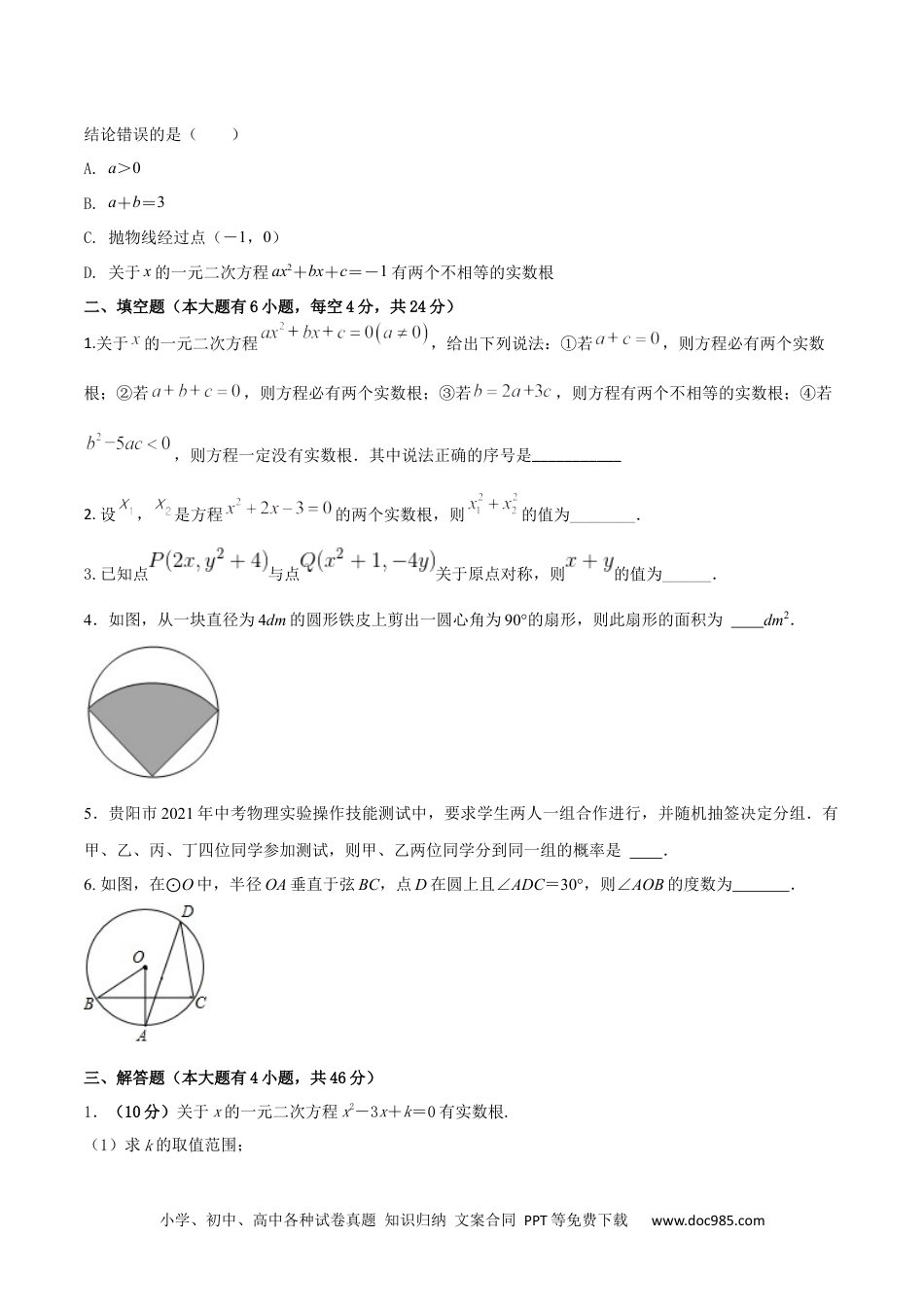 小学、初中、高中各种试卷真题知识归纳文案合同PPT等免费下载www.doc985.com2023-2024人教版九年数学上册期末考试核心素养达标检测试卷十套(解析版)2023-2024人教版九年数学上册期末考试核心素养达标检测试卷(01)(满分100分,答题时间90分钟)一、选择题(本大题有10小题,每小题3分,共30分)1.下列图形中,既是中心对称图形又是轴对称图形的是()A.B.C.D.2.已知点P(m-3,m-1)关于原点对称的点P'在第四象限,则m的取值范围在数轴上表示正确的是()3.已知方程x2+mx+3=0的一个根是1,则m的值为()A.4B.﹣4C.3D.﹣34.方程2x2+6x-1=0的两根为x1、x2,则x1+x2等于()A.-6B.6C.-3D.35.某市2018年底森林覆盖率为63%.为贯彻落实“绿水青山就是金山银山”的发展理念,该市大力开展植树造林活动,2020年底森林覆盖率达到68%,如果这两年森林覆盖率的年平均增长率为x,那么,符合题意的方程是()A.B.C.D.6.(2023四川成都)为贯彻教育部《大中小学劳动教育指导纲要(试行)》文件精神,某学校积极开设种植类劳动教育课.某班决定每位学生随机抽取一张卡片来确定自己的种植项目,老师提供6张背面完全相同的卡片,其中蔬菜类有4张,正面分别印有白菜、辣椒、豇豆、茄子图案;水果类有2张,正面分别印有草莓、西瓜图案,每个图案对应该种植项目.把这6张卡片背面朝上洗匀,小明随机抽取一张,他恰好抽中水果类卡片的概率是()A.B.C.D.小学、初中、高中各种试卷真题知识归纳文案合同PPT等免费下载www.doc985.com7.如图,内接于,CD是的直径,,则()A.70°B.60°C.50°D.40°8.如图,AB是⊙O的直径,PA与⊙O相切于点A,∠ABC=25°,OC的延长线交PA于点P,则∠P的度数是()A.25°B.35°C.40°D.50°9.如图所示的曲边三角形可按下述方法作出:作等边,分别以点A,B,C为圆心,以长为半径作,,,三弧所围成的图形就是一个曲边三角形.如果一个曲边三角形的周长为,则此曲边三角形的面积为()A.B.C.D.10.已知抛物线y=ax2+bx+c(a0)经过点(1,0)和点(0,-3),且对称轴在y轴的左侧,则下列小学、初中、高中各种试卷真题知识归纳文案合同PPT等免费下载www.doc985.com结论错误的是()A.a>0B.a+b=3C.抛物线经过点(-1,0)D.关于x的一元二次方程ax2+bx+c=-1有两个不相等的实数根二、填空题(本大题有6小题,每空4分,共24分)1.关于的一元二次方程,给出下列说法:①若,则方程必有两个实数根;②若,则方程必有两个实数根;③若,则方程有两个不相等的实数根;④若,则方程一定没有实数根.其中说法正确的序号是___________2.设,是方程的两个实数根,则的值为________.3.已知点与点关于原点对称,则的值为______.4.如图,从一块直径为4dm的圆形铁皮上剪出一圆心角为90°的扇形,则此扇形的面积为dm2.5.贵阳市2021年中考物理实验操作技能测试中,要求学生两人一组合作进行,并随机抽签决定分组.有甲、乙、丙、丁四位同学参加测试,则甲、乙两位同学分到同一组的概率是.6.如图,在⊙O中,半径OA垂直于弦BC,点D在圆上且∠ADC=30°,则∠AOB的度数为.三、解答题(本大题有4小题,共46分)1.(10分)关于x的一元二次方程x2-3x+k=0有实数根.(1)求k的取值范围;小学、初中、高中各种试卷真题知识归纳文案合同PPT等免费下载www.doc985.com(2)如果k是符合条件的最大整数,且一元二次方程(m-1)x2+x+m-3=0与方程x2-3x+k=0有一个相同的根,求此时m的值.2.(6分)某医院计划选派护士支援某地的防疫工作,甲、乙、丙、丁4名护士积极报名参加,其中甲是共青团员,其余3人均是共产党员.医院决定用随机抽取的方式确定人选.(1)“随机抽取1人,甲恰好被抽中”是______事件;A.不可能B.必然C.随机(2)若需从这4名护士中随机抽取2人,请用画树状图法或列表法求出被抽到的两名护士都是共产党员的概率.3.(12分)已知:点与点关于原点对称.(1)分别求a,b的值;(2)求点A关于x轴的对称点的坐标;(3)求点B关于y轴的对称点的坐标.4.(18分)在平面直角坐标系中,抛物线与轴交于点,(点在点的左侧),与轴交于点,且点的坐标为.(1)求点的坐标;(2)如...