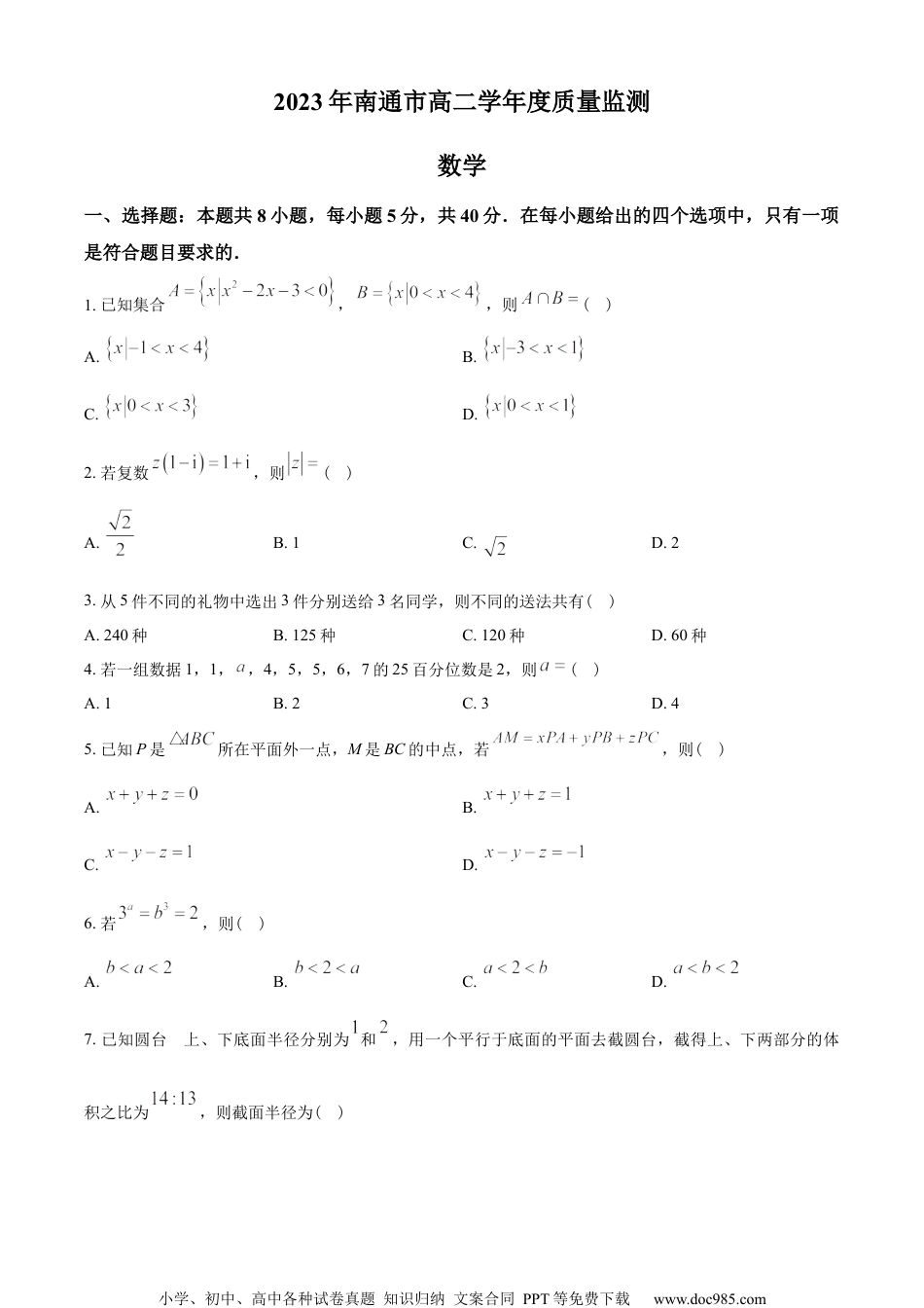 小学、初中、高中各种试卷真题知识归纳文案合同PPT等免费下载www.doc985.com2023年南通市高二学年度质量监测数学一、选择题:本题共8小题,每小题5分,共40分.在每小题给出的四个选项中,只有一项是符合题目要求的.1.已知集合,,则()A.B.C.D.2.若复数,则()A.B.1C.D.23.从5件不同的礼物中选出3件分别送给3名同学,则不同的送法共有()A.240种B.125种C.120种D.60种4.若一组数据1,1,,4,5,5,6,7的25百分位数是2,则()A.1B.2C.3D.45.已知P是所在平面外一点,M是BC的中点,若,则()A.B.C.D.6.若,则()A.B.C.D.7.已知圆台的上、下底面半径分别为和,用一个平行于底面的平面去截圆台,截得上、下两部分的体积之比为,则截面半径为()小学、初中、高中各种试卷真题知识归纳文案合同PPT等免费下载www.doc985.comA.B.C.D.8.已知函数若函数有五个零点,则实数的取值范围是()A.B.C.D.二、选择题:本题共4小题,每小题5分,共20分.在每小题给出的选项中,有多项符合题目要求.全部选对的得5分,部分选对的得2分,有选错的得0分.9.已知,则()A.B.C.D.10.已知正方体,则()A.平面平面B.平面C.与所成角为D.与平面所成角为11.已知是定义在上的奇函数,,当时,,则()A.B.C.D.12.某农业种植基地在三块实验地种植同一品种的苹果,甲地块产出苹果中一级果个数占75%,乙地块产出苹果中一级果个数占60%,丙地块产出苹果中一级果个数占80%.已知甲、乙、丙地块产出的苹果个数之比为2:5:3,现将三个地块产出的苹果混放一堆,则下列说法正确的是()A.任取一个苹果是甲地块产出的概率为0.2B.任取一个苹果是甲地块产出的一级果的概率为0.75C.任取一个苹果是一级果的概率为0.69小学、初中、高中各种试卷真题知识归纳文案合同PPT等免费下载www.doc985.comD.如果取到的一个苹果是一级果,则其是由甲地块产出的概率为三、填空题:本题共4小题,每小题5分,共20分.13.如果随机变量,且,则________.14.已知向量,,若,则实数________.15.若函数与的图象有一条与直线平行的公共切线,则______.16.已知直线与曲线和都相切,请写出符合条件的两条直线的方程:________,________.四、解答题:本题共6小题,共70分.解答时应写出文字说明、证明过程或演算步骤.17.有8个相同的小球,上面分别标有数字1,2,3,4,5,6,7,8,“从中任取一个小球,球的数字是奇数”记为事件A,“从中任取一个小球,球的数字是3的倍数”记为事件B.(1)试判断A,B是否为相互独立事件,并说明理由;(2)求.18.如图,在正三棱柱中,D为的中点.(1)求证:;(2)若,,求点B到平面的距离.19.已知函数,.(1)若,解关于的不等式;小学、初中、高中各种试卷真题知识归纳文案合同PPT等免费下载www.doc985.com(2)若函数的最小值为-4,求m的值.20.“使用动物做医学实验是正确的,这样做能够挽救人的生命”.一机构为了解成年人对这种说法的态度(态度分为同意和不同意),在某市随机调查了200位成年人,得到如下数据:男性女性合计同意7050120不同意305080合计100100200(1)能否有99%的把握认为成年人对该说法的态度与性别有关?(2)将频率视为概率,用样本估计总体.若从该市成年人中,随机抽取3人了解其对该说法的态度,记抽取的3人中持同意的人数为X,求X的分布列和数学期望.附:,0.0250.0100.0055.0246.6357.87921.如图,在三棱锥中,,D是AC的中点,E是AB上一点,平面PDE.(1)证明:平面PBC;(2)若,,求二面角的正弦值.小学、初中、高中各种试卷真题知识归纳文案合同PPT等免费下载www.doc985.com22.已知函数,.(1)当时,求函数的极值;(2)当时,,求的取值范围.