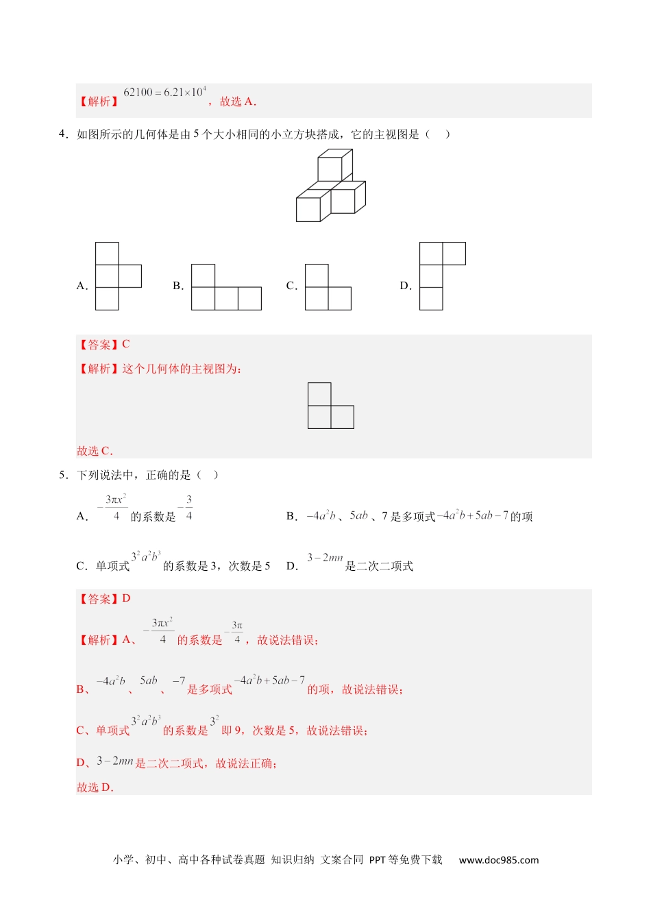 小学、初中、高中各种试卷真题知识归纳文案合同PPT等免费下载www.doc985.com2024-2025学年七年级数学上学期期末模拟卷(考试时间:120分钟,分值:120分)注意事项:1.答卷前,考生务必将自己的姓名、准考证号填写在答题卡上。2.回答选择题时,选出每小题答案后,用2B铅笔把答题卡上对应题目的答案标号涂黑。如需改动,用橡皮擦干净后,再选涂其他答案标号。写在本试卷上无效。回答非选择题时,将答案写在答题卡上。写在本试卷上无效。3.测试范围:华东师大版七年级上册。4.难度系数:0.65。第Ⅰ卷一、选择题:本题共12小题,每小题3分,共36分。1.的绝对值是()A.B.4C.D.0【答案】B【解析】由题意,得,故选B.2.下列各数最大的是()A.B.C.0D.1【答案】D【解析】 ,∴最大的数是1.故选D.3.2024年中秋假期第二天,据成都东部新区世园会运营部统计,全天累计入园达62100人次.62100用科学记数法表示为()A.B.C.D.【答案】A小学、初中、高中各种试卷真题知识归纳文案合同PPT等免费下载www.doc985.com【解析】,故选A.4.如图所示的几何体是由5个大小相同的小立方块搭成,它的主视图是()A.B.C.D.【答案】C【解析】这个几何体的主视图为:故选C.5.下列说法中,正确的是()A.的系数是B.、、7是多项式的项C.单项式的系数是3,次数是5D.是二次二项式【答案】D【解析】A、的系数是,故说法错误;B、、、是多项式的项,故说法错误;C、单项式的系数是即9,次数是5,故说法错误;D、是二次二项式,故说法正确;故选D.小学、初中、高中各种试卷真题知识归纳文案合同PPT等免费下载www.doc985.com6.已知,那么代数式的值是()A.0B.C.6D.9【答案】B【解析】 ,∴,故选B.7.一把直尺和一块三角板(含,角)如图所示摆放,直尺一边与三角板的两直角边分别交于A,D两点,另一边与三角板的两直角边分别交于E,F两点,且,那么的大小为()A.B.C.D.【答案】A【解析】 ,,∴, ,∴.故选A.8.若与4互为相反数,则等于()A.B.C.D.【答案】C【解析】若与4互为相反数,,,故选C.9.如图,正方体的表面展开图上写有“我们热爱中国”六个字,还原成正方体后“我”的对面的字是()小学、初中、高中各种试卷真题知识归纳文案合同PPT等免费下载www.doc985.comA.热B.爱C.中D.国【答案】B【解析】正方体的平面展开图中,相对面的特点是中间必须间隔一个正方形,则与“我”字相对的字是“爱”,与“们”字相对的字是“中”,与“国”字相对的字是“热”,故选B.10.四个杯子中均装有一定量的水,如果把50克糖溶入水中,含糖率最高的是()A.B.C.D.【答案】A【解析】A选项中的水的质量为,B选项中的水的质量为,C选项中的水的质量为,D选项中的水的质量为, ,小学、初中、高中各种试卷真题知识归纳文案合同PPT等免费下载www.doc985.com∴A选项中的水的质量最小,又 含糖量等于糖的质量除以糖水的质量,∴水越少含糖量越高,故选A.11.(数学知识的综合应用)下列说法中,正确的有()个.①0既不是正数,也不是负数.②在一次跳远比赛中,小明比小亮多跳0.17米,小亮比小军少跳0.18米.三人中跳得最远的是小军.③不论a取什么值,不可能等于.④如图,两条平行线之间梯形的面积最大.A.1B.2C.3D.4【答案】B【解析】①0既不是正数,也不是负数,说法正确;②在一次跳远比赛中,小明比小亮多跳0.17米,小亮比小军少跳0.18米.三人中跳得最远的是小军,说法正确;③当时,等于,原说法错误;④两条平行线之间图形的面积一样大,原说法错误;故选B.12.观察图形,下列说法正确的有()(1)直线和直线是同一条直线;(2)线段和线段是两条不同的线段;(3)射线和射线是同一条射线;(4)三条直线两两相交时,一定有三个交点.小学、初中、高中各种试卷真题知识归纳文案合同PPT等免费下载www.doc985.comA.1个B.2个C.3个D.4个【答案】B【解析】(1)直线和直线是同一条直线,正确;(2)线段和线段是同一条线段,故不正确;(3)射线和射线是同一条射线,正确;(4)三条直线两两相交时,不一定有三个交点,故不正确,如下图.故...