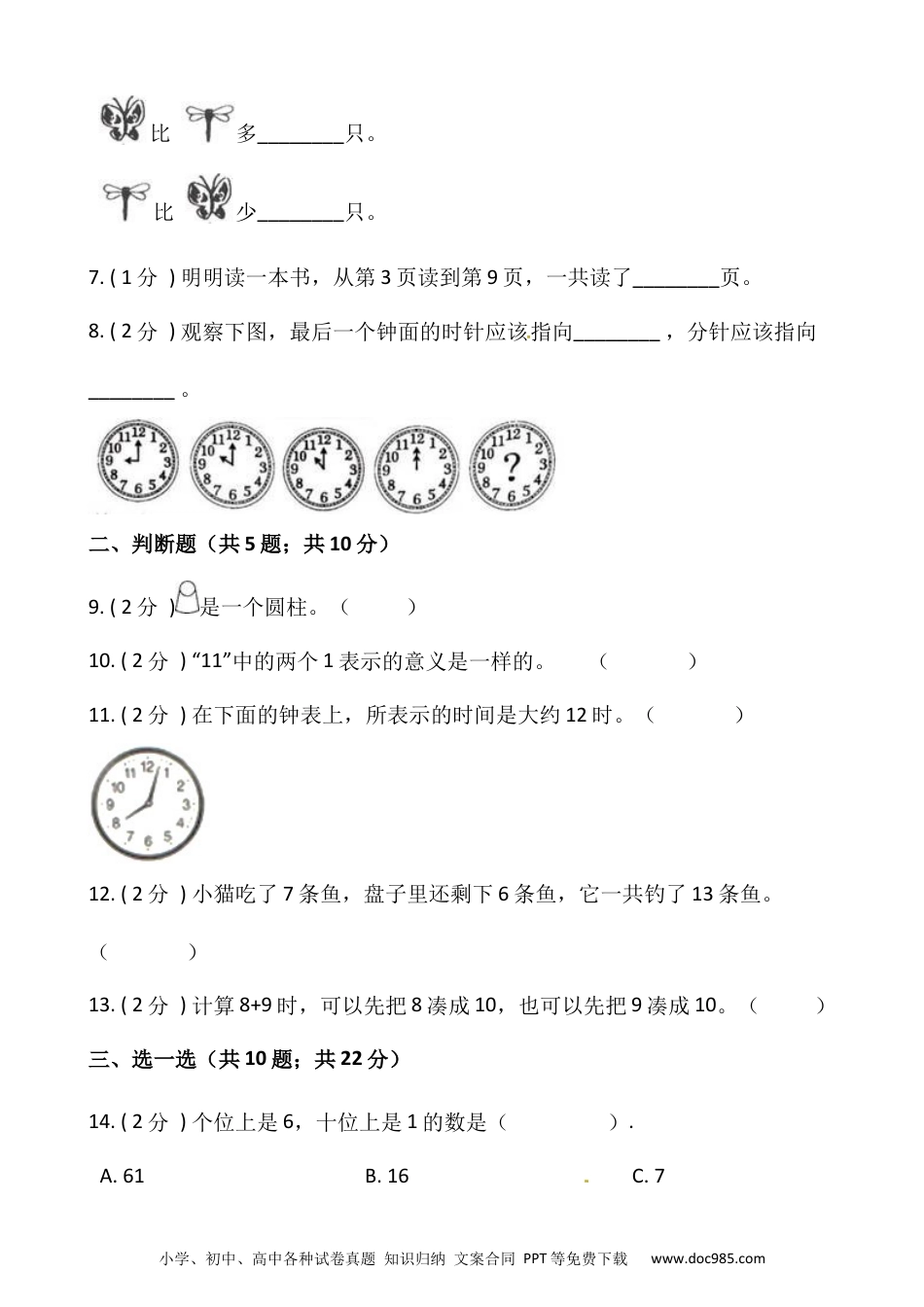 小学、初中、高中各种试卷真题知识归纳文案合同PPT等免费下载www.doc985.com2022-2023学年数学一年级上册期末测试卷(一)人教版含答案一、填空题(共8题;共25分)1.(2分)教室里,讲桌在我的________面,我用________手写字。2.(10分)在横线里填上“+”或“-”。4________9=135________5=07________0=710________5=5[来源:学§科§网Z§X§X§K]9________4=59=10________17________5=3________17________1=4________23.(3分)17里面有________个十和________个一。由2个一和1个十组成的数是________。4.(4分)小冬有15完钱,正好可以买________和________,还可以买________和________。(填序号)5.(1分)在新一届少儿电视节目主持人大赛中,一(1)班同学给月亮姐姐投了9票,给绿泡泡投了3票,一(1)班同学给这两位主持人共投了________票。6.(2分)看图填空小学、初中、高中各种试卷真题知识归纳文案合同PPT等免费下载www.doc985.com比多________只。比少________只。7.(1分)明明读一本书,从第3页读到第9页,一共读了________页。8.(2分)观察下图,最后一个钟面的时针应该指向________,分针应该指向________。二、判断题(共5题;共10分)9.(2分)是一个圆柱。()10.(2分)“11”中的两个1表示的意义是一样的。()11.(2分)在下面的钟表上,所表示的时间是大约12时。()12.(2分)小猫吃了7条鱼,盘子里还剩下6条鱼,它一共钓了13条鱼。()13.(2分)计算8+9时,可以先把8凑成10,也可以先把9凑成10。()三、选一选(共10题;共22分)14.(2分)个位上是6,十位上是1的数是().A.61B.16C.7小学、初中、高中各种试卷真题知识归纳文案合同PPT等免费下载www.doc985.com15.(2分)哪道算式结果最大?()A.4+5B.5+7C.5+916.(2分)12+1-7=()[来源:Zxxk.Com]A.0B.6C.8D.2017.(3分)如图,蝴蝶在花朵的()面。A.上B.下C.左D.右18.(3分)小朋友,我家在8号门的左边,请帮我找一找,应是()号门。[来源:Z#xx#k.Com]A.7B.919.(2分)拼成一个大正方体至少需要()个。小学、初中、高中各种试卷真题知识归纳文案合同PPT等免费下载www.doc985.comA.2B.4C.6D.820.(2分)钟面上,时针和分针重合的时候是()时整。A.1B.11C.1221.(2分)小兰给8张邮票给小明,两人的邮票就同样多,小兰原来比小明多()张邮票。A.8B.4C.1622.(2分)算式□+3=7,□里应该填()。A.2B.3C.423.(2分)10个小朋友排成一排,从前往后数,小明排第8个,从后往前数,小明排第几个?A.第2个B.第3个C.第4个四、按要求做题(共3题;共14分)24.(4分)看数画珠子25.(6分)看数补画出缺少的图形。小学、初中、高中各种试卷真题知识归纳文案合同PPT等免费下载www.doc985.com26.(4分)在☆的左边画,右边画,上边画,下边画。五、计算题(共1题;共6分)27.(6分)口算下面各题。3+8=2+9=5+7=4+9=8+8=3+9=6+6=4+7=5+8=8+7=6+7=4+8=六、看图列式计算(共2题;共8分)28.(4分)小学、初中、高中各种试卷真题知识归纳文案合同PPT等免费下载www.doc985.com29.(4分)七、解答题(共3题;共15分)30.(5分)下图中,每人拿走一把,还剩几把?31.(5分)淘气和笑笑一起去玩碰碰车,每张票9元,一共需要多少元钱?32.(5分)一共有多少只大雁?小学、初中、高中各种试卷真题知识归纳文案合同PPT等免费下载www.doc985.com小学、初中、高中各种试卷真题知识归纳文案合同PPT等免费下载www.doc985.com答案一、填空题[来源:Z,xx,k.Com]1.前;右2.+;-;+或-;-;-;-;-;-;-;+3.1;7;124.①;④;②;⑥5.12[来源:Z§xx§k.Com]6.3;37.78.1;12二、判断题9.错误10.错误11.错误12.正确13.正确三、选一选14.B15.C16.B小学、初中、高中各种试卷真题知识归纳文案合同PPT等免费下载www.doc985.com17.A18.A19.D20.C21.C22.C23.B四、按要求做题24.25.26.解:小学、初中、高中各种试卷真题知识归纳文案合同PPT等免费下载www.doc985.com五、计算题27.3+8=112+9=115+7=124+9=138+8=163+9=126+6=124+7=115+8=138+7=156+7=134+8=12六、看图列式计算28.5+6=1129.10-6-2=2七、解答题30.10-7=3(把)31.9+9=18(元)32.2+5+1=8(只)答:一共有8只大雁。小学、初中、高中各种试卷真题知识归纳文案合同PPT等免费下载www.doc985.com