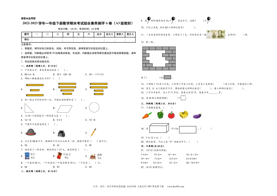 小学、初中、高中各种试卷真题知识归纳文案合同PPT等免费下载www.doc985.com保密★启用前2022-2023学年一年级下册数学期末考试综合素养测评A卷(A3版密封)考试分数:100分;考试时间:60分钟题号一二三四五六总分总分人复核人登分人得分注意事项:1.答题前,填写好自己的姓名、班级、考号等信息,请将答案写在规定的位置上。2.选择题、判断题必须使用2B铅笔填涂答案,非选择、判断题必须使用黑色墨迹签字笔或钢笔答题,请将答案填写在规定的位置上。3.考试结束后将试卷交回。一、选择题(每题2分,共16分)1.下列算式中,要先算减法的是()。A.85+6-8B.32+(20-8)C.43-(17+3)2.哪组小棒能围成长方形?()A.B.C.3.把一张正方形纸对折一次,可能出现的图形是()。A.B.C.4.与15-7的得数不一样的算式是()。A.16-8B.5+3C.15-85.下图中不是同类的是()。A.B.C.6.元元有58张卡片,路路的卡片比元元的多一些,路路可能有()张卡片。A.20B.62C.957.琪琪买了一样东西,刚好用去了27元,她买的是()。A.B.C.8.一个篮球54元,一个足球比一个篮球便宜10元,一个足球()元。A.64B.53C.44二、填空题(每题2分,共16分)9.卖的阿姨原来有16个,卖出9个,还剩()个。10.个位上是8,但比50小的两位数有()。11.一支铅笔的价钱是8角,小明买了1支,付给营业员一张,应找回()角。12.数一数。缺了()块。13.小明做了13朵小红花,小东做了9朵小红花,小东至少还要做()朵小红花,才能超过小明。14.用2、0、6三张数字卡片,摆成的最大的两位数是(),最小的两位数是()。15.小宇今年8岁,当小宇11岁时,爸爸正好37岁,爸爸今年________岁。16.用24根火柴能够摆()个。三、判断题(每题2分,共8分)17.下面都是蔬菜。()18.用可以画。()19.7比12小4。()20.两位数里,个位上是“5”的数有9个。()四、计算题(共24分)21.(12分)直接写得数。7+5=9+3=14-4=10-6-2=19-4=7+6=13+2=3+5+8=9+8=4+12=13-2=20-10+9=22.(6分)看图列式。小学、初中、高中各种试卷真题知识归纳文案合同PPT等免费下载www.doc985.com(只)23.(6分)看图列式。()五、连线题(共12分)24.(6分)给小动物找帽子。25.(6分)找家连线。六、解答题(共24分)26.(6分)12个西瓜被我吃掉了3个,地里还剩多少个西瓜?(个)答:地里还剩()个西瓜。27.(6分)二年级同学看电影,买了80张票,后来退了8张。二年级有多少同学看了电影?28.(6分)车上原来有27人。现在有多少人?小学、初中、高中各种试卷真题知识归纳文案合同PPT等免费下载www.doc985.com29.(6分)丫丫有5角、1角、1元的纸币若干张,她去由于邮局寄信,邮局工作人员告诉她。她邮寄的信件要1元邮票。丫丫可以怎样付钱?参考答案1.B【分析】整数四则混合运算法则:同级运算时,从左到右依次计算;两级运算时,先算乘除,后算加减;有括号时,先算括号里面的,再算括号外面的。【详解】A.先算加法;B.先算括号里面的减法;C.先算括号里面的加法。故答案为:B【点睛】熟练掌握整数四则混合运算的运算法则是解题关键。2.C【分析】长方形有四条边,两组对边分别相等,据此可解。【详解】A.只有三根小棒,无法组成长方形;B.只有两根小棒一样长,另两根小棒长度不相等,无法组成长方形;C.一共有四根小棒,分成两组长度相等的小棒,刚好可以围成长方形。故答案为:C。【点睛】本题考查了图形的认识,解题的关键是熟记长方形的结构特征。3.A【分析】把一张正方形纸对折一次,可能出现长方形或三角形。据此解答。【详解】把一张正方形纸对折一次,可能出现的图形是。故答案为:A【点睛】本题主要考查图形的折叠问题,关键培养学生的动手操作能力。4.C【分析】根据20以内整数加减法运算,算出各个算式的得数,再进行比较即可得出答案。【详解】15-7=8A.16-8=8,不符合题意。小学、初中、高中各种试卷真题知识归纳文案合同PPT等免费下载www.doc985.comB.5+3=8,不符合题意。C.15-8=7,符合题意。故答案为:C【点睛】本题考查学生对20以内整数加减运算的掌握和运用。5.A【分析...