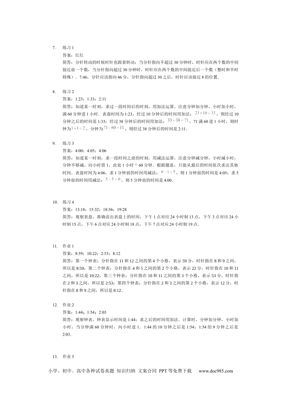 小学、初中、高中各种试卷真题知识归纳文案合同PPT等免费下载www.doc985.com第八面讲钟数学进阶1.例题1答案:6:18;3:01;11:53;5:37详解:分针走一小格代表1分钟,分针走一大格是5分钟.分针转动的时候时针也跟着转动:当分针指向不超过30分钟时,时针应在两个数的中间接近前一个数.当分针指向超过30分钟时,时针应在两个数的中间接近后一个数(整时和半时特殊).通过数分针走过的小格与大格,准确读取时间.2.例题2答案:10:36;10:46;11:19详解:知道某一时刻,求过一段时间后的时刻,用加法运算,注意分钟加分钟,小时加小时,满60分钟进1小时.表盘时间为10:36,经过10分钟后的时间用加法:,则经过10分钟之后的时间是10:46;经过33分钟后的时间用加法:,79满60进1小时,则小时为,分钟为,则经过33分钟后的时间是11:19.3.例题3答案:7:28;7:40;7:40详解:知道某一时刻,求一段时间之前的时刻,用减法运算,注意分钟减分钟,小时减小时.根据题意,只能从最后的时间依次求出其他时间.表盘时间为7:50,求10分钟前的时间用减法:,则10分钟前的时间是7:40;求12分钟前的时间用减法:,则12分钟前的时间是7:28.4.例题4答案:详解:第一个表盘显示为7:00,用24小时制表示是7:00或19:00;第二个表盘显示为1:30,用24小时制表示是1:30或13:30;第三个表盘显示为10:46,用24小时制表示是10:46或22:46.5.例题5答案:小淘10:25出发的详解:为了方便计算,先将时间转换为24小时制.下午2:25,用24小时制表示为14:25,要求出小淘的出发时间就是要求4小时之前的时间,用减法,,所以小淘出发的时间是10:25.6.例题6答案:1月3日16时38分详解:一天有24小时,.经过56个小时32分钟后,也就是经过2天8小时32分钟.1月1日经过两天就是1月3日.分钟加分钟,小时加小时,用24小时制表示,8:06经过8小时32分钟是16:38.小学、初中、高中各种试卷真题知识归纳文案合同PPT等免费下载www.doc985.com7.练习1答案:红红简答:分针转动的时候时针也跟着转动:当分针指向不超过30分钟时,时针应在两个数的中间接近前一个数,当分针指向超过30分钟时,时针应在两个数的中间接近后一个数(整时和半时特殊).7:46,分针应该指向46分,分针指向超过30之后,时针应该接近8的位置.8.练习2答案:1:23;1:33;2:11简答:知道某一时刻,求过一段时间后的时刻,用加法运算,注意分钟加分钟,小时加小时,满60分钟进1小时.表盘时间为1:23,经过10分钟后的时间用加法:,则经过10分钟之后的时间是1:33;经过38分钟后的时间用加法:,71满60进1小时,则时钟为,分钟为,则经过38分钟后的时间是2:11.9.练习3答案:4:00;4:05;4:06简答:知道某一时刻,求一段时间之前的时刻,用减法运算,注意分钟减分钟,小时减小时,分钟不够减,向小时借1,此处1小时60分钟.根据题意,只能从最后的时间依次求出其他时间.表盘时间为4:06,求1分钟前的时间用减法:,则1分钟前的时间是4:05;求5分钟前的时间用减法:,则5分钟前的时间是4:00.10.练习4答案:13:18;15:32;18:56;19:28简答:观察表盘,准确读出表盘上的时间,下午1点对应24小时制13点,下午3点对应24小时制15点,下午6点对应24小时制18点,下午7点对应24小时制19点.11.作业1答案:8:59;10:22;2:53;8:12简答:第一个钟表:分针指在11和12之间的第4个小格,表示59分,时针指在8和9之间,所以是8:59;第二个钟表:分针指在4和5之间的第2个小格,表示22分,时针指在10和11之间,所以是10:22;第三个钟表:分针指在10和11之间的第3个小格,表示53分,时针指在2和3之间,所以是2:53;第四个钟表:分针指在2和3之间的第2个小格,表示12分,时针指在8和9之间,所以是8:12.12.作业2答案:1:44;1:54;2:03简答:观察钟表,钟表显示时间是1:44;求之后的时间用加法.计算时,分钟加分钟,小时加小时,当分钟满60分钟时,向小时进1.1:44的10分钟之后是1:54;1:54的9分钟之后是2:03.13.作业3小学、初中、高中各种试卷真题知识归纳文案合同PPT等免费下载www.doc985.com答案:10:24;10:25;10:36简答:知道某一时刻,求一段时间之前的时刻,用减法运算...