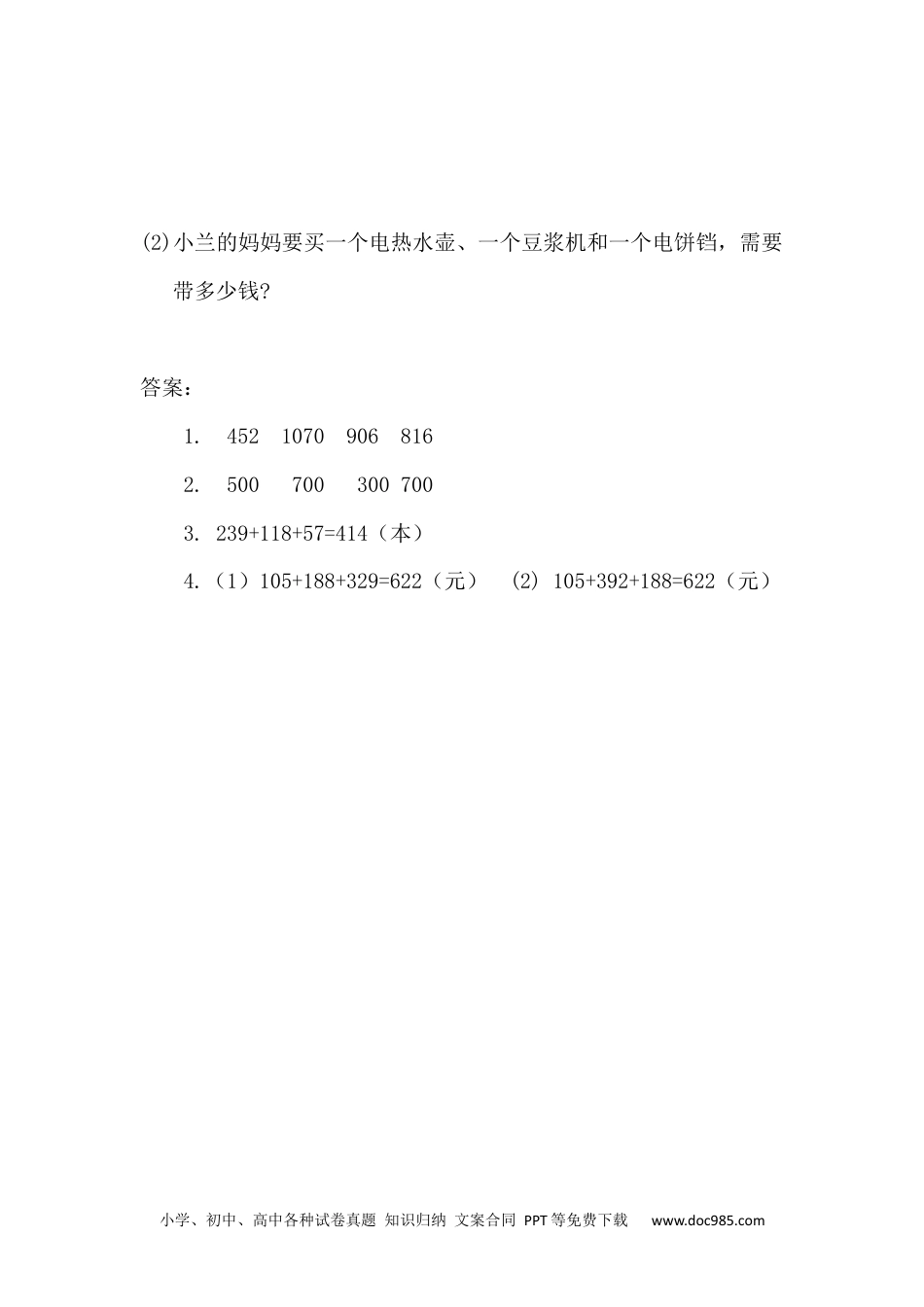 小学、初中、高中各种试卷真题知识归纳文案合同PPT等免费下载www.doc985.com4.5连加1.用自己喜欢的方法计算。212+186+54324+612+134655+35+216427+235+1542.看图填一填。195元404元302元298元96元①买台灯和手表大约()元②买录音机和电熨斗大约()元③买保温壶和台灯大约()元④买录音机和手表大约()元3.小小图书馆里一共藏书多少本?4.下面是一组商品的价格。(1)买哪三种商品花钱最少?种类数量/本故事书239连环画118科技书57小学、初中、高中各种试卷真题知识归纳文案合同PPT等免费下载www.doc985.com(2)小兰的妈妈要买一个电热水壶、一个豆浆机和一个电饼铛,需要带多少钱?答案:1.45210709068162.5007003007003.239+118+57=414(本)4.(1)105+188+329=622(元)(2)105+392+188=622(元)