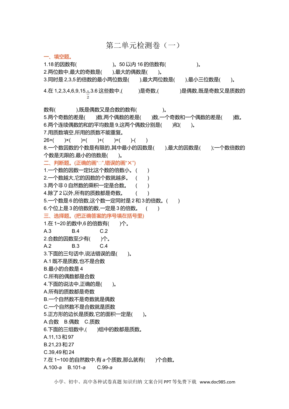 第二单元检测卷(一)一、填空题。1.18的因数有()。50以内16的倍数有()。2.两位数中,最大的奇数是(),最大的偶数是()。3.同时是2,3,5的倍数的最小两位数是(),最大两位数是(),最小三位数是()。4.在1,2,3,4,6,9,15,,3.6这些数中,()是奇数,()是偶数,既是奇数又是质数的数有(),既是偶数又是合数的数有()。5.两个奇数的差是()数,两个偶数的差是()数,一个奇数和一个偶数的差是()数。6.两个连续偶数的和的平均数是9,这两个偶数分别是()和()。7.用质数填空,所用的质数不能重复。26=()×()=()+()=()-()8.一个数因数的个数是有限的,其中最小的因数是(),最大的因数是();一个数倍数的个数是无限的,最小的倍数是()。二、判断题。(“正确的画”,“错误的画✕”)1.一个数的因数一定比这个数的倍数小。()2.一个数越大,它的因数的个数就越多。()3.两个非0自然数的乘积一定是合数。()4.除了2以外,所有的质数都是奇数。()5.一个数是6的倍数,这个数一定同时是2和3的倍数。()6.个位上是3的倍数的数,一定是3的倍数。()三、选择题。(把正确答案的序号填在括号里)1.在1~20的数中,6的倍数有()个。A.3B.4C.22.合数的因数至少有()个。A.2B.3C.43.下面的三句话中,说法错误的是()。A.1既不是质数,也不是合数B.最小的合数是4C.所有的偶数都是合数4.下面的说法中,正确的是()。A.所有的质数都是奇数B.一个自然数不是奇数就是偶数C.一个自然数不是合数就是质数5.正方形的边长是质数,它的面积一定是()。A.合数B.偶数C.质数6.下面的三组数中,()组中的数都是质数。A.11,13和97B.21,23和27C.39,49和247.在1~100的自然数中,有a个质数,那么就有()个合数。A.100-aB.101-aC.99-a小学、初中、高中各种试卷真题知识归纳文案合同PPT等免费下载www.doc985.com8.用4,5,6三个数字组成的所有三位数,一定是()的倍数。A.3B.2C.6四、填表题。1.汽水厂的章叔叔要把48瓶饮料按不同的规格包起来,他可以怎样选择方法?请你帮他完成下表。每包瓶数所需包数48的因数有。2.一箱啤酒有9瓶,请你完成下表。箱数123456瓶数写出3个9的倍数:。五、把下面的数填入适当的圈内。123813162933454791105111六、看图回答问题。1.我们两个的和是6,积是8。2.我们两个的和是18,积是77。小学、初中、高中各种试卷真题知识归纳文案合同PPT等免费下载www.doc985.com七、解决问题。1.饮料厂要把70瓶纯净水包装起来批发给超市,厂里只有下面三种包装盒。选哪种包装盒能正好把纯净水包完?为什么?2.向阳小学四年级有110人排队到科技馆参观,两人一排,每行的人数相等吗?如果三人一排,每行的人数相等吗?如果五人一排呢?3.一只小船每天在河的东西两岸运送乘客,从东岸到西岸或从西岸到东岸都算一次。(1)一天,这只小船从东岸开始运送乘客,第5次从东岸出发还是从西岸出发?第10次和第115次呢?(2)你发现了什么规律?小学、初中、高中各种试卷真题知识归纳文案合同PPT等免费下载www.doc985.com参考答案一、1.1,2,3,6,9,1816,32,482.99983.30901204.1,3,9,152,4,634,65.偶偶奇6.8107.213323315(后四空答案不唯一)8.1它本身它本身二、1.✕2.✕3.✕4.5.6.✕三、1.A2.B3.C4.B5.A6.A7.C8.A四、1.填表略1,2,3,4,6,8,12,16,24,482.填表略9,18,27(答案不唯一)五、奇数:1,3,13,29,33,45,47,91,105,111偶数:2,8,16质数:2,3,13,29,47合数:8,16,33,45,91,105,111六、1.242.711七、1.5瓶的包装盒,因为70是5的倍数。2.相等不相等相等3.(1)东岸西岸东岸(2)奇数次从东岸出发,偶数次从西岸出发。小学、初中、高中各种试卷真题知识归纳文案合同PPT等免费下载www.doc985.com