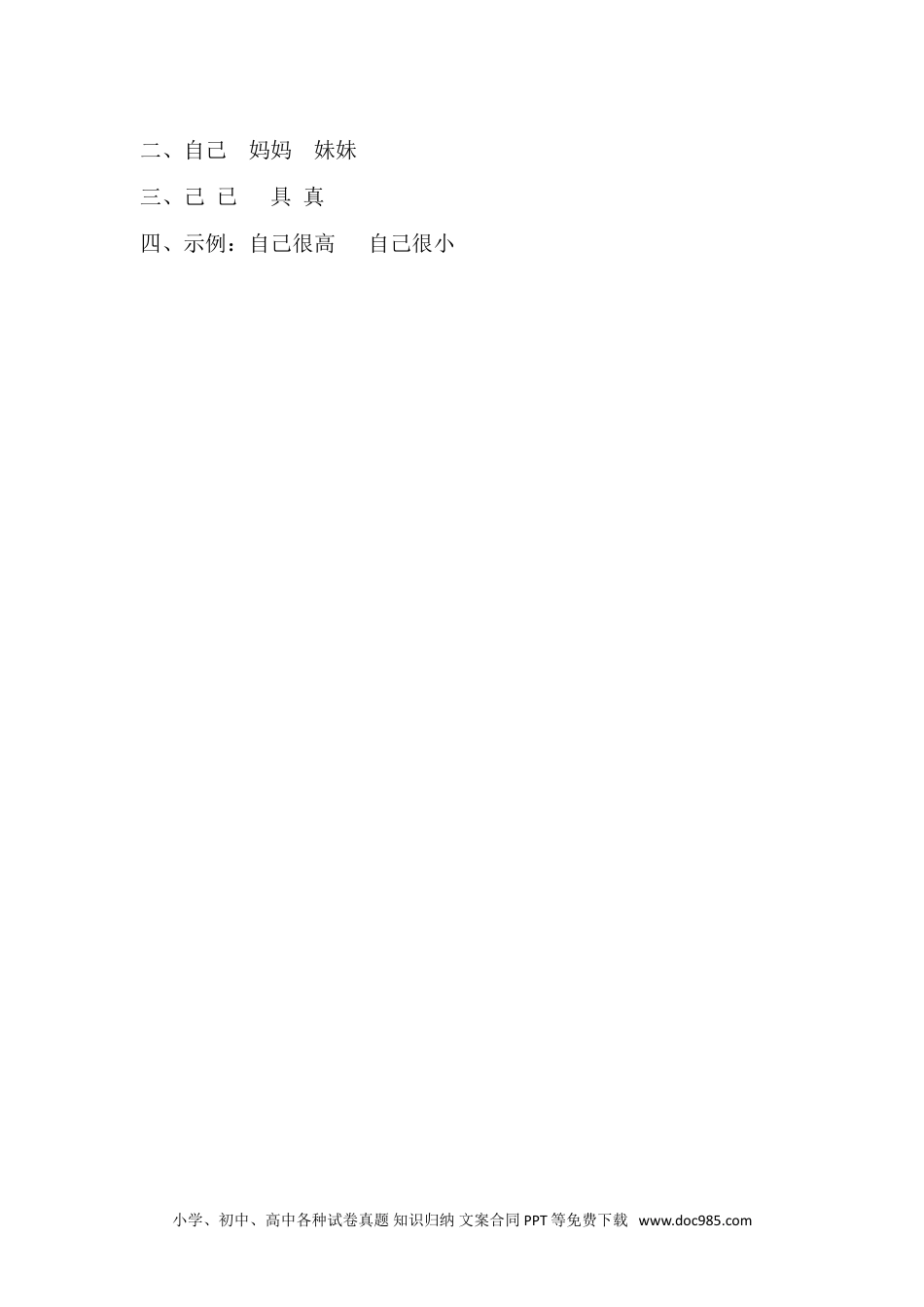 10大还是小一、补全下列字的音节。hzhwkhf很照玩快候服二、拼一拼,写一写。zìjǐmāmamèimei()()()三、选字组词。已己自()()经具真玩()认()四、照样子,写句子。我觉得自己很大。我觉得。我觉得。答案一、ěnàoánuàiòuú小学、初中、高中各种试卷真题知识归纳文案合同PPT等免费下载www.doc985.com二、自己妈妈妹妹三、己已具真四、示例:自己很高自己很小小学、初中、高中各种试卷真题知识归纳文案合同PPT等免费下载www.doc985.com