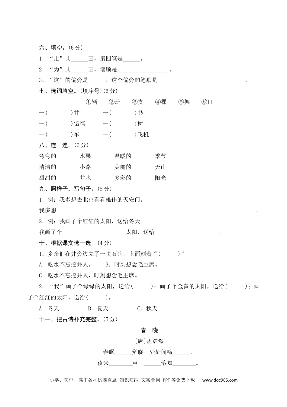 小学、初中、高中各种试卷真题知识归纳文案合同PPT等免费下载www.doc985.com第二单元测评一、写出对应的小写字母,再把大写字母按顺序排列。(7分)C——()H——()U——()R——()M——()G——()________________________________________________________________________二、给加点字选择正确的读音,画“√”。(6分)村子(cūnchūn)温暖(nuǎnluǎn)香甜(xiānxiāng)亲人(qīnqīng)品尝(cángcháng)一匹马(pīpǐ)三、看拼音,写词语。(16分)tàiyángqiūtiānchángjiānghuǒbànɡuǎnɡdàběijīnɡɡèzhǒnɡɡèyànɡ四、给句子中加点的多音字选择正确的读音。(4分)1.小花猫喜欢在阳光下睡觉()。2.我在房间里看书,没有发觉()天已经黑了。五、给下面的字加不同的部件,变成新字,再组词。(12分)日寸jiàojué小学、初中、高中各种试卷真题知识归纳文案合同PPT等免费下载www.doc985.com六、填空。(6分)1.“走”共______画,第四笔是______。2.“为”共______画,笔顺是__________________。3.“这”的偏旁是______,这个偏旁的笔顺是______________________________。七、选词填空。(填序号)(6分)①辆②册③支④棵⑤架⑥口一()井一()书一()铅笔一()树一()车一()飞机八、连一连。(6分)弯弯的水果温暖的季节清清的小路美丽的天山甜甜的井水多彩的阳光九、照样子,写句子。(8分)1.例:我多想去北京看看雄伟的天安门。我多想_____________________________________________________________________。2.例:我画了个红红的太阳,送给冬天。我画了个______________________太阳,送给______________________。十、根据课文选一选。(4分)1.乡亲们在井旁边立了一块石碑,上面刻着“()”A.吃水不忘挖井人。B.时刻想念毛主席。C.吃水不忘挖井人,时刻想念毛主席。2.“我”画了个绿绿的太阳,送给();画了个金黄的太阳,送给();画了个红红的太阳,送给()。A.冬天B.夏天C.秋天十一、把古诗补充完整。(5分)春晓[唐]孟浩然春眠______觉晓,处处闻啼______。夜来________声,______落知________。小学、初中、高中各种试卷真题知识归纳文案合同PPT等免费下载www.doc985.com十二、阅读短文,回答问题。(10分)树医生一老生了病,有些叶子了。棵树黄一生了,落在上。他用嘴里敲敲,那里敲敲,找到了生虫子的地方,就啄个医飞来树这一洞。他伸舌,把虫子一一地勾出吃掉。他吃完虫子,翅膀走了。个进长头个个来张开飞老的病生治好了,慢慢地出新叶子。树让医长来生就是啄木。这个医鸟1.短文共有______个自然段,第2自然段有____句话。(2分)2.老树生病是因为()。(4分)A.叶子黄了B.医生啄了一个洞C.树里有虫子3.医生是怎样给老树治病的?用“____”在文中画出来。(3分)4.这个医生是()。(1分)A.医院里的医生B.啄木鸟C.园林工人十三、看图写话。(10分)提示:春天来了,公园里的景色真美啊!这个小朋友在做什么?他的心情怎么样?参考答案一、churmgCGHMRU二、cūnnuǎnxiāngqīnchángpǐ三、太秋天江伴广大北京各各阳长伙种样四、1.jiào2.jué小学、初中、高中各种试卷真题知识归纳文案合同PPT等免费下载www.doc985.com五、明明天早早上星星星小去村村子时时过过六、1.7︱2.43.辶丶辶七、⑥②③④①⑤八、九、【示例】1.去游玩乐场儿2.彩色的春天十、1.C2.BCA十一、不雨花多少鸟风十二、1.442.C3.他用嘴里敲敲,那里敲敲,找到了生虫子的地方,就啄一这个洞。4.B十三、【示例】春天了,明明去公里。他坐在湖一看着美的景色,一来园画画边边丽边,心情好了。画画极