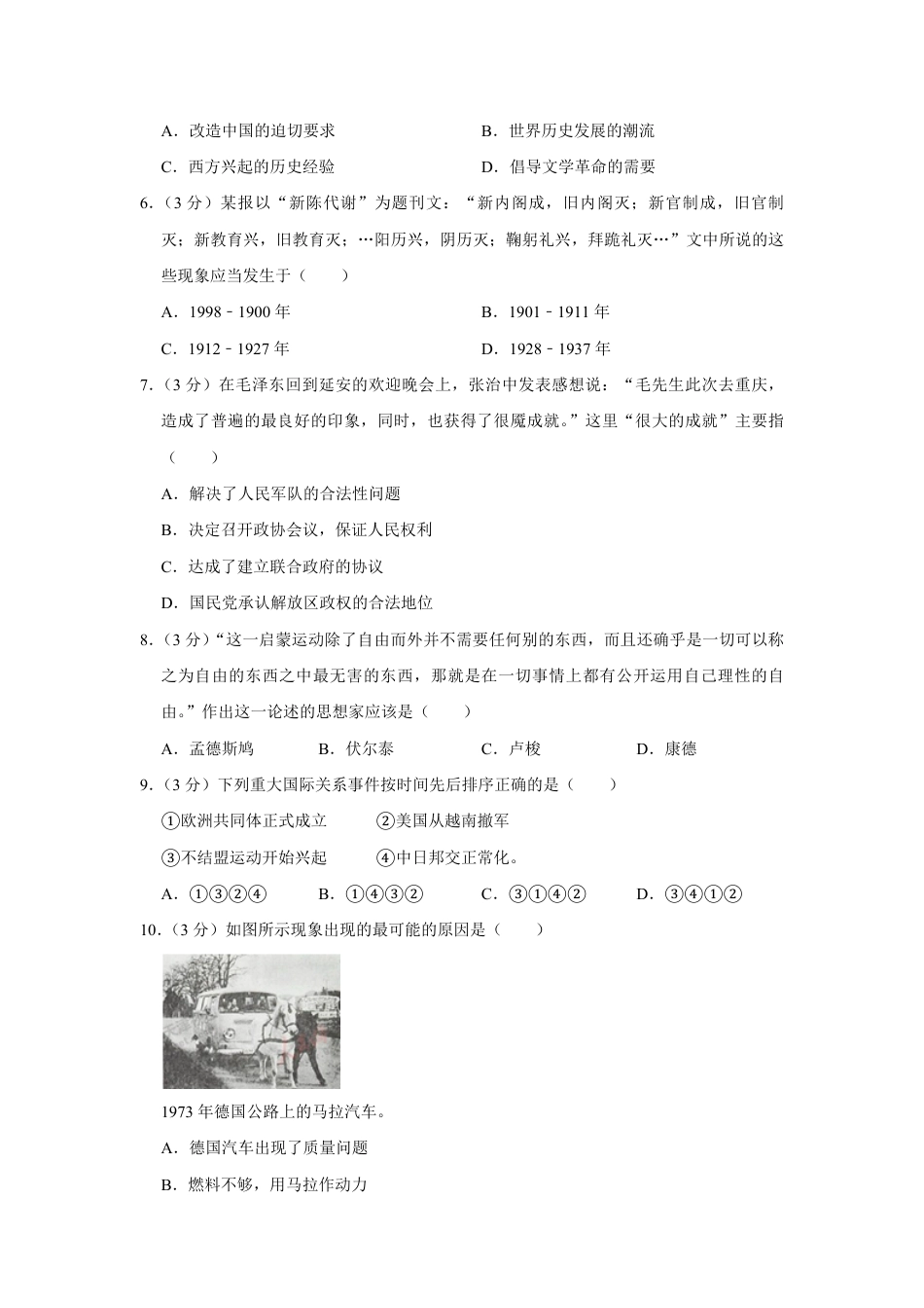 2011年天津市高考历史试卷一、选择题(共11小题,每小题3分,满分33分)1.(3分)下列各组古今地名对应正确的是()①大都﹣北京②汴梁﹣开封③临安﹣﹣苏州④益州﹣成都。A.①②③B.①②④C.①③④D.②③④2.(3分)宋人诗云:“东家打麦声彭魄,西家缫丝雪能白。…东家麦饭香扑扑,西家卖丝籴新谷。”计中反映了宋代()A.产品商品化程度提高B.手工业仅在乡村发展C.开始出现独立的手工业家庭D.手工业者脱离农业生产3.(3分)长期以来,儒学是一种士大夫之学。明代思想家李贽则提出要正视“世间惟下下人最多”的现实,强调“我为下下人说,不为上上人说”。这说明李贽()A.反对儒家的正统思想B.倡导只为下下人说C.批判地发展传统儒学D.抨击君主专制制度4.(3分)如图为1878年天津首发的中国第一套邮票中的一枚。与该邮票设计理念无关的是()A.中国传统文化的影响B.近代西方佛手影响C.“师夷长技”的思想D.兴民权、倡新学思想5.(3分)《新青年》创刊即大力提倡民主与科学,但其后十余年间所发表的专门论述民主与科学的文章并不多。尽管如此,“民主”与“科学”被认为是新文化运动的两大基本口号。这主要因为民主与科学是()A.改造中国的迫切要求B.世界历史发展的潮流C.西方兴起的历史经验D.倡导文学革命的需要6.(3分)某报以“新陈代谢”为题刊文:“新内阁成,旧内阁灭;新官制成,旧官制灭;新教育兴,旧教育灭;…阳历兴,阴历灭;鞠躬礼兴,拜跪礼灭…”文中所说的这些现象应当发生于()A.1998﹣1900年B.1901﹣1911年C.1912﹣1927年D.1928﹣1937年7.(3分)在毛泽东回到延安的欢迎晚会上,张治中发表感想说:“毛先生此次去重庆,造成了普遍的最良好的印象,同时,也获得了很魇成就。”这里“很大的成就”主要指()A.解决了人民军队的合法性问题B.决定召开政协会议,保证人民权利C.达成了建立联合政府的协议D.国民党承认解放区政权的合法地位8.(3分)“这一启蒙运动除了自由而外并不需要任何别的东西,而且还确乎是一切可以称之为自由的东西之中最无害的东西,那就是在一切事情上都有公开运用自己理性的自由。”作出这一论述的思想家应该是()A.孟德斯鸠B.伏尔泰C.卢梭D.康德9.(3分)下列重大国际关系事件按时间先后排序正确的是()①欧洲共同体正式成立②美国从越南撤军③不结盟运动开始兴起④中日邦交正常化。A.①③②④B.①④③②C.③①④②D.③④①②10.(3分)如图所示现象出现的最可能的原因是()1973年德国公路上的马拉汽车。A.德国汽车出现了质量问题B.燃料不够,用马拉作动力C.兴起了一种新的旅游形式D.提倡低碳生活,保护环境11.(3分)在近现代历史上,法德两国之间多次发生战争。在战争过程中,法国遭受最严重失败是()A.反法同盟战争B.普法战争C.第一次世界大战D.第二次世界大战二、解答题(共3小题,满分57分)12.(20分)民主政治是历史发展趋势,并随着时代进步不断完善。阅读材料,回答问题。材料一在《伯罗奔尼撒战争史》中,修昔底德借尼西阿斯(古雅典将军)之口说出了这样一句话:“男人就是城邦。”﹣﹣马克壵《世界文明史》(1)结合所学知识,解读“男人就是城邦”的内涵。材料二1832年,英国选民从人口总数的大约2%增加到3.3%,但工人阶级被排斥在外。1836年后,工人阶级为争取选举权掀起了宪章运动。1866年后,英国通过两次议会改革,至1885年基本实现了成年男子普选权。第一次世界大战前,妇女为争取选举权展开了斗争。第二次世界大战前夕,英国已实现全民普选。﹣﹣摘编自钱乘旦等《英国通史》(2)材料二中,英国选举权的变化经历了哪几个阶段?这一变化历程表现出哪些特点?材料三自1953年以来,全国人民代表大会及各级人民代表大会选举法,对于各省、自治区、直辖市应选全国人民代表大会代表的名额,均按照农村每一代表所代表的人口数四倍于城市每一代表的人口数的原则分配。﹣﹣根据1953~2009年我国实行的人民代表大会选举法材料四第十六条全国人民代表大会名额,由全国人民代表大会常务委员会根据各省、各自治区、直辖市的人口数,按照每一代表所代表的城乡人口数相...