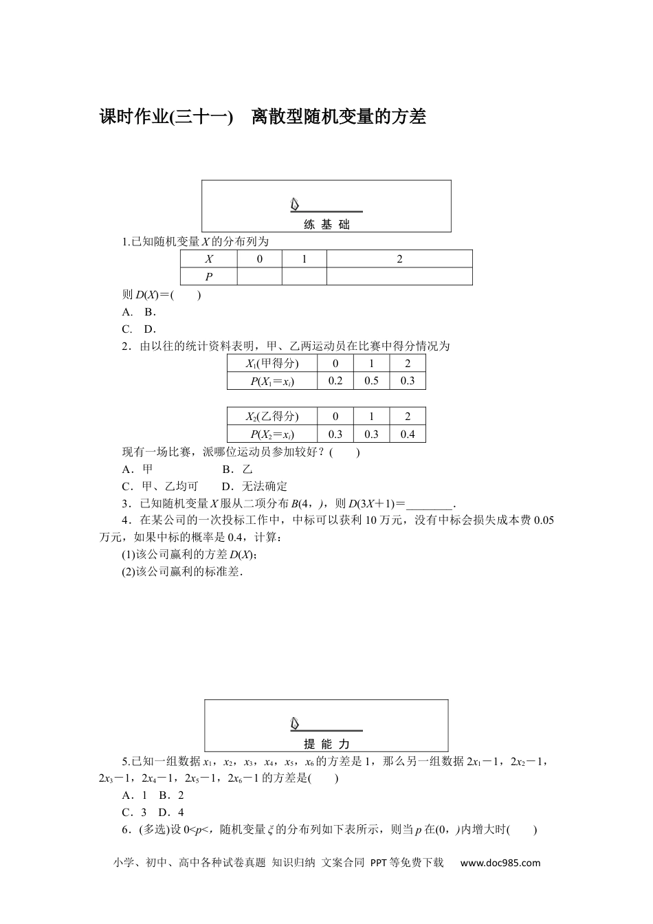 小学、初中、高中各种试卷真题知识归纳文案合同PPT等免费下载www.doc985.com课时作业(三十一)离散型随机变量的方差练基础1.已知随机变量X的分布列为X012P则D(X)=()A.B.C.D.2.由以往的统计资料表明,甲、乙两运动员在比赛中得分情况为X1(甲得分)012P(X1=xi)0.20.50.3X2(乙得分)012P(X2=xi)0.30.30.4现有一场比赛,派哪位运动员参加较好?()A.甲B.乙C.甲、乙均可D.无法确定3.已知随机变量X服从二项分布B(4,),则D(3X+1)=________.4.在某公司的一次投标工作中,中标可以获利10万元,没有中标会损失成本费0.05万元,如果中标的概率是0.4,计算:(1)该公司赢利的方差D(X);(2)该公司赢利的标准差.提能力5.已知一组数据x1,x2,x3,x4,x5,x6的方差是1,那么另一组数据2x1-1,2x2-1,2x3-1,2x4-1,2x5-1,2x6-1的方差是()A.1B.2C.3D.46.(多选)设0<p<,随机变量ξ的分布列如下表所示,则当p在(0,)内增大时()小学、初中、高中各种试卷真题知识归纳文案合同PPT等免费下载www.doc985.comξ012P1-2pppA.E(ξ)先减少后增大B.E(ξ)一直增大C.D(ξ)先增大后减小D.D(ξ)一直增大7.已知随机变量ξ的分布列如下:且E(ξ)=,则实数x=________,若随机变量η=2ξ-3,则D(η)=________.ξ234Pxy8.甲、乙两人进行定点投篮游戏,投篮者若投中,则继续投篮,否则由对方投篮,第一次由甲投篮;已知每次投篮甲、乙命中的概率分别为,.(1)在前3次投篮中,乙投篮的次数为ξ,求ξ的分布列;(2)求ξ的期望及标准差.9.某学校举行“百科知识”竞赛,每个班选派一位学生代表参加.某班经过层层选拔,李明和王华进入最后决赛,决赛方式如下:给定4个问题,假设李明能且只能对其中3个问题回答正确,王华对其中任意一个问题回答正确的概率均为.由李明和王华各自从中随机抽取2个问题进行回答,而且每个人对每个问题的回答均相互独立.设李明和王华回答问题正确的个数分别为X和Y,求X,Y的期望E(X)、E(Y)和方差D(X)、D(Y),并由此决策派谁代表该班参加竞赛更好.培优生10.已知ξ的分布列如下表:ξ012P?!?其中,尽管“!”处完全无法看清,且两个“?”处字迹模糊,但能断定这两个“?”处的数值相同.据此计算,下列各式中:①E(ξ)=1;②D(ξ)>1;③P(ξ=0)≤,正确的个数是()A.0B.1小学、初中、高中各种试卷真题知识归纳文案合同PPT等免费下载www.doc985.comC.2D.311.已知A,B两个投资项目的利润率分别为随机变量X1和X2,根据市场分析,X1和X2的分布列如下:X15%10%P0.60.4X22%8%12%P0.10.50.4(1)在A,B两个项目上各投资200万元,Y1和Y2(单位:万元)表示投资项目A和B所获得的利润,求D(Y1)和D(Y2);(2)将x(0<x<200)万元投资A项目,(200-x)万元投资B项目,f(x)表示投资A项目所得利润的方差与投资B项目所得利润的方差之和.则当x为何值时,f(x)取得最小值?
