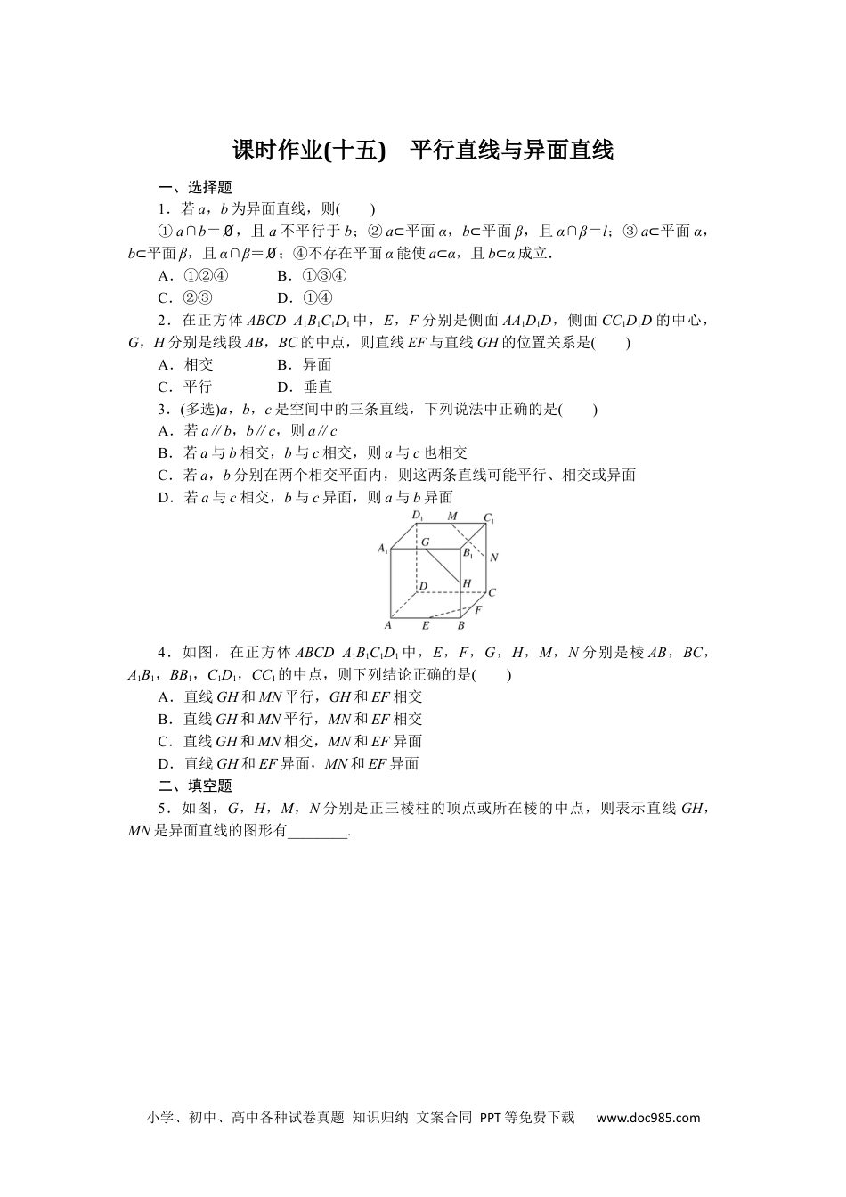 小学、初中、高中各种试卷真题知识归纳文案合同PPT等免费下载www.doc985.com课时作业(十五)平行直线与异面直线一、选择题1.若a,b为异面直线,则()①a∩b=∅,且a不平行于b;②a⊂平面α,b⊂平面β,且α∩β=l;③a⊂平面α,b⊂平面β,且α∩β=∅;④不存在平面α能使a⊂α,且b⊂α成立.A.①②④B.①③④C.②③D.①④2.在正方体ABCDA1B1C1D1中,E,F分别是侧面AA1D1D,侧面CC1D1D的中心,G,H分别是线段AB,BC的中点,则直线EF与直线GH的位置关系是()A.相交B.异面C.平行D.垂直3.(多选)a,b,c是空间中的三条直线,下列说法中正确的是()A.若a∥b,b∥c,则a∥cB.若a与b相交,b与c相交,则a与c也相交C.若a,b分别在两个相交平面内,则这两条直线可能平行、相交或异面D.若a与c相交,b与c异面,则a与b异面4.如图,在正方体ABCDA1B1C1D1中,E,F,G,H,M,N分别是棱AB,BC,A1B1,BB1,C1D1,CC1的中点,则下列结论正确的是()A.直线GH和MN平行,GH和EF相交B.直线GH和MN平行,MN和EF相交C.直线GH和MN相交,MN和EF异面D.直线GH和EF异面,MN和EF异面二、填空题5.如图,G,H,M,N分别是正三棱柱的顶点或所在棱的中点,则表示直线GH,MN是异面直线的图形有________.小学、初中、高中各种试卷真题知识归纳文案合同PPT等免费下载www.doc985.com6.空间两个角α,β,且α与β的两边对应平行,且α=60°,则β=________.7.在空间四边形ABCD中,E,F,G,H分别为AB,BC,CD,DA的中点,若AC=BD,则四边形EFGH为________形.三、解答题8.在梯形ABCD中,AB∥CD,E,F分别为BC和AD的中点,将平面CDFE沿EF翻折起来,使CD翻折到C′D′的位置,G,H分别为AD′和BC′的中点.求证:四边形EFGH为平行四边形.9.在如图所示的正方体ABCDA1B1C1D1中,E,F,E1,F1分别是棱AB,AD,B1C1,C1D1的中点.求证:(1)四边形EFF1E1为平行四边形;(2)∠EA1F=∠E1CF1.小学、初中、高中各种试卷真题知识归纳文案合同PPT等免费下载www.doc985.com[尖子生题库]10.如图所示,E,F,G,H分别是空间四边形ABCD各边上的点,且有AE∶EB=AH∶HD=m,CF∶FB=CG∶GD=n.(1)证明:E,F,G,H四点共面;(2)m,n满足什么条件时EFGH是平行四边形;(3)在(2)的条件下,若AC⊥BD,试证明EG=FH.