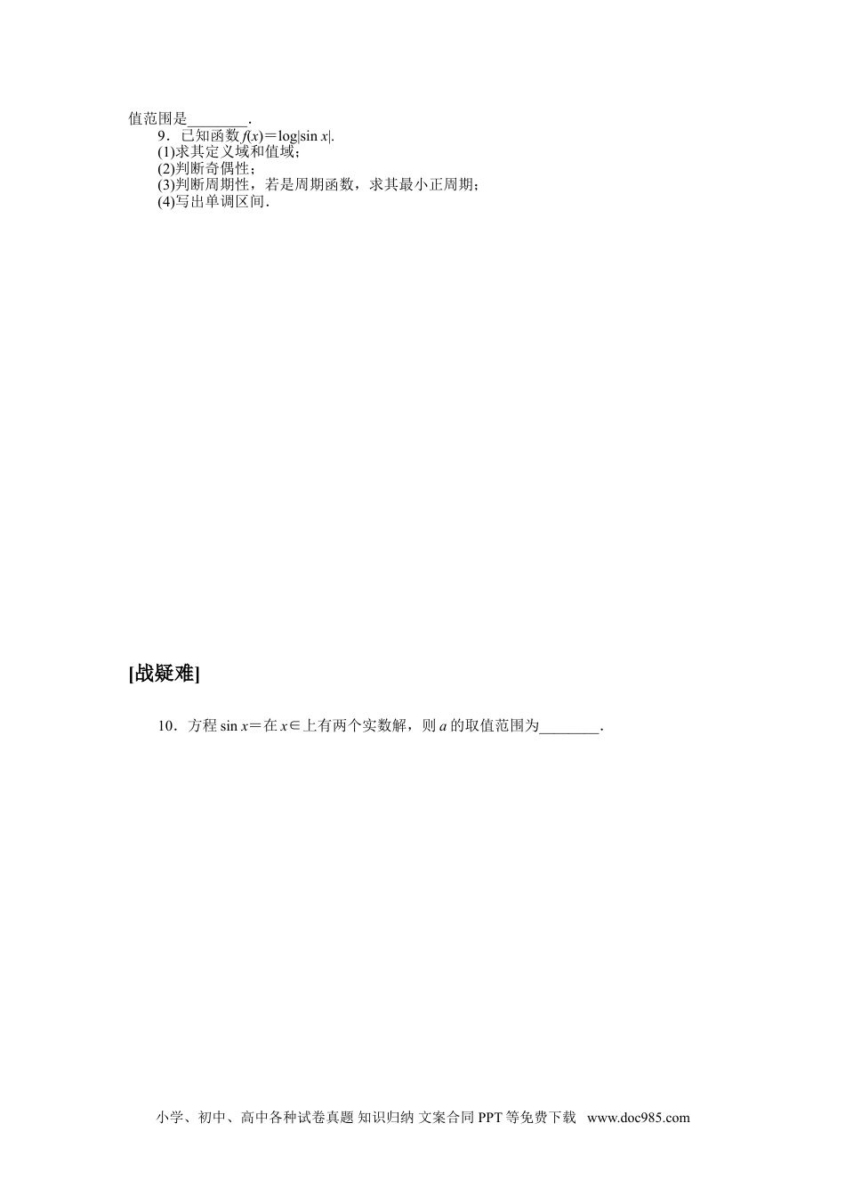 课时作业8正弦函数的图象与性质再认识[练基础]1.函数y=1-sinx,x∈[0,2π]的大致图象是()2.在[0,2π]上,满足sinx≥的x的取值范围是()A.B.C.D.3.函数f(x)=的定义域是()A.RB.[0,+∞)C.(k∈Z)D.[2kπ,2kπ+π](k∈Z)4.已知α,β∈,且cosα>sinβ,则α+β与的大小关系是()A.α+β>B.α+β<C.α+β≥D.α+β≤5.若函数y=3sinx的图象与直线y=a在[π,2π]上有两个不同的交点,则实数a的取值范围是________.6.作出函数y=-2sinx(0≤x≤2π)的简图.[提能力]7.[多选题]已知函数f(x)=sin2x,则下列关于f(x)的叙述正确的是()A.f(x)是奇函数B.f(x)是偶函数C.f(x)的最小正周期为2πD.f(x)的最小值为-18.函数y=(sinx-a)2+1,当sinx=a时有最小值,当sinx=1时有最大值,则a的取小学、初中、高中各种试卷真题知识归纳文案合同PPT等免费下载www.doc985.com值范围是________.9.已知函数f(x)=log|sinx|.(1)求其定义域和值域;(2)判断奇偶性;(3)判断周期性,若是周期函数,求其最小正周期;(4)写出单调区间.[战疑难]10.方程sinx=在x∈上有两个实数解,则a的取值范围为________.小学、初中、高中各种试卷真题知识归纳文案合同PPT等免费下载www.doc985.com小学、初中、高中各种试卷真题知识归纳文案合同PPT等免费下载www.doc985.com