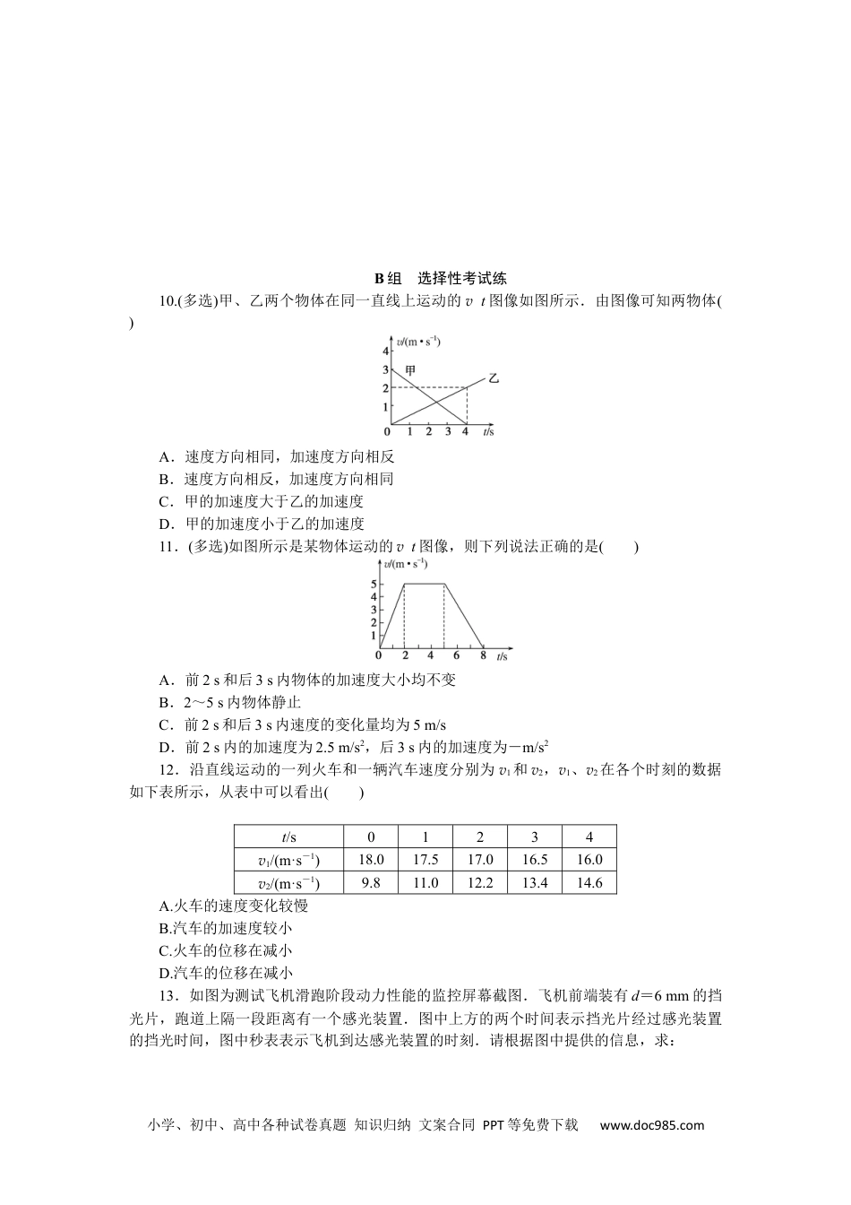 小学、初中、高中各种试卷真题知识归纳文案合同PPT等免费下载www.doc985.com课时素养评价4速度变化的快慢与方向——加速度A组合格性考试练1.关于加速度a的方向,下列说法正确的是()A.由a=可知,加速度a的方向与速度增量Δv的方向可能相反B.加速度a的方向与初速度v0的方向相同C.如果物体的加速度a的方向与初速度v0的方向相同,则物体做加速运动D.只要加速度a>0,物体就做加速运动2.一物体自原点开始在x轴上运动,其初速度v0<0,加速度a<0,若加速度不断减小直至为零,则()A.物体的速度不断减小,位移不断减小B.物体的速度不断增大,位移不断减小C.当a=0时,速度达到最大D.当a=0时,速度达到最大,位移达到最大3.新型冠状病毒感染的肺炎疫情发生以来,全国人民同舟共济、众志成城,打响了一场没有硝烟的疫情阻击战.如果将“总确诊病例人数的增加”类比成运动学中的“加速”将“总确诊病例人数的减少”类比成运动学中的“减速”,将增加和减少快慢类比成“加速度”,据此,“确诊人数增加出现减缓趋势”可以类比成运动学中的()A.速度增大,加速度减小B.速度增大,加速度增大C.速度减小,加速度增大D.速度减小,加速度减小4.小球以v1=3m/s的速度水平向右运动,碰到墙壁经Δt=0.01s后以v2=2m/s的速度沿同一直线反向弹回,如图所示.小球在这0.01s内的平均加速度的大小和方向()A.100m/s2,方向水平向右B.100m/s2,方向水平向左C.500m/s2,方向水平向左D.500m/s2,方向水平向右5.一辆汽车正在公路中行驶,关于汽车的运动,下列说法正确的是()A.汽车运动的速度改变量越大,加速度一定越大B.速度很大的汽车,其加速度可能很小,但不能为零C.汽车加速度很大时,其速度一定很大D.某时刻汽车速度为零,其加速度可能很大小学、初中、高中各种试卷真题知识归纳文案合同PPT等免费下载www.doc985.com6.乒乓球被称为中国的国球,在历次国际性的比赛中,中国队都取得了非常好的成绩.假设在某些比赛中,中国选手接住了对手打来的速度大小为30m/s的乒乓球,并将球以45m/s的速度反向扣杀,从接住到扣杀历时0.15s,则乒乓球在被扣杀时平均加速度大小为()A.50m/s2B.100m/s2C.250m/s2D.500m/s27.如图所示为某物体做直线运动的vt图像,关于物体在前5s的运动情况,下列说法正确的是()A.物体的运动方向没有发生改变B.物体运动的加速度大小不变,但方向发生了改变C.物体在前2s内做加速运动D.物体在后3s内做加速运动8.物体沿一条东西方向的水平线做直线运动,取向东为运动的正方向,其速度—时间图像如图所示,下列说法中正确的是()A.在1s末,速度为8m/sB.0~2s内,加速度为6m/s2C.6~7s内,做速度方向向西的加速运动D.10~12s内,做速度方向向东的加速运动9.篮球以6m/s的速度竖直向下碰撞地面,然后以4m/s的速度竖直向上反弹,碰地的时间为0.2s.(1)求篮球在这0.2s内速度的变化量Δv;(2)篮球在这0.2s内的加速度a==m/s2=-10m/s2.他的方法对吗?为什么?正确的方法如何?小学、初中、高中各种试卷真题知识归纳文案合同PPT等免费下载www.doc985.comB组选择性考试练10.(多选)甲、乙两个物体在同一直线上运动的vt图像如图所示.由图像可知两物体()A.速度方向相同,加速度方向相反B.速度方向相反,加速度方向相同C.甲的加速度大于乙的加速度D.甲的加速度小于乙的加速度11.(多选)如图所示是某物体运动的vt图像,则下列说法正确的是()A.前2s和后3s内物体的加速度大小均不变B.2~5s内物体静止C.前2s和后3s内速度的变化量均为5m/sD.前2s内的加速度为2.5m/s2,后3s内的加速度为-m/s212.沿直线运动的一列火车和一辆汽车速度分别为v1和v2,v1、v2在各个时刻的数据如下表所示,从表中可以看出()t/s01234v1/(m·s-1)18.017.517.016.516.0v2/(m·s-1)9.811.012.213.414.6A.火车的速度变化较慢B.汽车的加速度较小C.火车的位移在减小D.汽车的位移在减小13.如图为测试飞机滑跑阶段动力性能的监控屏幕截图.飞机前端装有d=6mm的挡光片,跑道上隔一段距离有一个感光装置.图中上方的两个时间表示挡光片经过感光装置的挡光时间,图中秒表表示飞机到达感光装置的时...