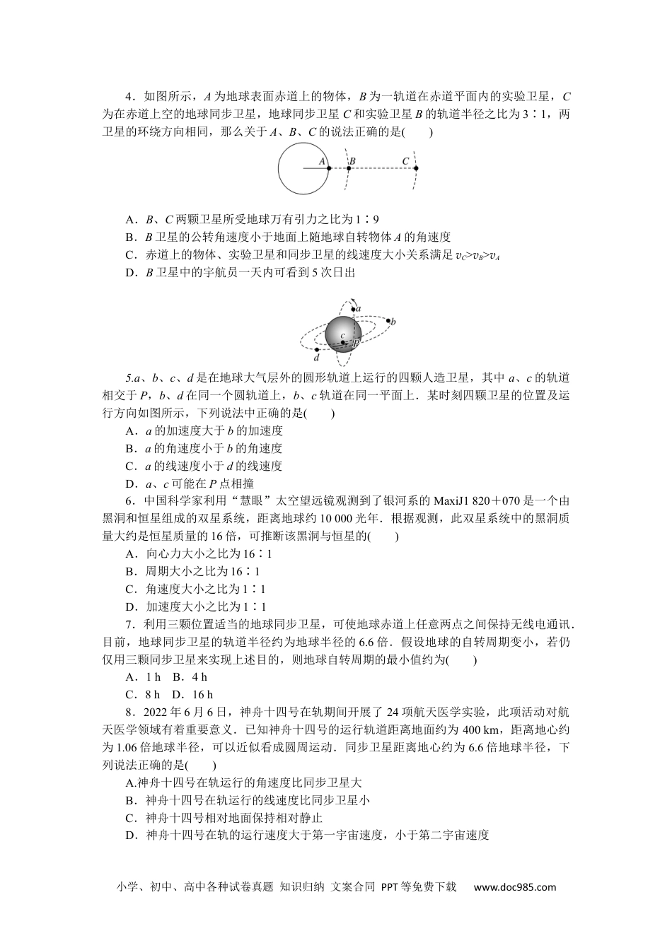 小学、初中、高中各种试卷真题知识归纳文案合同PPT等免费下载www.doc985.com课时素养评价11人造卫星宇宙速度A组合格性考试练1.月球表面处的重力加速度是地球表面处的重力加速度的,月球半径为地球半径的,则登月舱靠近月球表面的环绕速度与地球的第一宇宙速度之比为()A.B.C.D.2.北斗卫星导航系统是中国自行研制的全球卫星定位、通信与导航系统.北斗三号全球系统空间段由30颗组网卫星组成,包括MBO卫星(中圆轨道卫星)、GEO卫星(地球同步轨道卫星)和IGSO卫星(倾斜地球同步轨道卫星)三种不同类型的卫星.其中中圆轨道卫星运行在3个互成120°的轨道面上,离地高度约2.15×104km;地球同步轨道卫星运行在地球同步轨道,离地高度约3.6×104km;倾斜地球同步轨道卫星的轨道平面与赤道平面有一定的夹角,距地高度与地球同步轨道卫星相同,如图所示.假设所有北斗卫星均绕地球做匀速圆周运动.北斗三号GEO2是一颗地球同步轨道卫星,关于这颗卫星,以下说法正确的是()A.该卫星能定点在北京上空B.该卫星的运行周期约为24hC.该卫星绕地运行时处于平衡状态D.该卫星的运行速度大于第一宇宙速度3.如图所示,是在同一轨道平面上的三颗质量相同的人造地球卫星,均绕地球做匀速圆周运动.关于各物理量的关系,下列说法不正确的是()A.速度vA>vB>vCB.周期TA>TB>TCC.向心加速度aA>aB>aCD.角速度ωA>ωB>ωC小学、初中、高中各种试卷真题知识归纳文案合同PPT等免费下载www.doc985.com4.如图所示,A为地球表面赤道上的物体,B为一轨道在赤道平面内的实验卫星,C为在赤道上空的地球同步卫星,地球同步卫星C和实验卫星B的轨道半径之比为3∶1,两卫星的环绕方向相同,那么关于A、B、C的说法正确的是()A.B、C两颗卫星所受地球万有引力之比为1∶9B.B卫星的公转角速度小于地面上随地球自转物体A的角速度C.赤道上的物体、实验卫星和同步卫星的线速度大小关系满足vC>vB>vAD.B卫星中的宇航员一天内可看到5次日出5.a、b、c、d是在地球大气层外的圆形轨道上运行的四颗人造卫星,其中a、c的轨道相交于P,b、d在同一个圆轨道上,b、c轨道在同一平面上.某时刻四颗卫星的位置及运行方向如图所示,下列说法中正确的是()A.a的加速度大于b的加速度B.a的角速度小于b的角速度C.a的线速度小于d的线速度D.a、c可能在P点相撞6.中国科学家利用“慧眼”太空望远镜观测到了银河系的MaxiJ1820+070是一个由黑洞和恒星组成的双星系统,距离地球约10000光年.根据观测,此双星系统中的黑洞质量大约是恒星质量的16倍,可推断该黑洞与恒星的()A.向心力大小之比为16∶1B.周期大小之比为16∶1C.角速度大小之比为1∶1D.加速度大小之比为1∶17.利用三颗位置适当的地球同步卫星,可使地球赤道上任意两点之间保持无线电通讯.目前,地球同步卫星的轨道半径约为地球半径的6.6倍.假设地球的自转周期变小,若仍仅用三颗同步卫星来实现上述目的,则地球自转周期的最小值约为()A.1hB.4hC.8hD.16h8.2022年6月6日,神舟十四号在轨期间开展了24项航天医学实验,此项活动对航天医学领域有着重要意义.已知神舟十四号的运行轨道距离地面约为400km,距离地心约为1.06倍地球半径,可以近似看成圆周运动.同步卫星距离地心约为6.6倍地球半径,下列说法正确的是()A.神舟十四号在轨运行的角速度比同步卫星大B.神舟十四号在轨运行的线速度比同步卫星小C.神舟十四号相对地面保持相对静止D.神舟十四号在轨的运行速度大于第一宇宙速度,小于第二宇宙速度小学、初中、高中各种试卷真题知识归纳文案合同PPT等免费下载www.doc985.comB组选择性考试练9.如图所示,甲、乙是地球的两颗卫星的轨道,若两卫星一颗是月球、一颗是地球同步卫星,下列说法正确的是(已知月球公转周期为27.3d)()A.甲为月球轨道,乙为同步卫星轨道B.月球的向心加速度大于同步卫星的向心加速度C.在地面附近发射同步卫星的速度小于11.2km/sD.月球和同步卫星绕地球运行的线速度大小均大于7.9km/s10.(多选)已知火星的直径约是地球的一半,质量约为地球质量的,表面积相当于地球陆地面积,自转周期与地球十分接近,到太阳的距离约是日地距离的1.5倍.根据...