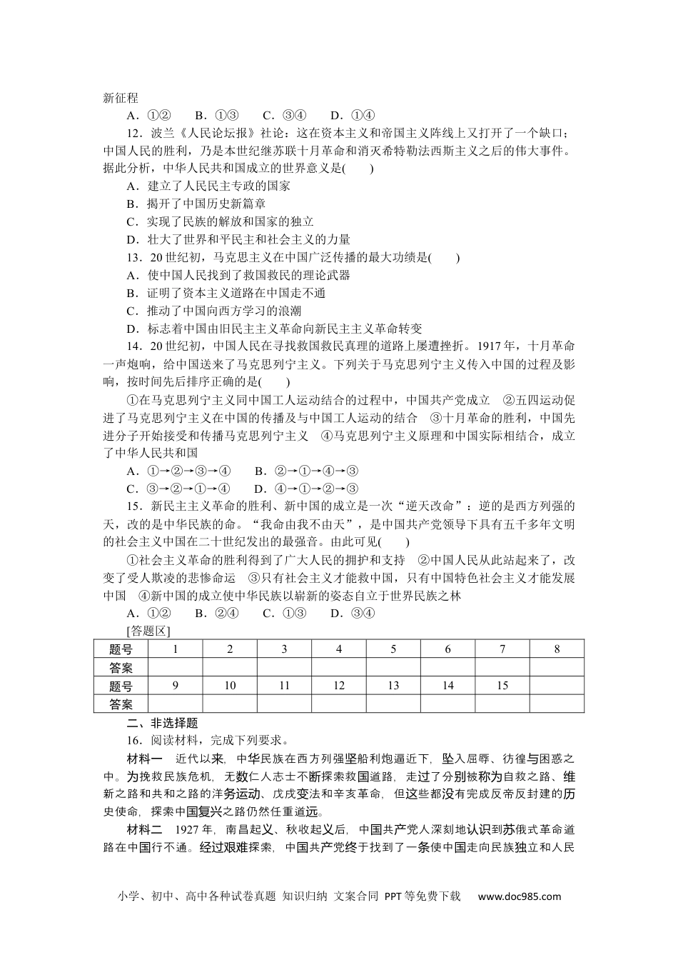 小学、初中、高中各种试卷真题知识归纳文案合同PPT等免费下载www.doc985.com课时作业4新民主主义革命的胜利一、选择题1.[2023·泰安高一检测]鸦片战争前后我国政治经济情况变化如下表所示:时间政治上经济上鸦片战争前中国是一个独立自主的封建国家中国是一个自给自足的封建经济占统治地位的国家鸦片战争后通过不平等条约,中国的领土、领海、司法、关税、贸易等主权开始遭到严重的破坏西方资本主义国家逐渐把中国市场卷入资本主义世界市场,中国自给自足的封建经济逐步解体据此可以推断()①鸦片战争后,中国逐步成为半殖民地半封建社会②鸦片战争是中国历史的转折点,是中国近代史的开端③鸦片战争标志着中国完全沦为半殖民地半封建社会④实现国家富强是当时中国人民必须完成的首要任务A.①②B.①③C.②④D.③④2.十月革命前,中国的先进分子已经意识到中国原有的封建专制制度太陈旧,应当用新制度取而代之,并试图通过走西方资本主义道路来拯救中国,但现实却证明,这条道路在中国行不通。其决定性因素是()A.工人阶级还比较年轻B.缺乏先进政党的领导C.近代中国的基本国情D.民族资产阶级的妥协3.辛亥革命是一次伟大的反帝反封建的资产阶级民主革命,它推翻了清朝的统治,结束了两千多年的封建帝制,但终究未能改变旧中国的社会性质和中国人民的悲惨命运。下列对辛亥革命认识正确的是()①它是中国旧民主主义革命走向新民主主义革命的转折点②它是一场无产阶级领导的资产阶级民主革命③它未能改变中国命运说明实现民族独立需要另辟新路④它是近代中国探索复兴之路的一次有益尝试A.①②B.①③C.②④D.③④4.董必武曾是同盟会会员,他回忆说,我们过去和孙中山一起搞革命,革命发展了,孙中山掌握不住,结果叫别人搞去了,于是我们就研究俄国的方式。这从一个侧面表明,革命要取得成功应()①找到革命主心骨②寻求正确的革命道路③明确革命对象④成立资产阶级政党A.①②B.②③C.③④D.①④5.屈辱的岁月,艰辛的探索,反复证实了一个结论:在半殖民地半封建的近代中国,资本主义道路行不通。为了实现民族独立、人民解放,为了实现国家富强、人民幸福,必须另辟新路。这条新路()①是新民主主义革命道路②确立了社会主义制度③主要反对官僚资本主义④是由无产阶级领导的道路A.①②B.②③C.①④D.③④小学、初中、高中各种试卷真题知识归纳文案合同PPT等免费下载www.doc985.com6.鲁迅曾这样咏赞党的诞生:“它是远方地平线上已经看得见桅杆的那一航轮船,是挣脱母腹的婴儿的第一声啼哭,是林中的响箭,是报春的惊雷。”中国共产党的诞生,成为中国历史上开天辟地的大事变,从此中国革命面貌焕然一新。下列对此说法正确的是()①中国革命有了坚强的领导核心,中国人民有了主心骨②中国共产党领导人民经过28年奋战,完成了社会主义革命并建立了中华人民共和国③中国共产党领导中国人民找到了一条正确的革命道路④中国共产党的诞生标志着中国由新民主主义革命向社会主义革命的转变A.①②B.①③C.②④D.③④7.[2023·坊高一潍检测]人民英雄纪念碑文:“三十年以来,在人民解放战争和人民革命中牺牲的人民英雄们永垂不朽!”碑文中的“人民革命”是指新民主主义革命。我国新民主主义革命与旧民主主义革命相比,下列说法中正确的是()①两者所属的革命范畴和结果相同②两者的革命任务和革命前途相同③两者最具决定意义的革命领导权不同④两者所处的基本国情和社会性质相同A.①②B.①③C.②④D.③④8.[2023·浙江名校盟月考联]自从有了中国共产党,中国的革命面貌焕然一新。这里的“新”主要表现在()①中国革命有了马克思列宁主义这一指导思想②中国革命有了坚强的领导核心,有了主心骨③中国实现了从封建制向社会主义制度的转变④中国共产党领导人民建立起了社会主义制度A.①②B.①③C.②③D.②④9.[2023·高一青岛检测]油画作品《启航——中共一大会议》采用写实主义手法,再现了中共一大南湖会议登船启航的历史瞬间。这里的“启航”告诉我们()①中国的革命面貌从此焕然一新②中国人民的斗争从此有了主心骨③中国工人阶级从此成为新民主主义革命的领导力...