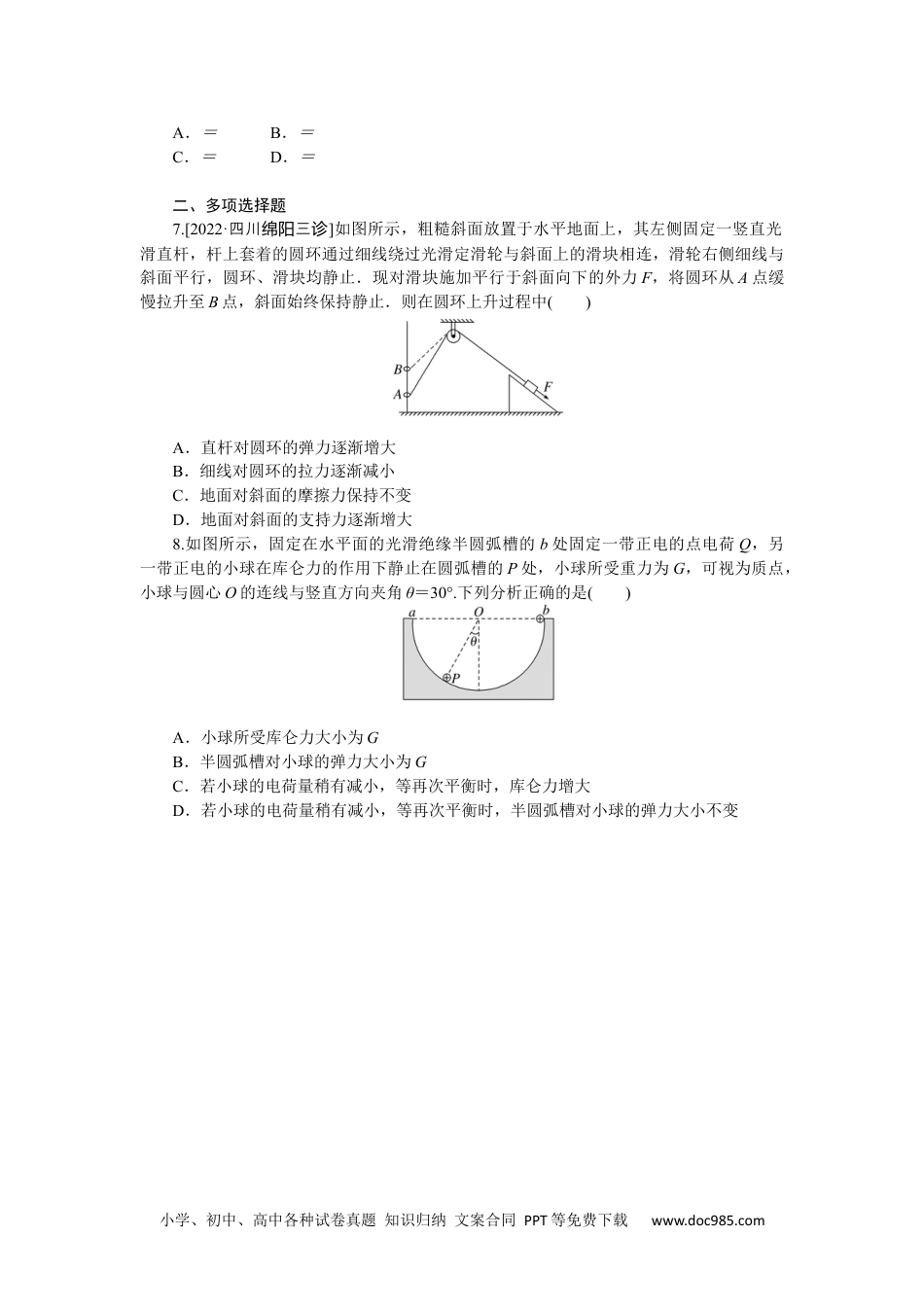 小学、初中、高中各种试卷真题知识归纳文案合同PPT等免费下载www.doc985.com专项2力与物体的平衡一、单项选择题1.[2022·北京昌平川校高三考临学联]如图所示,质量为m的木块,被水平力F紧压在倾角为θ=60°的墙面上处于静止状态.则关于木块的受力情况、墙面对木块的作用力(压力与摩擦力的合力),下列说法正确的是()A.墙面对木块不一定有压力B.墙面对木块一定没有摩擦力C.墙面对木块的作用力大小为FD.墙面对木块的作用力大小为2.[2022·湖南卷]如图(a),直导线MN被两等长且平行的绝缘轻绳悬挂于水平轴OO′上,其所在区域存在方向垂直指向OO′的磁场,与OO′距离相等位置的磁感应强度大小相等且不随时间变化,其截面图如图(b)所示.导线通以电流I,静止后,悬线偏离竖直方向的夹角为θ.下列说法正确的是()A.当导线静止在图(a)右侧位置时,导线中电流方向由N指向MB.电流I增大,静止后,导线对悬线的拉力不变C.tanθ与电流I成正比D.sinθ与电流I成正比3.[2022·安徽宁怀4月月考]三个完全相同的横截面为正方形的工件1、2、3平行堆放,其中2、3放在水平地面上,1叠放在2、3上,其侧视面如图所示,1侧视面的对角线AB恰好竖直,工件间的摩擦忽略不计,此时系统处于静止状态.现同时向外缓慢移动2和3一小段相同距离,系统再次平衡后1仍叠放在2、3上,下列说法正确的是()A.1对2的压力变大B.1对2的压力变小C.2对地面的压力变大小学、初中、高中各种试卷真题知识归纳文案合同PPT等免费下载www.doc985.comD.2对地面的摩擦力不变4.[2022·全冲刺卷国]如图所示,一根长为L的金属细杆通有电流I时,水平静止在倾角为θ的光滑绝缘固定斜面上,空间存在方向竖直向上、磁感应强度大小为B的匀强磁场.若电流和磁场的方向均不变,仅将磁感应强度大小变为4B,重力加速度为g,则此时()A.金属细杆中的电流方向垂直于纸面向外B.金属细杆受到的安培力大小为4ILBsinθC.金属细杆对斜面的压力大小变为原来的4倍D.金属细杆将沿斜面加速向上运动,加速度大小为3gsinθ5.如图所示的装置,杆OQ沿竖直方向固定,且顶端有一光滑的定滑轮,轻杆OP用铰链固定于O点且可绕O点转动,用两根轻绳分别拴接质量为m1、m2的小球并系于P点,其中拴接质量为m1的小球的轻绳跨过定滑轮,已知O点到滑轮顶端Q的距离等于OP,当系统平衡时两杆的夹角为α=120°.则m1∶m2为()A.1∶2B.∶2C.∶1D.1∶16.[2022·安徽合肥市4月模拟]研究表明,风力的大小F与风速的大小v、物体的横截面积S以及物体的形状有关,对于形状相同的物体,风力F=kSv(k是比例系数).某物理兴趣小组想测量风速的大小,将半径为r、质量均匀分布的实心塑料球用不可伸长的轻质细线固定在水平墙面上,如图所示,风水平吹来时,若风速为v1,塑料球平衡时细线与墙面的夹角为α;若风速为v2,选用半径为2r的相同材料的塑料球,平衡时细线与墙面的夹角为β.下列关系式正确的是()小学、初中、高中各种试卷真题知识归纳文案合同PPT等免费下载www.doc985.comA.=B.=C.=D.=二、多项选择题7.[2022·四川三绵阳诊]如图所示,粗糙斜面放置于水平地面上,其左侧固定一竖直光滑直杆,杆上套着的圆环通过细线绕过光滑定滑轮与斜面上的滑块相连,滑轮右侧细线与斜面平行,圆环、滑块均静止.现对滑块施加平行于斜面向下的外力F,将圆环从A点缓慢拉升至B点,斜面始终保持静止.则在圆环上升过程中()A.直杆对圆环的弹力逐渐增大B.细线对圆环的拉力逐渐减小C.地面对斜面的摩擦力保持不变D.地面对斜面的支持力逐渐增大8.如图所示,固定在水平面的光滑绝缘半圆弧槽的b处固定一带正电的点电荷Q,另一带正电的小球在库仑力的作用下静止在圆弧槽的P处,小球所受重力为G,可视为质点,小球与圆心O的连线与竖直方向夹角θ=30°.下列分析正确的是()A.小球所受库仑力大小为GB.半圆弧槽对小球的弹力大小为GC.若小球的电荷量稍有减小,等再次平衡时,库仑力增大D.若小球的电荷量稍有减小,等再次平衡时,半圆弧槽对小球的弹力大小不变