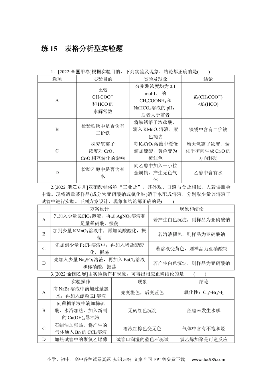 小学、初中、高中各种试卷真题知识归纳文案合同PPT等免费下载www.doc985.com练15表格分析型实验题1.[2022·全甲卷国]根据实验目的,下列实验及现象、结论都正确的是()选项实验目的实验及现象结论A比较CH3COO-和HCO的水解常数分别测浓度均为0.1mol·L-1的CH3COONH4和NaHCO3溶液的pH,后者大于前者Kh(CH3COO-)<Kh(HCO)B检验铁锈中是否含有二价铁将铁锈溶于浓盐酸,滴入KMnO4溶液。紫色褪去铁锈中含有二价铁C探究氢离子浓度对CrO、Cr2O相互转化的影响向K2CrO4溶液中缓慢滴加硫酸,黄色变为橙红色增大氢离子浓度,转化平衡向生成Cr2O的方向移动D检验乙醇中是否含有水向乙醇中加入一小粒金属钠,产生无色气体乙醇中含有水2.[2022·浙江6月]亚硝酸钠俗称“工业盐”,其外观、口感与食盐相似,人若误服会中毒。现将适量某样品(成分为亚硝酸钠或氯化钠)溶于水配成溶液,分别取少量该溶液于试管中进行实验。下列方案设计、现象和结论都正确的是()方案设计现象和结论A先加入少量KClO3溶液,再加AgNO3溶液和足量稀硝酸,振荡若产生白色沉淀,则样品为亚硝酸钠B加到少量KMnO4溶液中,再加硫酸酸化,振荡若溶液褪色,则样品为亚硝酸钠C先加到少量FeCl2溶液中,再加入稀盐酸酸化,振荡若溶液变黄色,则样品为亚硝酸钠D先加入少量Na2SO3溶液,再加入BaCl2溶液和稀硝酸,振荡若产生白色沉淀,则样品为亚硝酸钠3.[2022·全乙卷国]由实验操作和现象,可得出相应正确结论的是()实验操作现象结论A向NaBr溶液中滴加过量氯水,再加入淀粉KI溶液先变橙色,后变蓝色氧化性:Cl2>Br2>I2B向蔗糖溶液中滴加稀硫酸,水浴加热,加入新制的Cu(OH)2悬浊液无砖红色沉淀蔗糖未发生水解C石蜡油加强热,将产生的气体通入Br2的CCl4溶液溶液红棕色变无色气体中含有不饱和烃D加热试管中的聚氯乙烯薄试管口润湿的蓝色石蕊试氯乙烯加聚是可逆反应小学、初中、高中各种试卷真题知识归纳文案合同PPT等免费下载www.doc985.com膜碎片纸变红4.[2022·宁卷辽]下列实验能达到目的的是()实验目的实验方法或操作A测定中和反应的反应热酸碱中和滴定的同时,用温度传感器采集锥形瓶内溶液的温度B探究浓度对化学反应速率的影响量取同体积不同浓度的NaClO溶液,分别加入等体积等浓度的Na2SO3溶液,对比现象C判断反应后Ba2+是否沉淀完全将Na2CO3溶液与BaCl2溶液混合,反应后静置,向上层清液中再加1滴Na2CO3溶液D检验淀粉是否发生了水解向淀粉水解液中加入碘水5.[2022·湖南卷]为探究FeCl3的性质,进行了如下实验(FeCl3和Na2SO3溶液浓度均为0.1mol·L-1)。实验操作与现象①在5mL水中滴加2滴FeCl3溶液,呈棕黄色;煮沸,溶液变红褐色。②在5mLFeCl3溶液中滴加2滴Na2SO3溶液,变红褐色;再滴加K3[Fe(CN)6]溶液,产生蓝色沉淀。③在5mLNa2SO3溶液中滴加2滴FeCl3溶液,变红褐色;将上述混合液分成两份,一份滴加K3[Fe(CN)6]溶液,无蓝色沉淀生成;另一份煮沸,产生红褐色沉淀。依据上述实验现象,结论不合理的是()A.实验①说明加热促进Fe3+水解反应B.实验②说明Fe3+既发生了水解反应,又发生了还原反应C.实验③说明Fe3+发生了水解反应,但没有发生还原反应D.整个实验说明SO对Fe3+的水解反应无影响,但对还原反应有影响6.[2021·山卷东](双选)为完成下列各组实验,所选玻璃仪器和试剂均准确、完整的是(不考虑存放试剂的容器)()实验目的玻璃仪器试剂A配制100mL一定物质的量浓度的NaCl溶液100mL容量瓶、胶头滴管、烧杯、量筒、玻璃棒蒸馏水、NaCl固体B制备Fe(OH)3胶体烧杯、酒精灯、胶头滴管蒸馏水、饱和FeCl3溶液C测定NaOH溶液浓度烧杯、锥形瓶、胶头滴管、酸式滴定管待测NaOH溶液、已知浓度的盐酸、甲基橙试剂D制备乙酸乙酯试管、量筒、导管、酒精灯冰醋酸、无水乙醇、饱和Na2CO3溶液7.[2021·宁卷辽]由下列实验操作及现象能得出相应结论的是()实验操作现象结论A向KBr、KI混合溶液中依次加入少量氯水和CCl4,振荡,静置溶液分层,下层呈紫红色氧化性:Cl2>Br2>I2B在火焰上灼烧搅拌过某无色溶液的玻璃棒火焰出现黄色溶液中含Na元素C用pH计测定pH:①NaHCO3溶液②CH3COONa溶液pH:①>②H2CO3酸性弱于CH3COOH小学、初中、高中各...