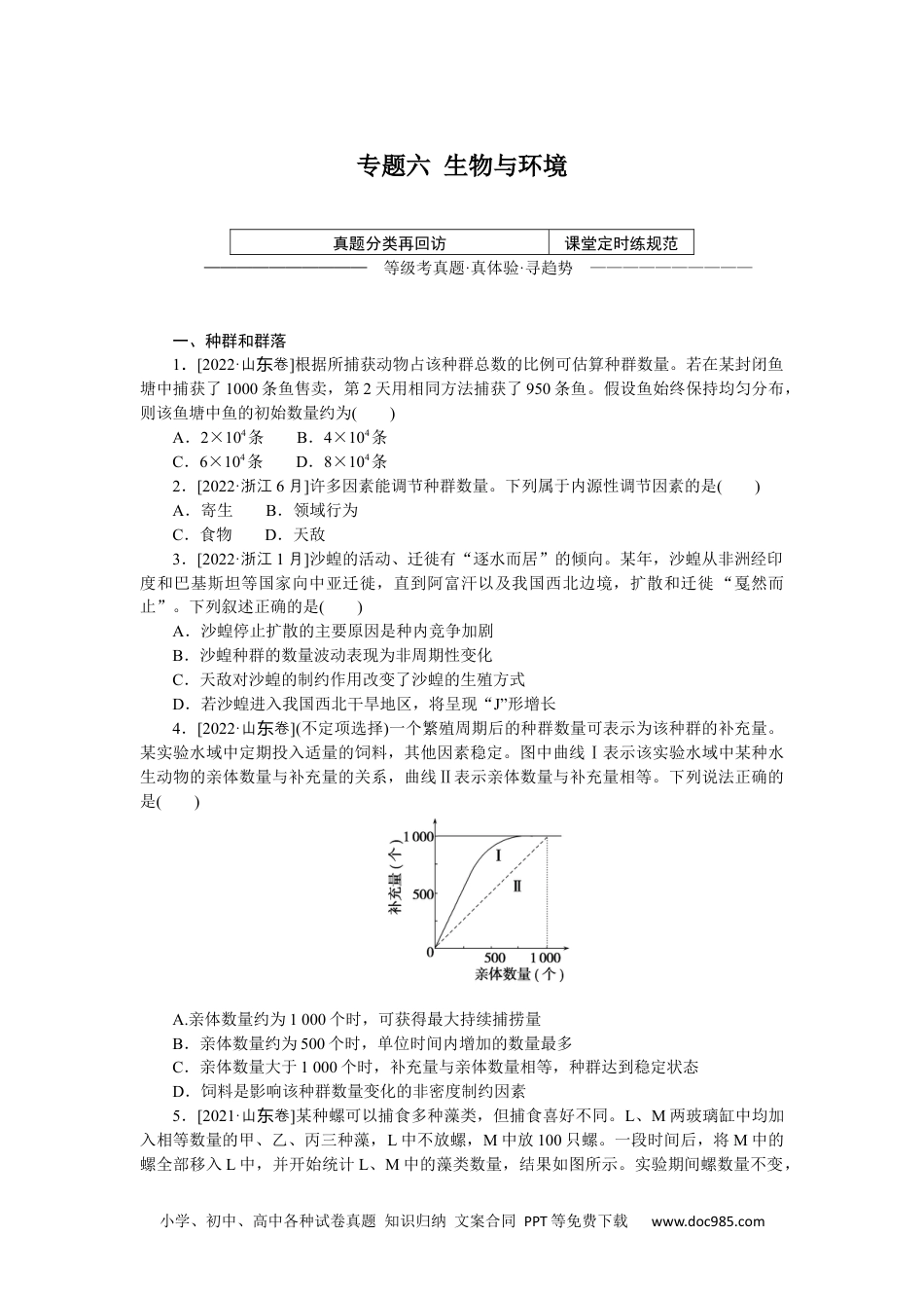 小学、初中、高中各种试卷真题知识归纳文案合同PPT等免费下载www.doc985.com专题六生物与环境真题分类再回访课堂定时练规范——————————等级考真题·真体验·寻趋势——————————一、种群和群落1.[2022·山卷东]根据所捕获动物占该种群总数的比例可估算种群数量。若在某封闭鱼塘中捕获了1000条鱼售卖,第2天用相同方法捕获了950条鱼。假设鱼始终保持均匀分布,则该鱼塘中鱼的初始数量约为()A.2×104条B.4×104条C.6×104条D.8×104条2.[2022·浙江6月]许多因素能调节种群数量。下列属于内源性调节因素的是()A.寄生B.领域行为C.食物D.天敌3.[2022·浙江1月]沙蝗的活动、迁徙有“逐水而居”的倾向。某年,沙蝗从非洲经印度和巴基斯坦等国家向中亚迁徙,直到阿富汗以及我国西北边境,扩散和迁徙“戛然而止”。下列叙述正确的是()A.沙蝗停止扩散的主要原因是种内竞争加剧B.沙蝗种群的数量波动表现为非周期性变化C.天敌对沙蝗的制约作用改变了沙蝗的生殖方式D.若沙蝗进入我国西北干旱地区,将呈现“J”形增长4.[2022·山卷东](不定项选择)一个繁殖周期后的种群数量可表示为该种群的补充量。某实验水域中定期投入适量的饲料,其他因素稳定。图中曲线Ⅰ表示该实验水域中某种水生动物的亲体数量与补充量的关系,曲线Ⅱ表示亲体数量与补充量相等。下列说法正确的是()A.亲体数量约为1000个时,可获得最大持续捕捞量B.亲体数量约为500个时,单位时间内增加的数量最多C.亲体数量大于1000个时,补充量与亲体数量相等,种群达到稳定状态D.饲料是影响该种群数量变化的非密度制约因素5.[2021·山卷东]某种螺可以捕食多种藻类,但捕食喜好不同。L、M两玻璃缸中均加入相等数量的甲、乙、丙三种藻,L中不放螺,M中放100只螺。一段时间后,将M中的螺全部移入L中,并开始统计L、M中的藻类数量,结果如图所示。实验期间螺数量不变,小学、初中、高中各种试卷真题知识归纳文案合同PPT等免费下载www.doc985.com下列说法正确的是()A.螺捕食藻类的喜好为甲藻>乙藻>丙藻B.三种藻的竞争能力为乙藻>甲藻>丙藻C.图示L中使乙藻数量在峰值后下降的主要种间关系是竞争D.甲、乙、丙藻和螺构成一个微型的生态系统6.[2021·山卷东]调查1公顷范围内某种鼠的种群密度时,第一次捕获并标记39只鼠,第二次捕获34只鼠,其中有标记的鼠15只。标记物不影响鼠的生存和活动并可用于探测鼠的状态,若探测到第一次标记的鼠在重捕前有5只由于竞争、天敌等自然因素死亡,但因该段时间内有鼠出生而种群总数量稳定,则该区域该种鼠的实际种群密度最接近于(结果取整数)()A.66只/公顷B.77只/公顷C.83只/公顷D.88只/公顷7.[2021·浙江1月]大约在1800年,绵羊被引入到塔斯马尼亚岛,绵羊种群呈“S”形曲线增长,直到1860年才稳定在170万头左右。下列叙述正确的是()A.绵羊种群数量的变化与环境条件有关,而与出生率、死亡率变动无关B.绵羊种群在达到环境容纳量之前,每单位时间内种群增长的倍数不变C.若绵羊种群密度增大,相应病原微生物的致病力和传播速度减小D.若草的生物量不变而种类发生改变,绵羊种群的环境容纳量可能发生变化8.[2021·广卷东]图示某“S”形增长种群的出生率和死亡率与种群数量的关系。当种群达到环境容纳量(K值)时,其对应的种群数量是()A.aB.bC.cD.d9.[2021·河北卷]烟粉虱为害会造成番茄减产。研究者对番茄单作、番茄玫瑰邻作(番茄田与玫瑰田间隔1m)模式下番茄田中不同发育阶段的烟粉虱及其天敌进行了调查,结果见下表。下列叙述错误的是()A.由单作转为邻作,烟粉虱种群的年龄结构改变B.由单作转为邻作,烟粉虱种群中成虫的空间分布类型改变C.由单作转为邻作,群落的水平结构改变小学、初中、高中各种试卷真题知识归纳文案合同PPT等免费下载www.doc985.comD.玫瑰吸引天敌防治害虫,体现了生态系统信息调节生物种间关系的功能10.[2021·湖南卷]某草原生态系统中植物和食草动物两个种群数量的动态模型如图所示。下列叙述错误的是()A.食草动物进入早期,其种群数量增长大致呈“J”型曲线B.图中a点的纵坐标值代表食草动物的环境容纳量C.该生态系统的相对...
