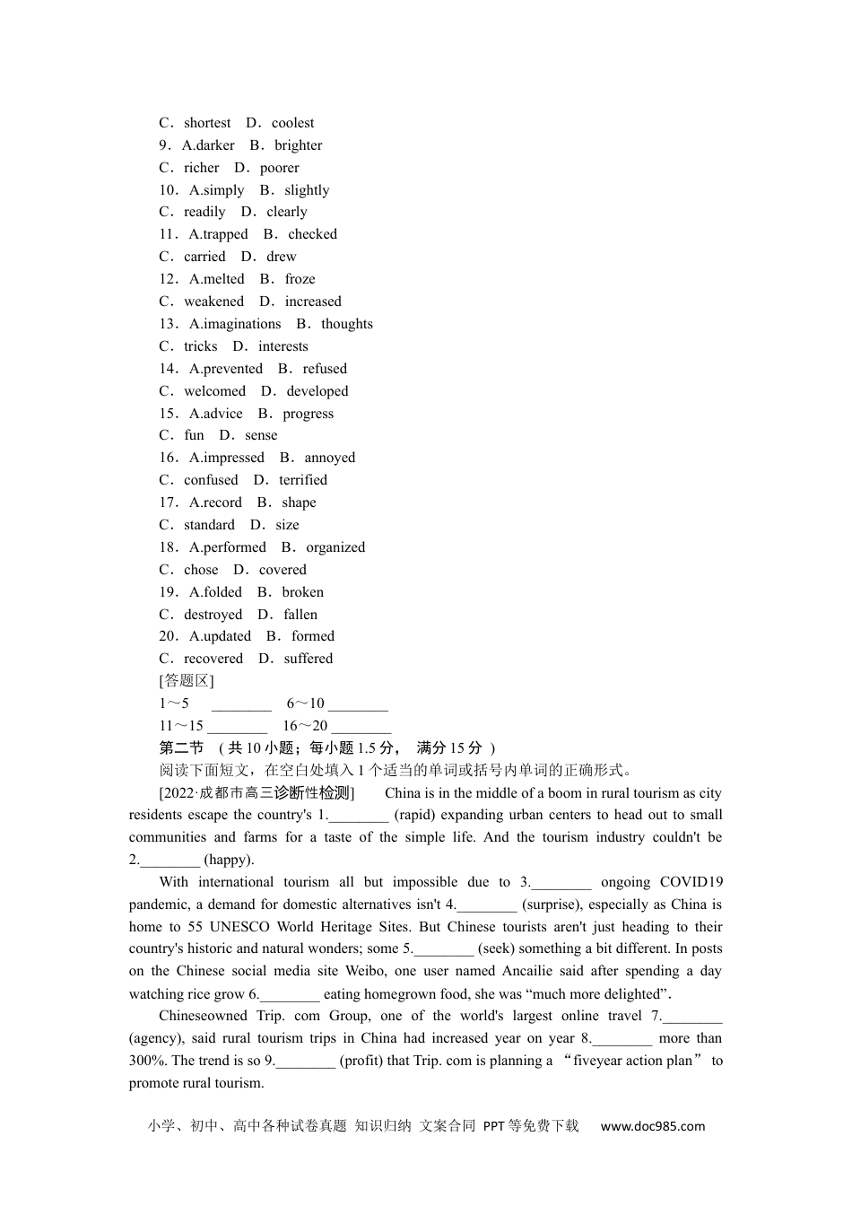 小学、初中、高中各种试卷真题知识归纳文案合同PPT等免费下载www.doc985.com45分语言知识运用练(四)第一节(共20小题;每小题1.5分,满分30分)阅读下面短文,从短文后各题所给的A、B、C和D四个选项中,选出可以填入空白处的最佳选项。[2022·江西省高三量教学质监测]Somepeoplearejustboundtobefailures.That'sthewaysomeadultslookat__1__kids.BillWarewasmadetofeelthiswayinhisschool.Byhighschool,Billwasthemost__2__troublemaker.Heoftengotintolotsof__3__.Teachersdidn'twanttohavehimagainthefollowingyear.Billwasmovingon,but__4__notmovingup.IfirstmetBillataweekendactivity.Allthestudentshadbeen__5__toacommunityprogram,BillWare__6__.WhenI__7__,thecommunityleaderstoldme:“BillWareistheboywiththe__8__arrestrecordinthetown.”Somehow,Iwasn'tthefirsttohearaboutBill's__9__side.Atthebeginning,Billdidn't__10__joininthediscussion.Butslowly,theinteractivegames__11__himin.Theicereally__12__whenthegroupsbuiltalistofthingsthathappenedatschoolthatyear.Billhadsomedefinite__13__.Theotherstudents__14__hiscomments,whichsuddenlymadeBillfeellikepartofthegroup.Hewassayingthingsthatmadealotof__15__.Thenextday,BilljoinedtheHomelessProject.Heknewaboutpovertyandhunger.Theotherstudentswere__16__withhispassionateideas.Twoweekslater,Billledagroupof70studentstocollectfood.Theymadeaschool__17__:2,854cansoffoodinjusttwohours,whichwasenoughfortheneedyfamiliesfor75daysinthearea.Thelocalnewspaper__18__theevent.Thatstoryspreadatschool,whereeveryonecouldseeit.Hewasbeingacknowledged.Abirdwitha__19__wingonlyneedsmending.Once__20__,itcanflyhigher.,1.A.tiredB.troubledC.boredD.excited2.A.importantB.normalC.carelessD.celebrated3.A.quarrelsB.discussionsC.fightsD.debates4.A.surelyB.strangelyC.safelyD.partly5.A.orderedB.invitedC.demandedD.forced6.A.abandonedB.removedC.hiredD.included7.A.caughtupB.heldupC.showedupD.lookedup8.A.easiestB.longest小学、初中、高中各种试卷真题知识归纳文案合同PPT等免费下载www.doc985.comC.shortestD.coolest9.A.darkerB.brighterC.richerD.poorer10.A.simplyB.slightlyC.readilyD.clearly11.A.trappedB.checkedC.carriedD.drew12.A.meltedB.frozeC.weakenedD.increased13.A.imaginationsB.thoughtsC.tricksD.interests14.A.preventedB.refusedC.welcomedD.developed15.A.adviceB.progressC.funD.sense16.A.impressedB.annoyedC.confusedD.terrified17.A.recordB.shapeC.standardD.size18.A.performedB.organizedC.choseD.covered19.A.foldedB.brokenC.destroyedD.fallen20.A.updatedB.formedC.recoveredD.suffered[答题区]1~5________6~10________11~15________16~20________第二节(共10小题;每小题1.5分,满分15分)阅读下面短文,在空白处填入1个适当的单词或括号内单词的正确形式。[2022·成都市高三性诊断检测]Chinaisinthemiddleofaboominruraltourismascityresidentsescapethecountry's1.________(rapid)expandingurbancenterstoheadouttosmallcommunitiesandfarmsforatasteofthesimplelife.Andthetourismindustrycouldn'tbe2.________(happy).Withinternationaltourismallbutimpossibledueto3.________ongoingCOVID19pandemic,ademandfordomesticalternativesisn't4.________(surprise),especiallyasChinaishometo55UNESCOWorldHeritageSites.ButChinesetouristsaren'tjustheadingtotheircountry'shistoricandnaturalwonders;some5.________(seek)somethingabitdifferent.InpostsontheChinesesocialmediasiteWeibo,oneusernamedAncailiesaidafterspendingadaywatchingricegrow6.________eatinghomegrownfood,shewas“muchmoredelighted”.ChineseownedTrip.comGroup,oneoftheworld'slargestonlinetravel7.________(agency),saidruraltourismtripsinChinahadincreasedyearonyear8.________morethan300%.Thetrendisso9.________(profit)thatTrip.comisplanninga“fiveyearactionplan”topromoteruraltourism.小学、初中、高中各种试卷真题知识归纳文案合同PPT等免费下载www.doc985.comZhouMingqi,founderandgeneralmanagerofShanghaiTourGuideEnterpriseManagementConsulting,saidChinesepeopleweregettingtiredoflivesinbigcities.“Thereisaneed10.________(experience)adifferentkindoflifetochangealifestyleontheweekend,”hesaid.1.________2.________3.________4.________5.________6.________7.________8.________9.________10.________小学、初中、高中各种试卷真题知识归纳文案合同PPT等免费下载www.doc985.com