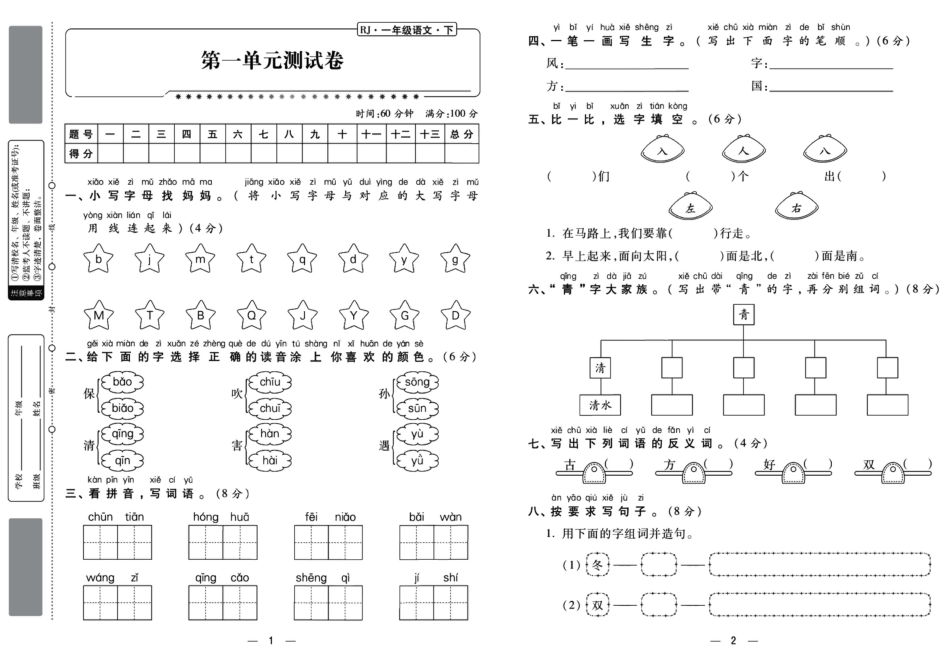 小学一年级语文下册第一单元综合测试卷.doc