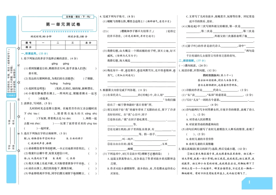小学语文五年级下册统编版五(下)第一单元测试卷.docx