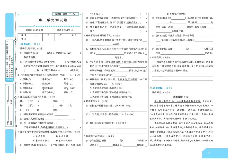 五年级上册语文部编版期末测试卷3(含答案).pdf